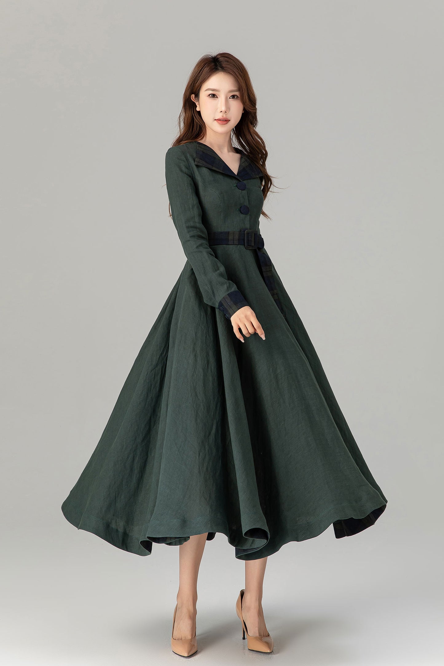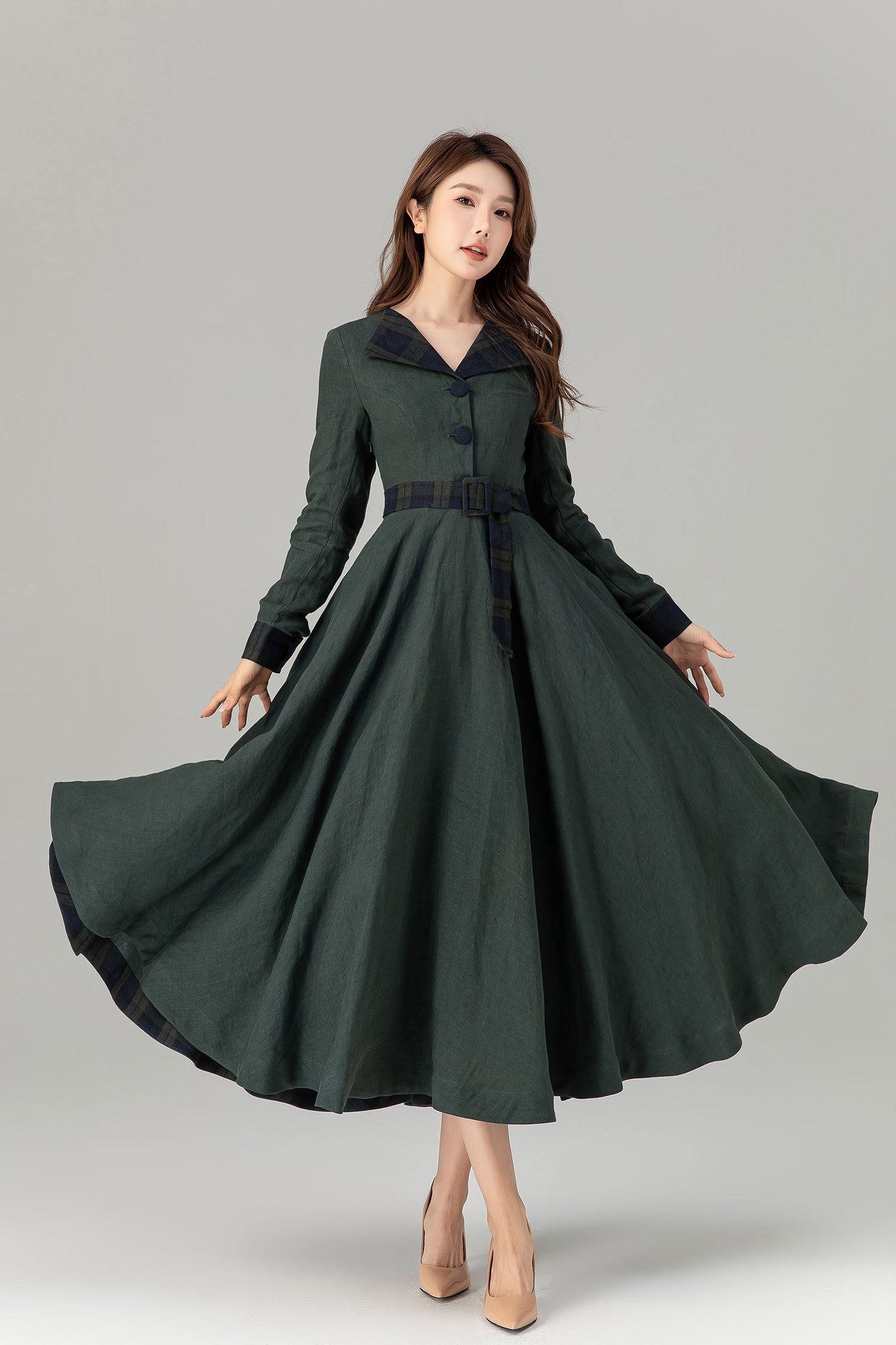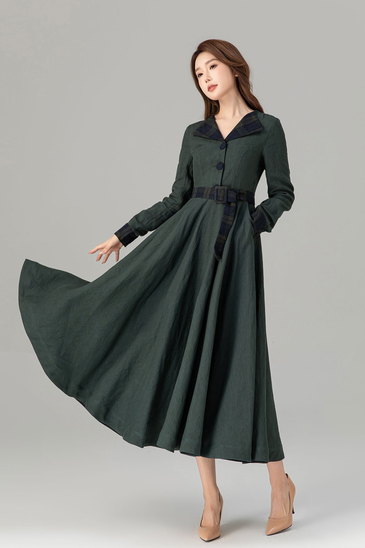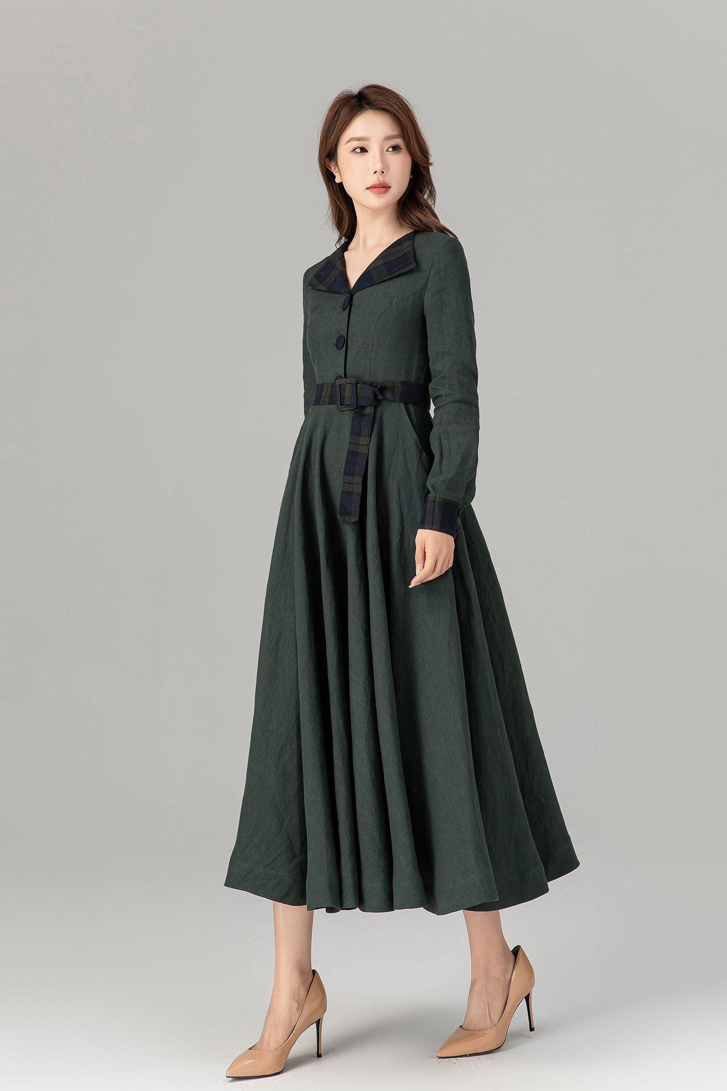 * 100% green linen with plaid belt, collar and sleeve hem