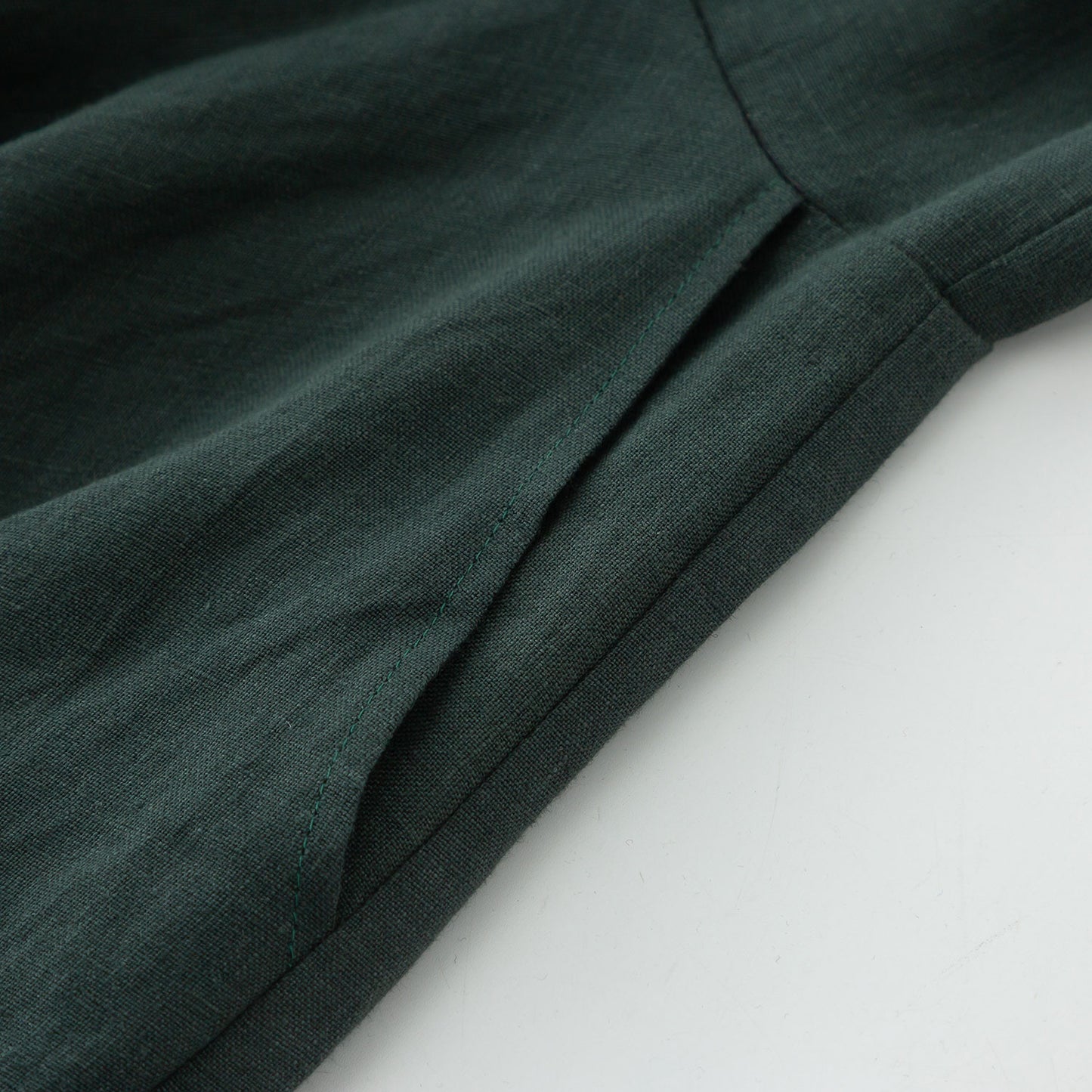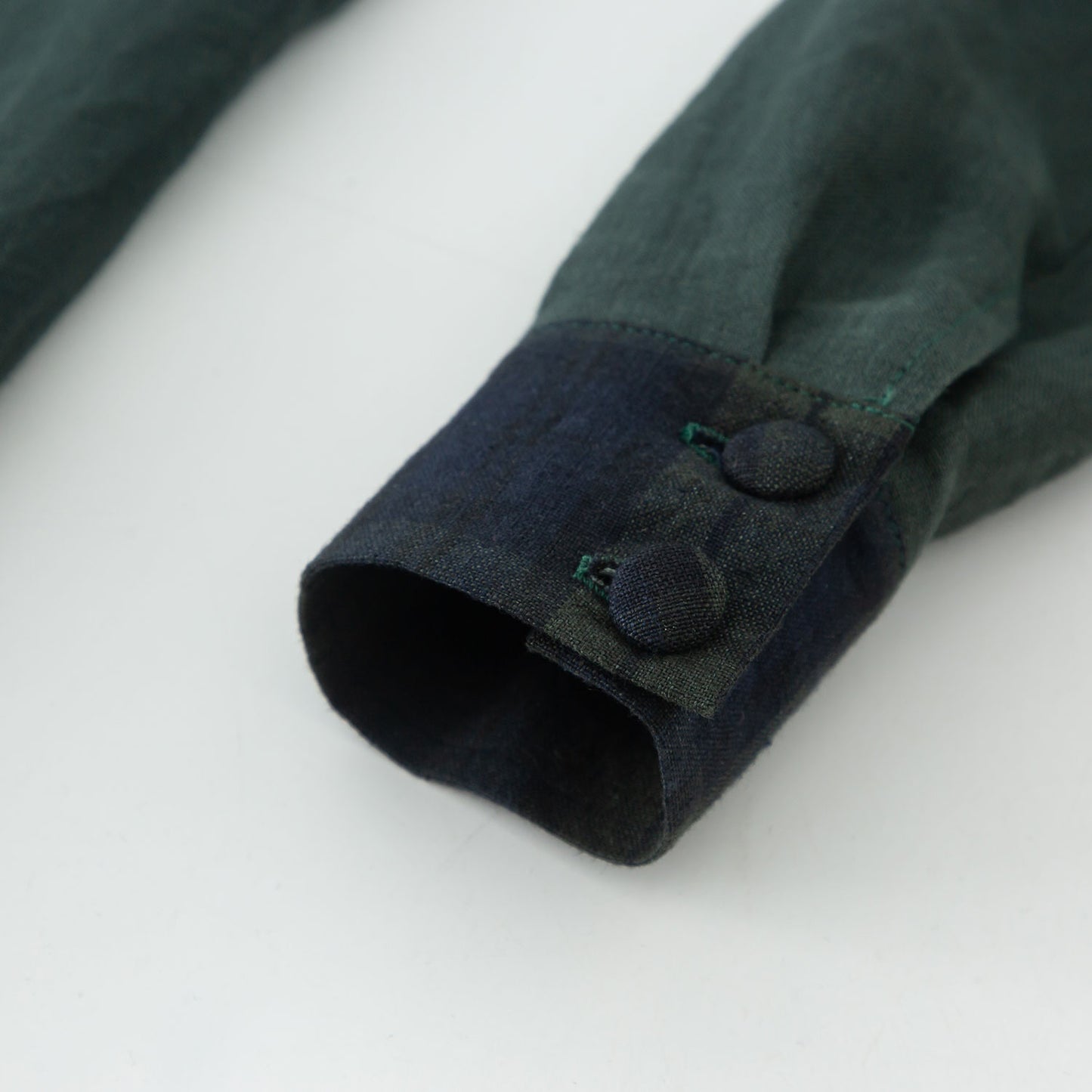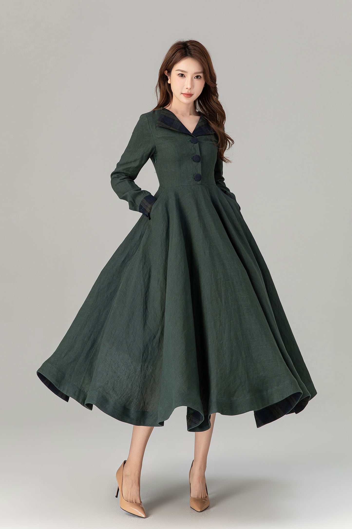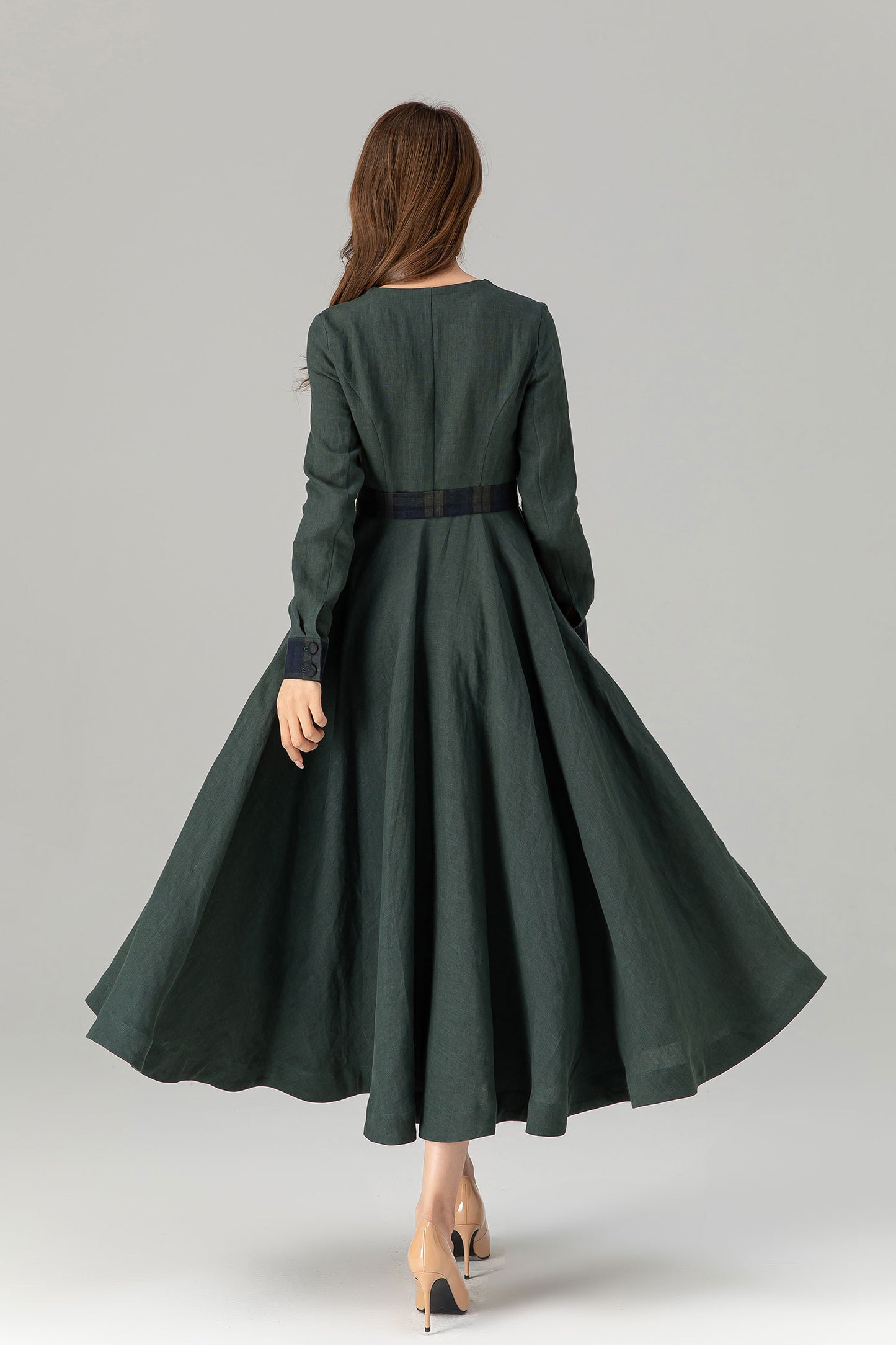 * 100% green linen with plaid belt, collar and sleeve hem