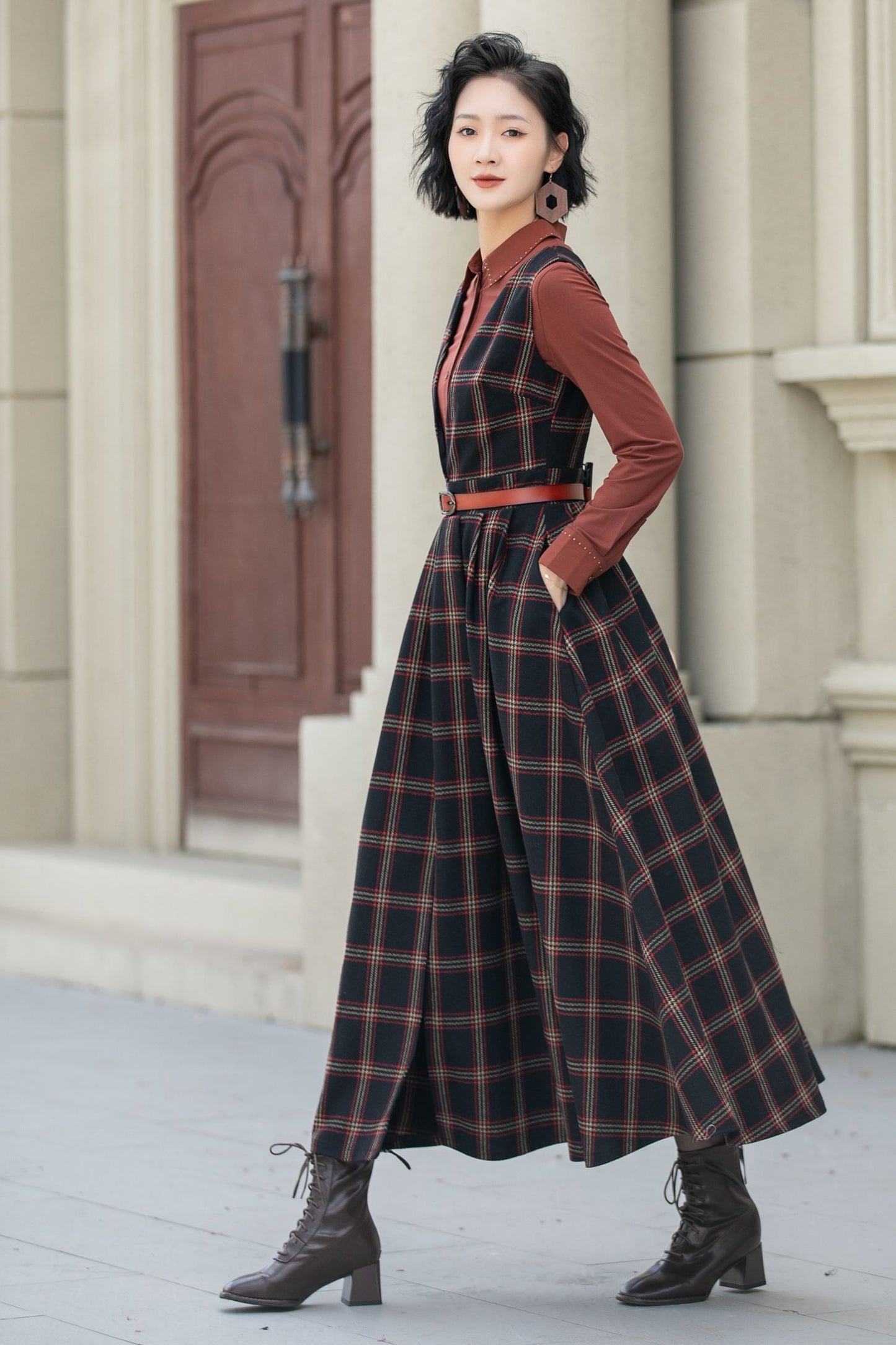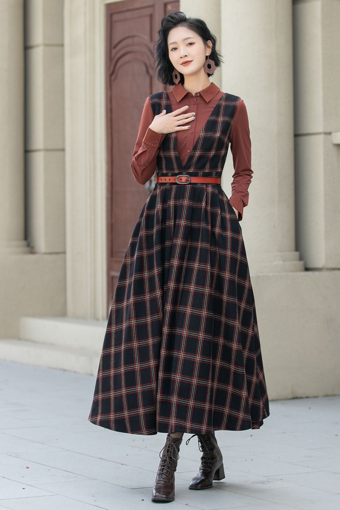 Fit and flare plaid pinafore wool dress women 5354