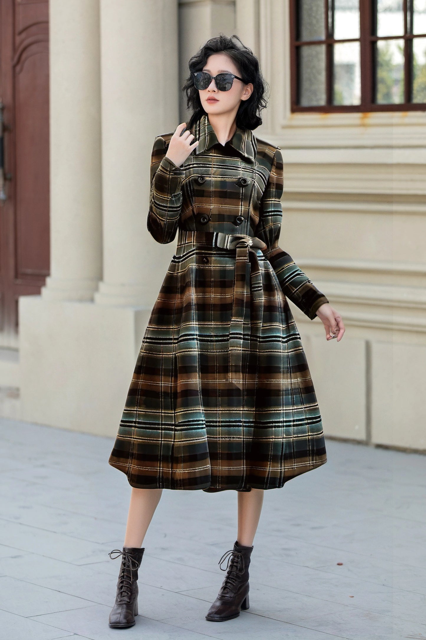 Step into timeless sophistication with this brown plaid wool coat, a vintage-inspired overcoat designed for both elegance and warmth. The flattering fit-and-flare silhouette cinches at the waist with a matching belt, while the rich plaid pattern adds a touch of classic charm. Crafted from a premium wool blend and fully lined for comfort, this coat is the perfect statement piece for autumn and winter styling.