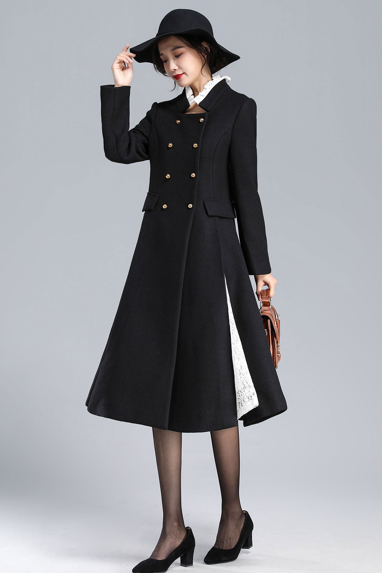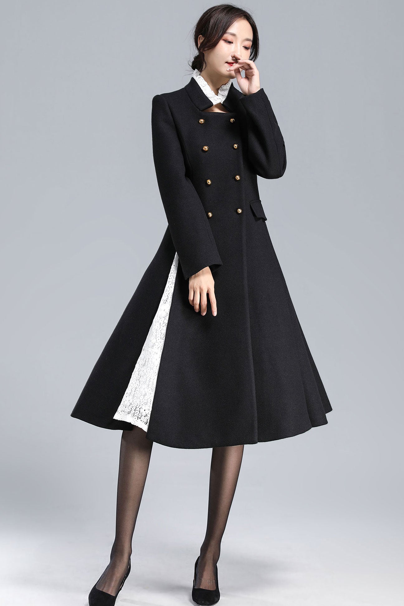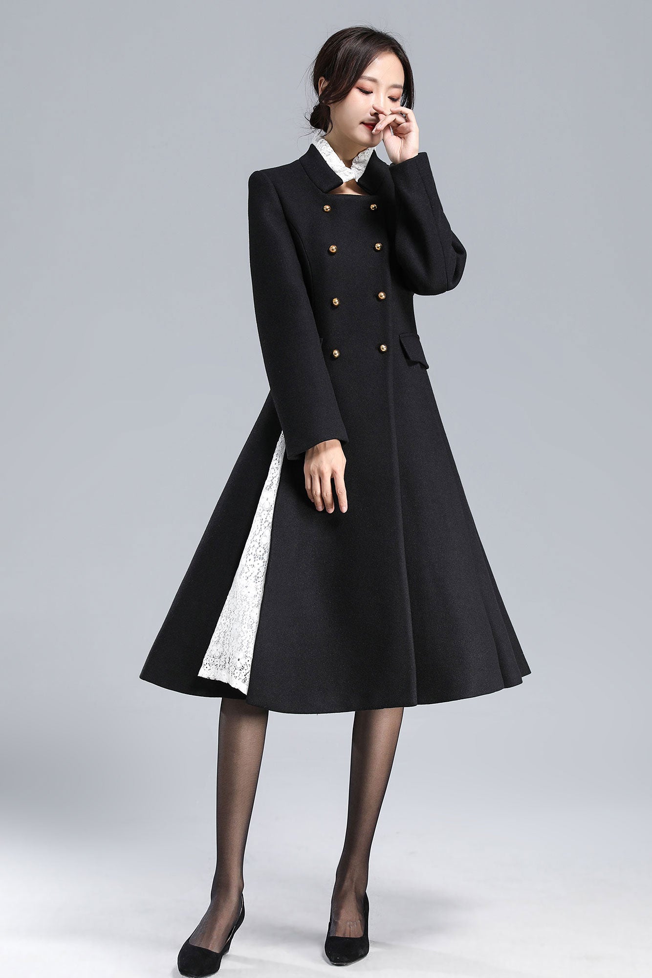 Black Wool Coat Dress – Vintage Double-Breasted Swing Coat with Lace Patchwork 3177