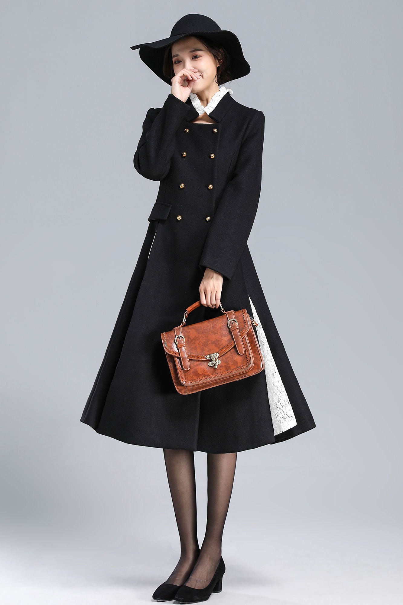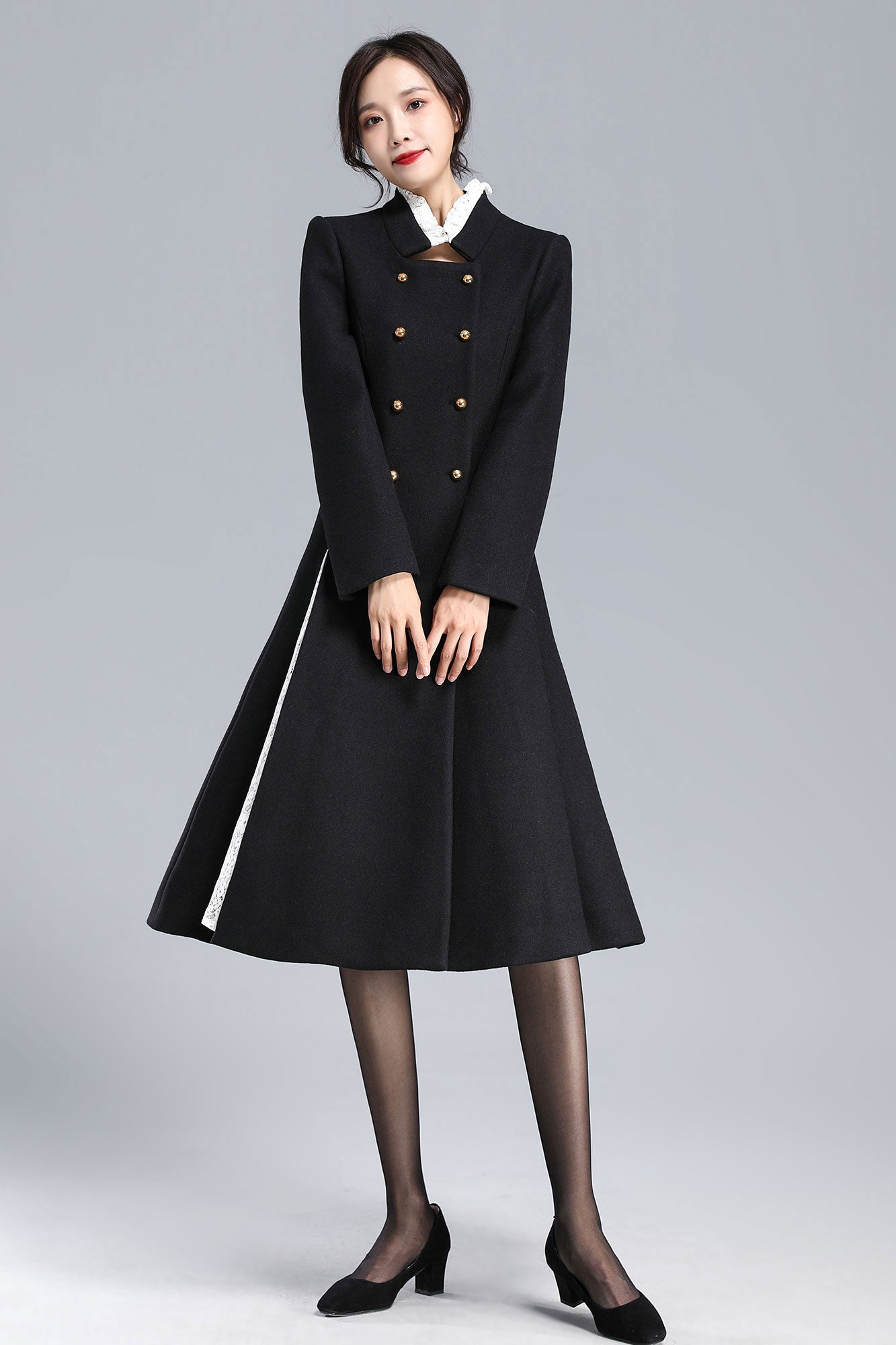 A statement of timeless elegance, this black wool coat dress combines the structure of a tailored overcoat with the grace of a flared skirt. The stand collar is accented with delicate white lace, while lace patchwork at the hem adds a romantic touch. With its double-breasted front and flowing swing silhouette, this coat is perfect for women who embrace vintage-inspired sophistication in autumn and winter.