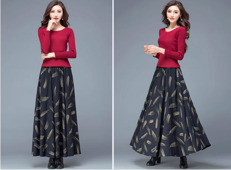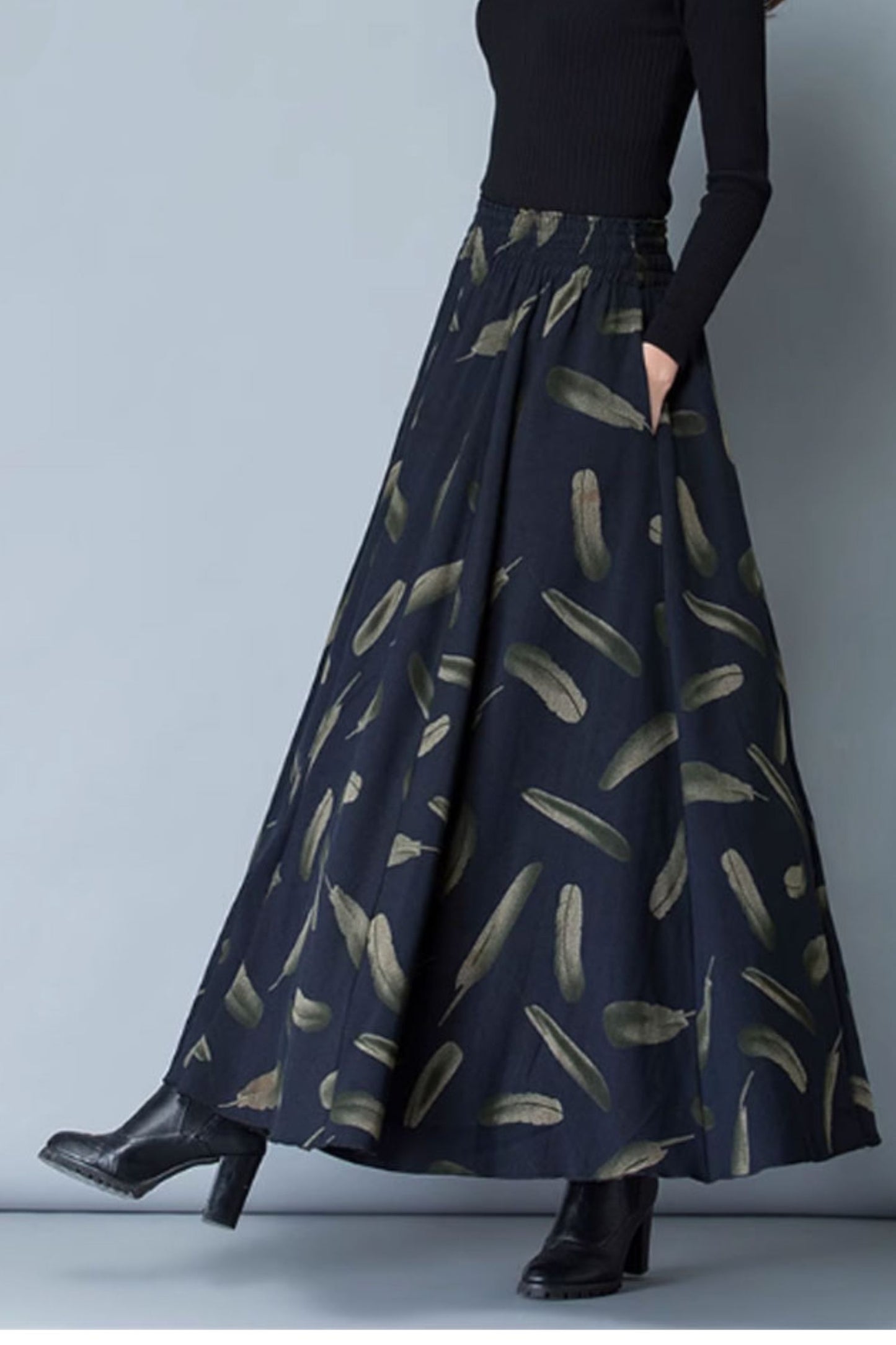 Embrace adventure and stand out from the crowd with our stunning Fit and Flare Winter Long Skirt. Featuring a unique feather print, this skirt is perfect for those who love to take risks and make a statement. Stay warm and fashionable this winter season!