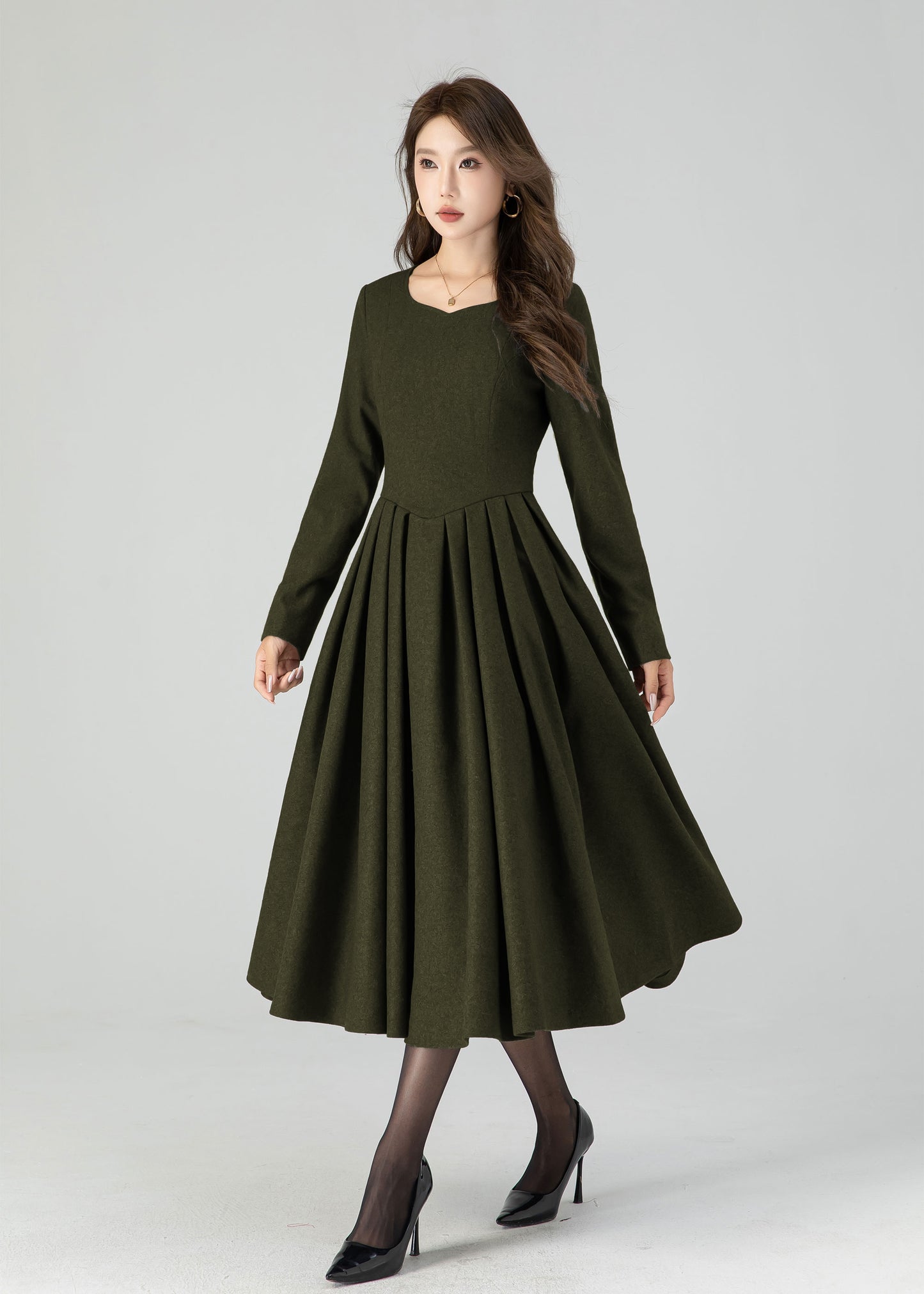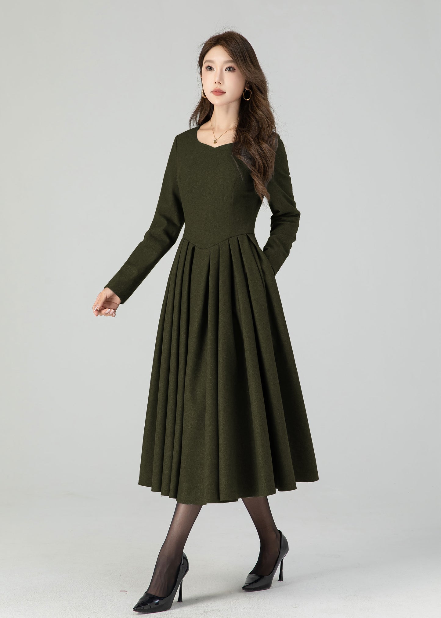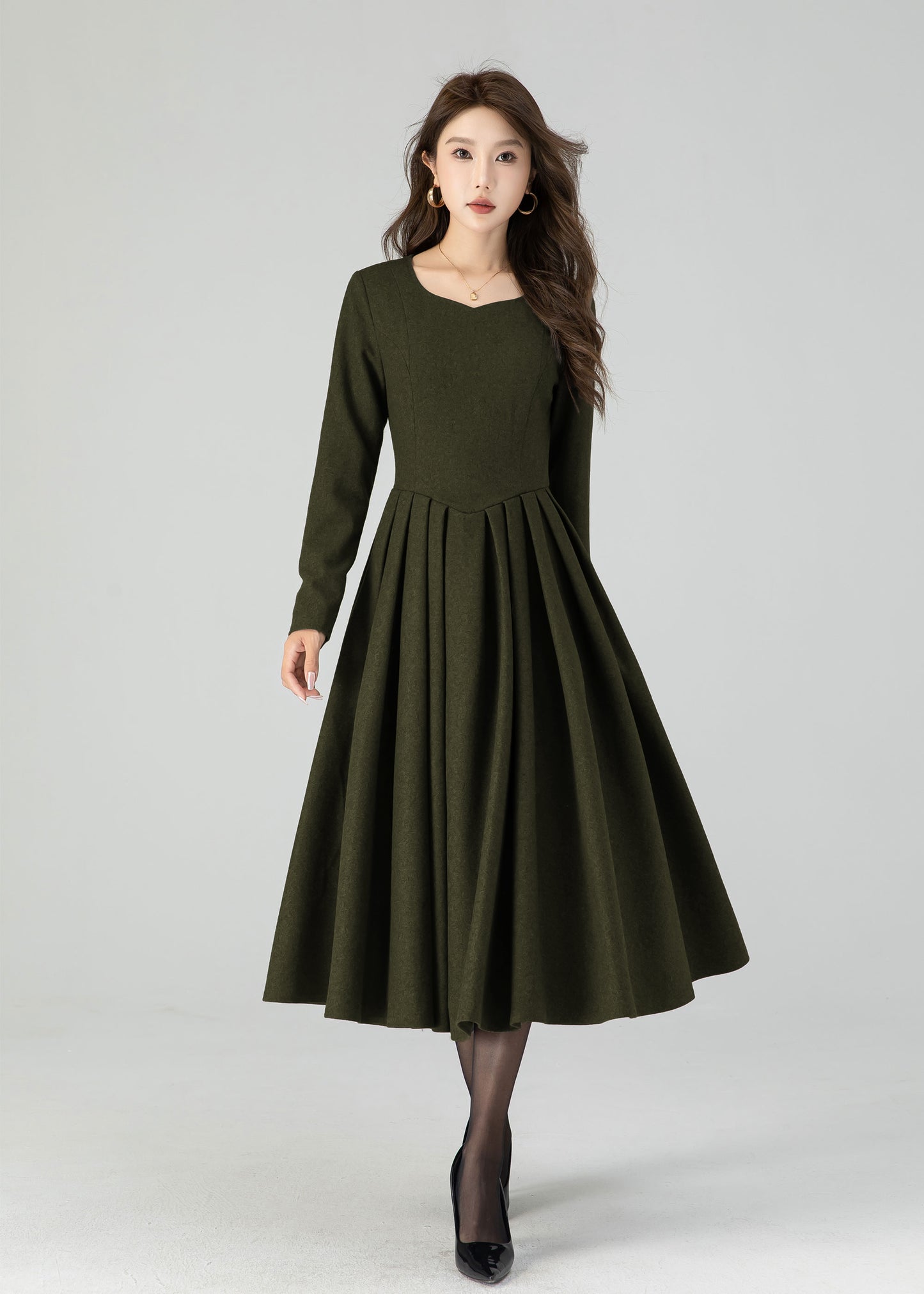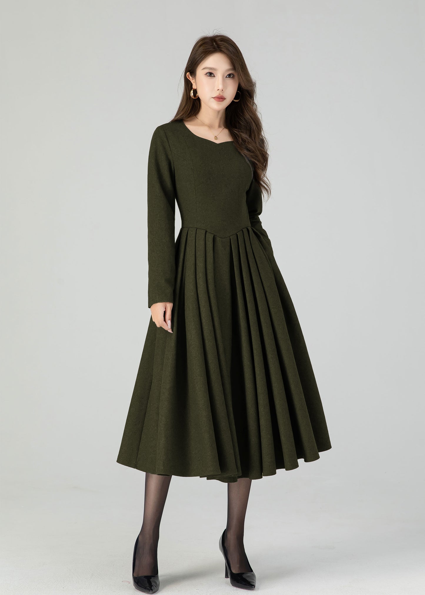 Elevate your winter wardrobe with this fit and flare wool midi dress, designed with a flattering swing silhouette and delicate pleats. Crafted from a soft wool blend with a sweetheart neckline and long sleeves, it offers both warmth and elegance—perfect from daytime gatherings to evening outings.
