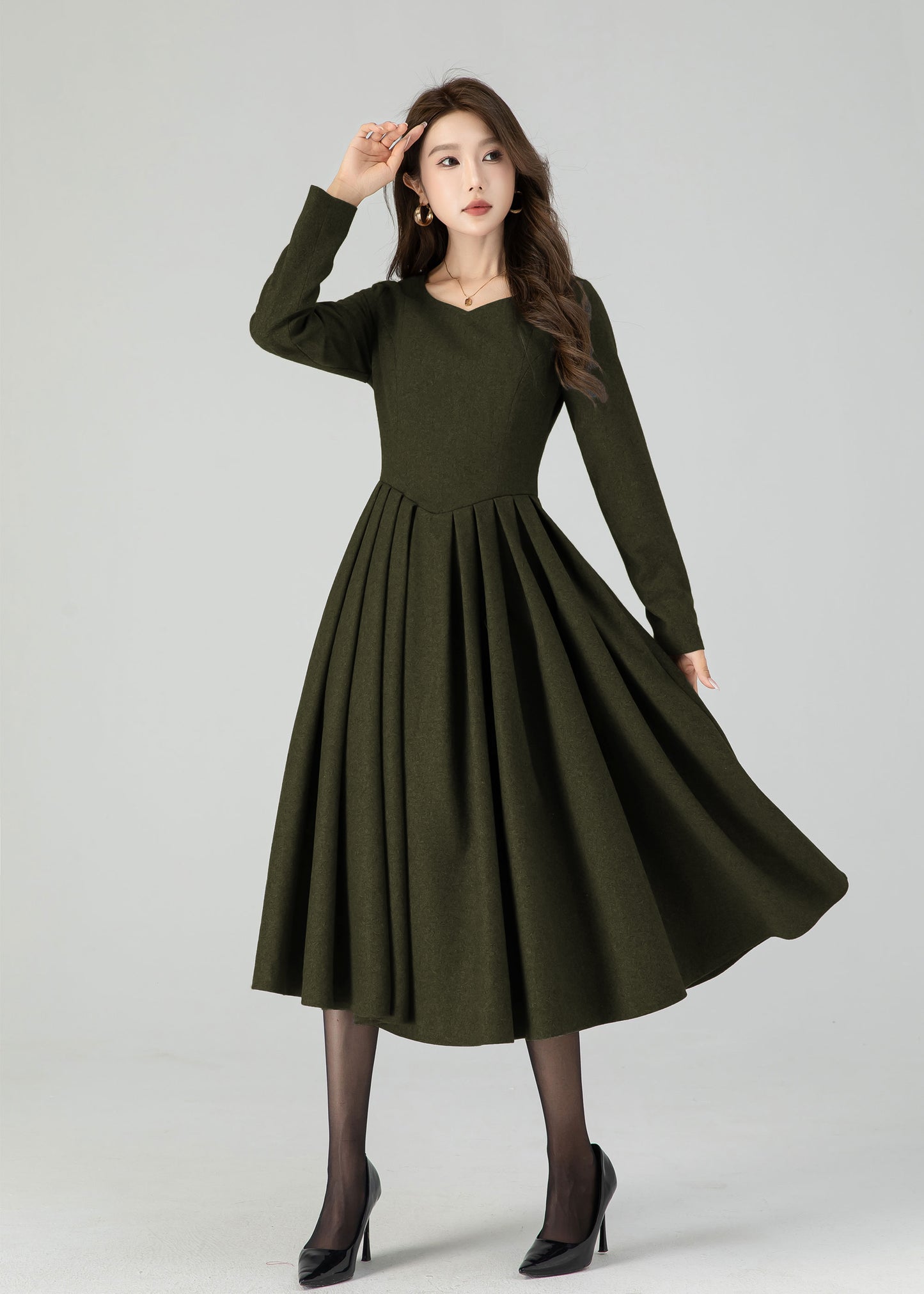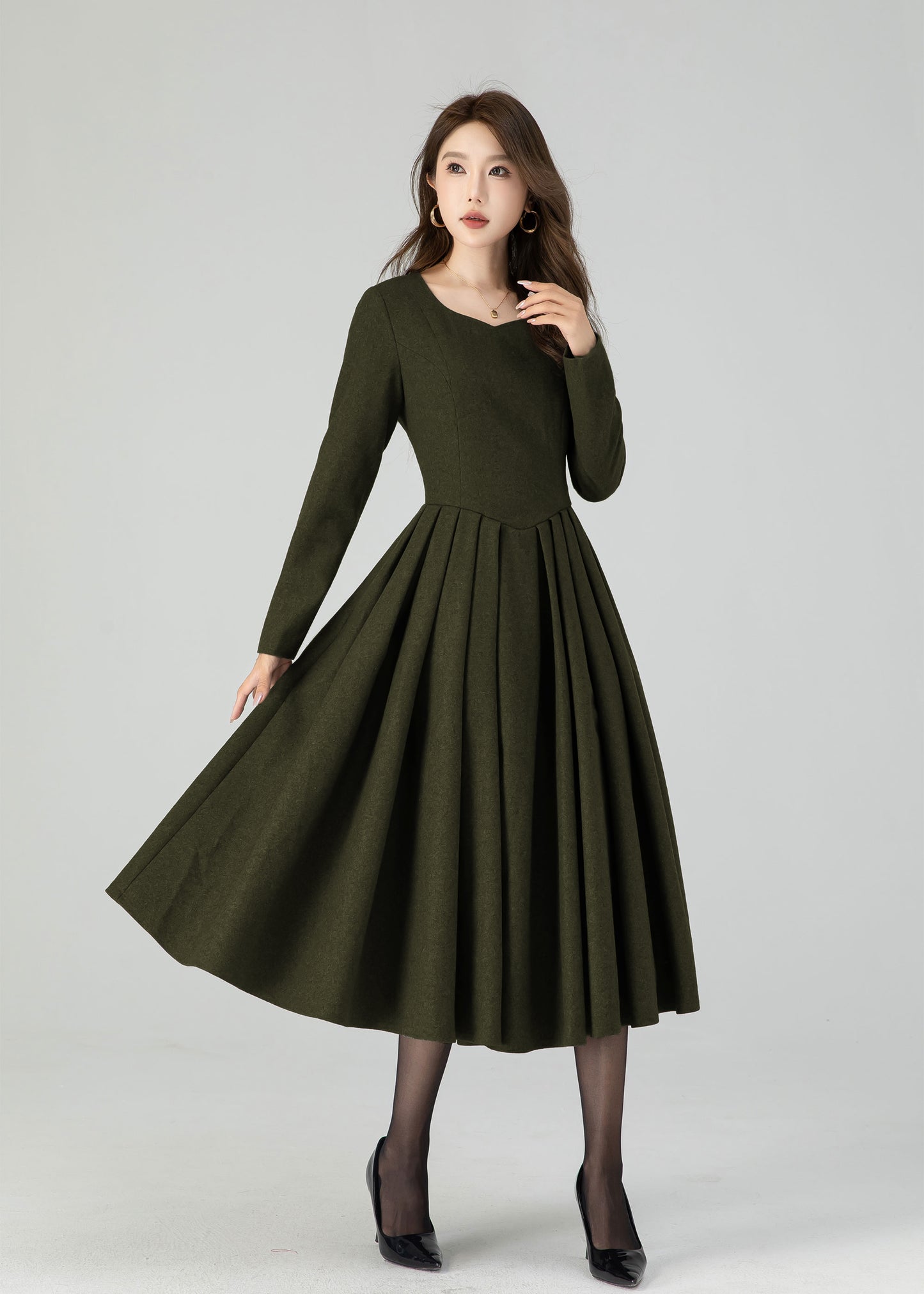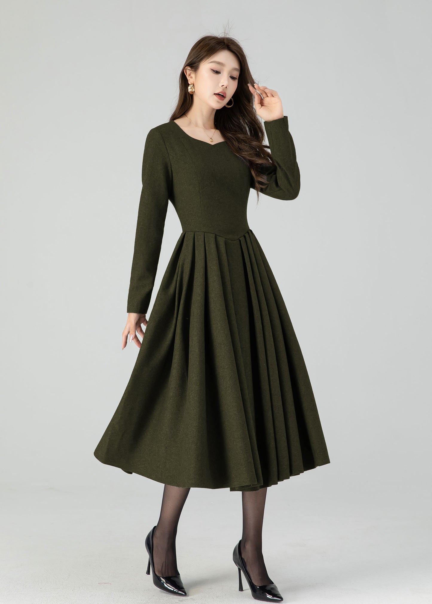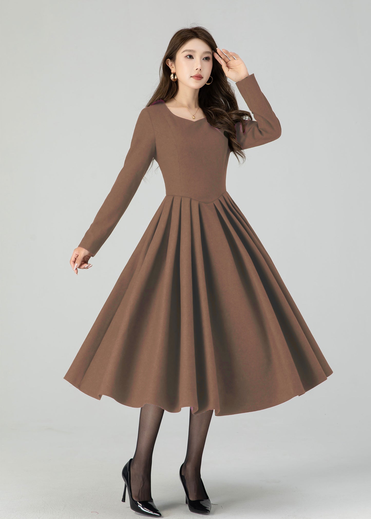 Elevate your winter wardrobe with this fit and flare wool midi dress, designed with a flattering swing silhouette and delicate pleats. Crafted from a soft wool blend with a sweetheart neckline and long sleeves, it offers both warmth and elegance—perfect from daytime gatherings to evening outings.