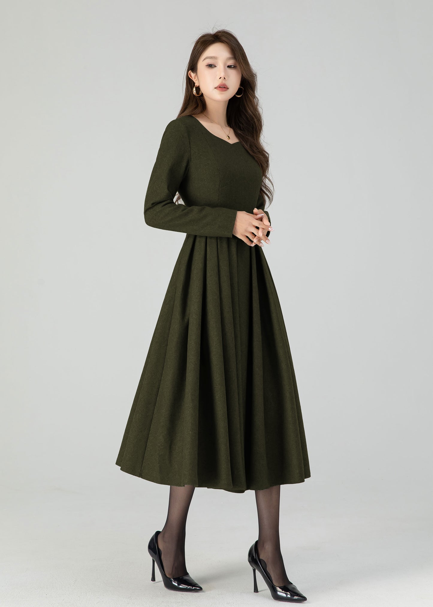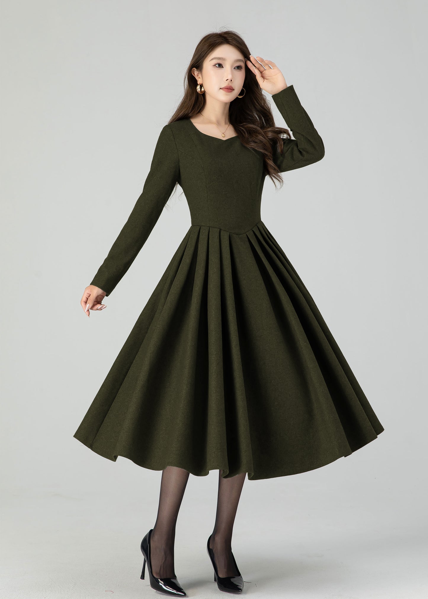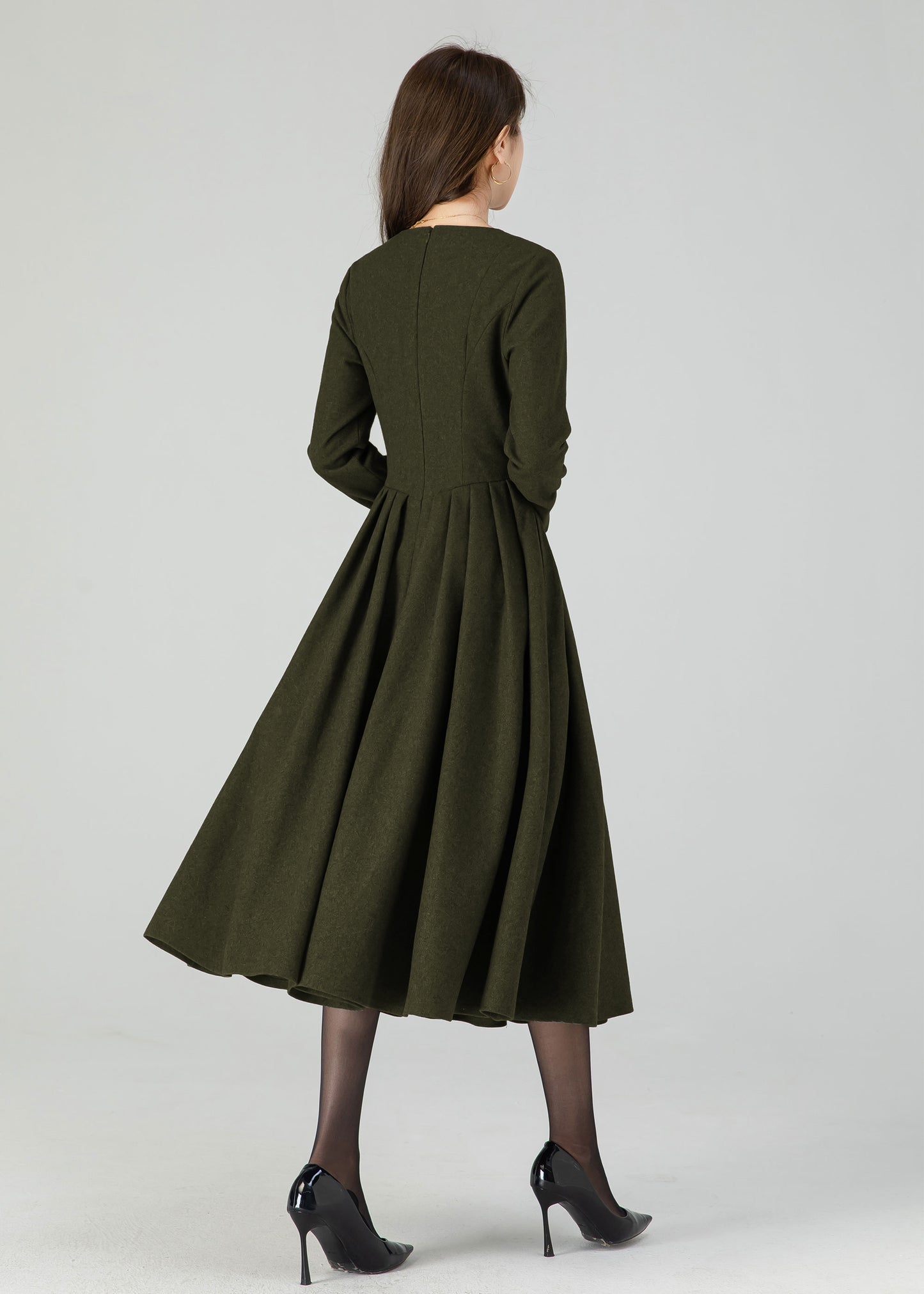Winter Wool Midi Dress – Women’s Fit and Flare Long Sleeve 5501
