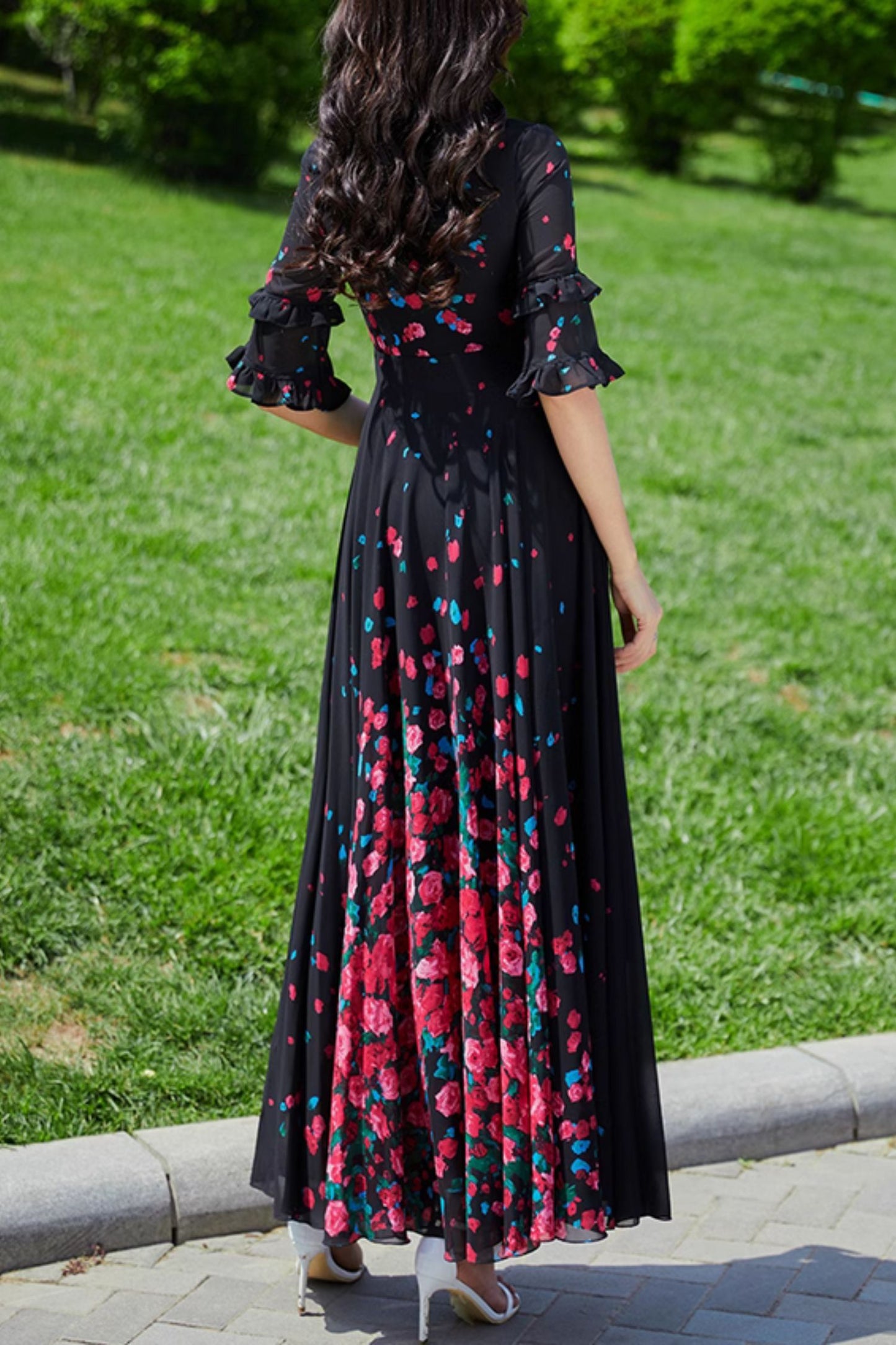 Embrace your daring side with our Floral Printed Black Swing Chiffon Dress 4989! Let your adventurous spirit shine in this daring dress, adorned with a bold floral print and crafted from lightweight chiffon material. Elevate your style and take a risk with this unique and eye-catching piece!