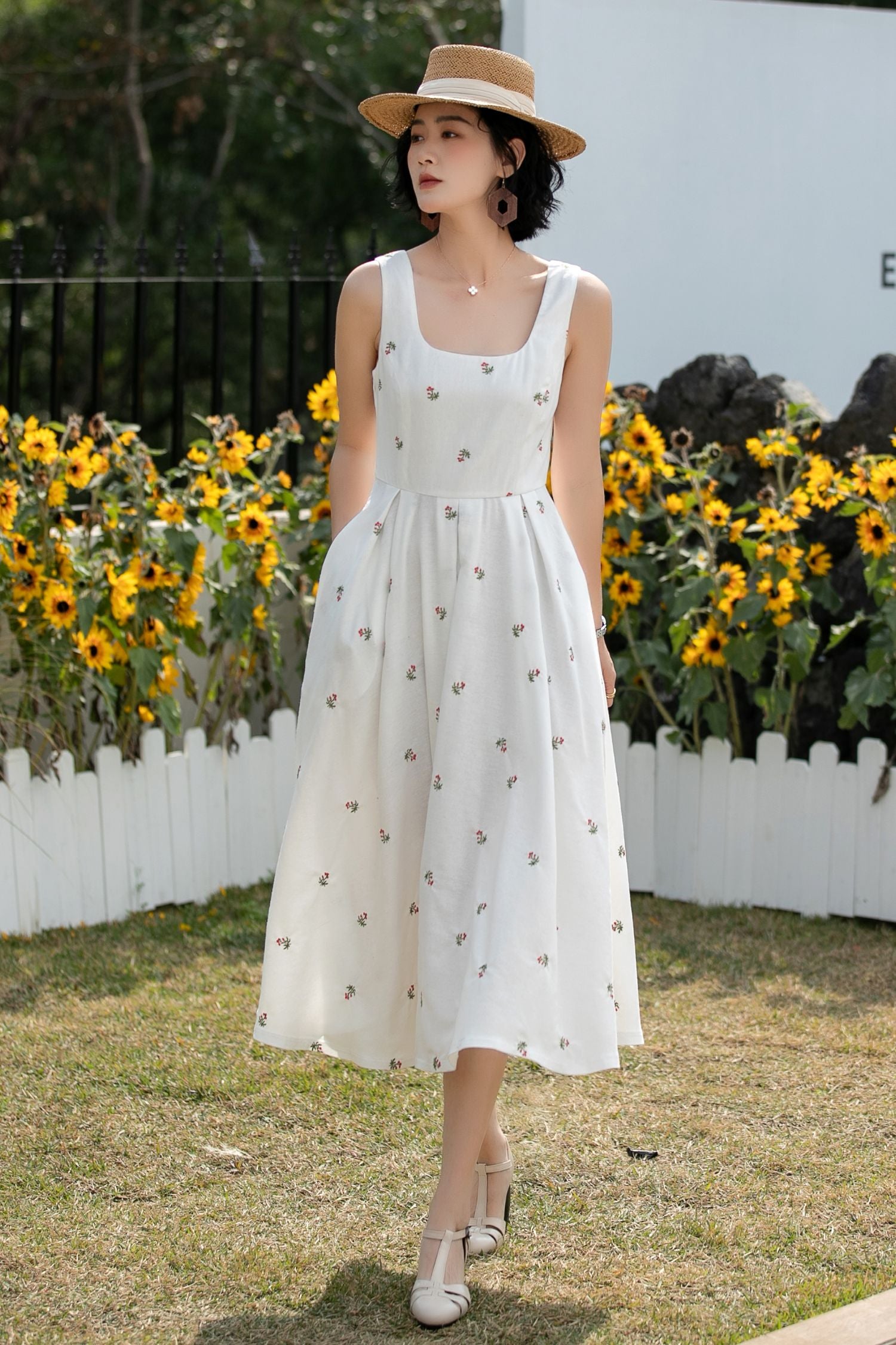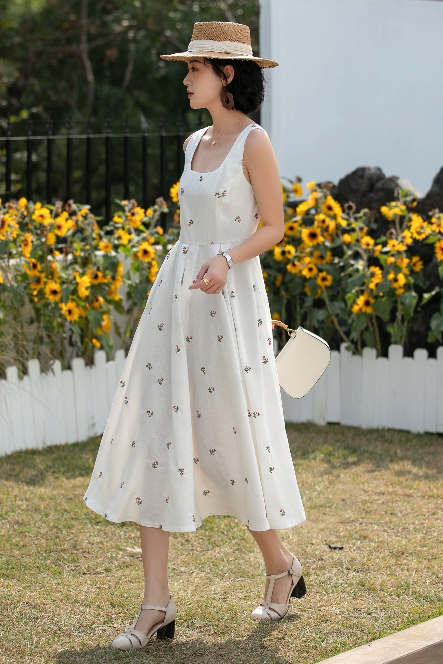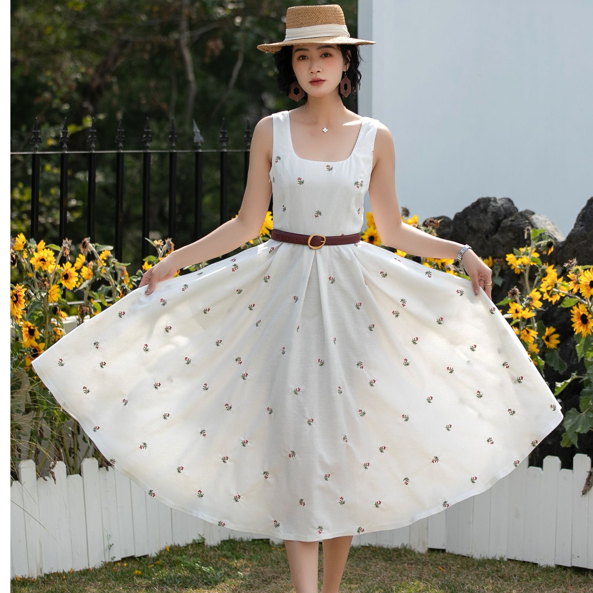 Your summer essential: a linen square-neck dress, dotted with tiny embroidered florals, detachable bows, and a flowy A-line skirt. Ideal for picnics, beach trips, and brunch dates.