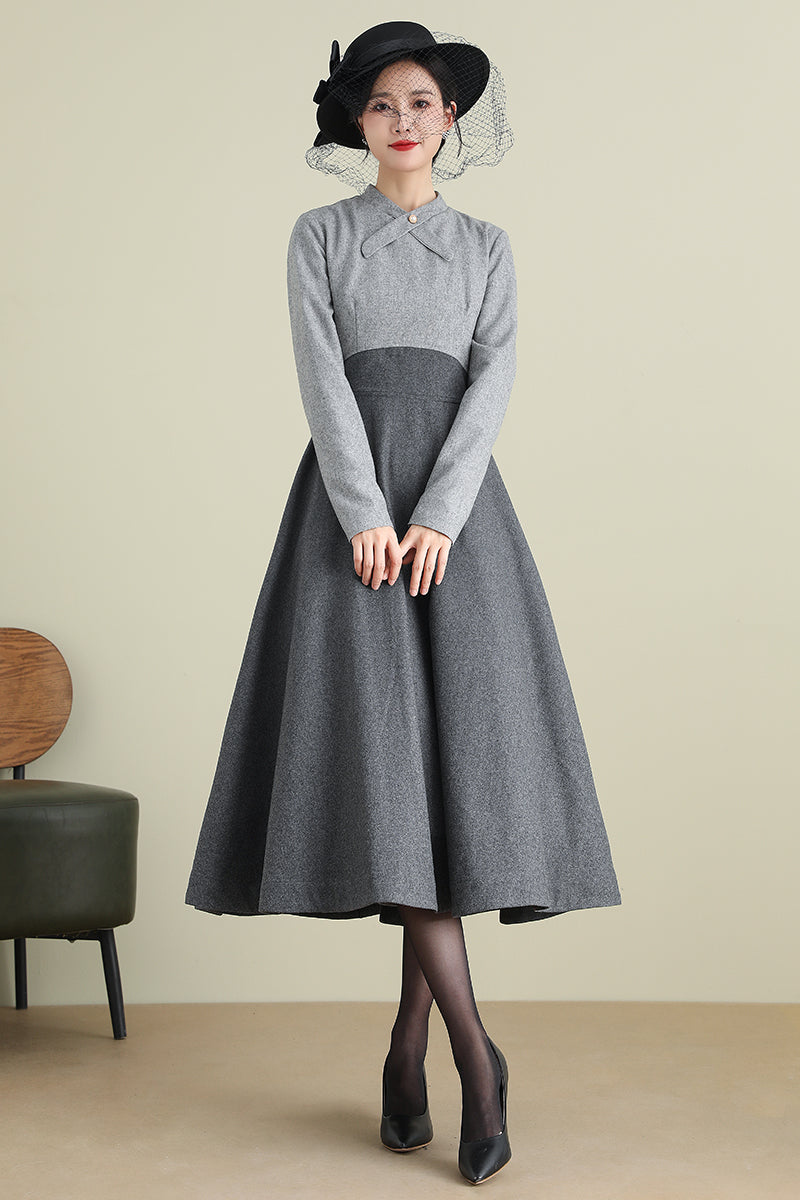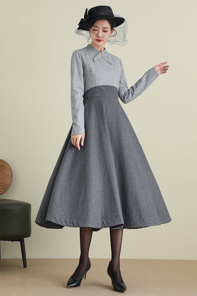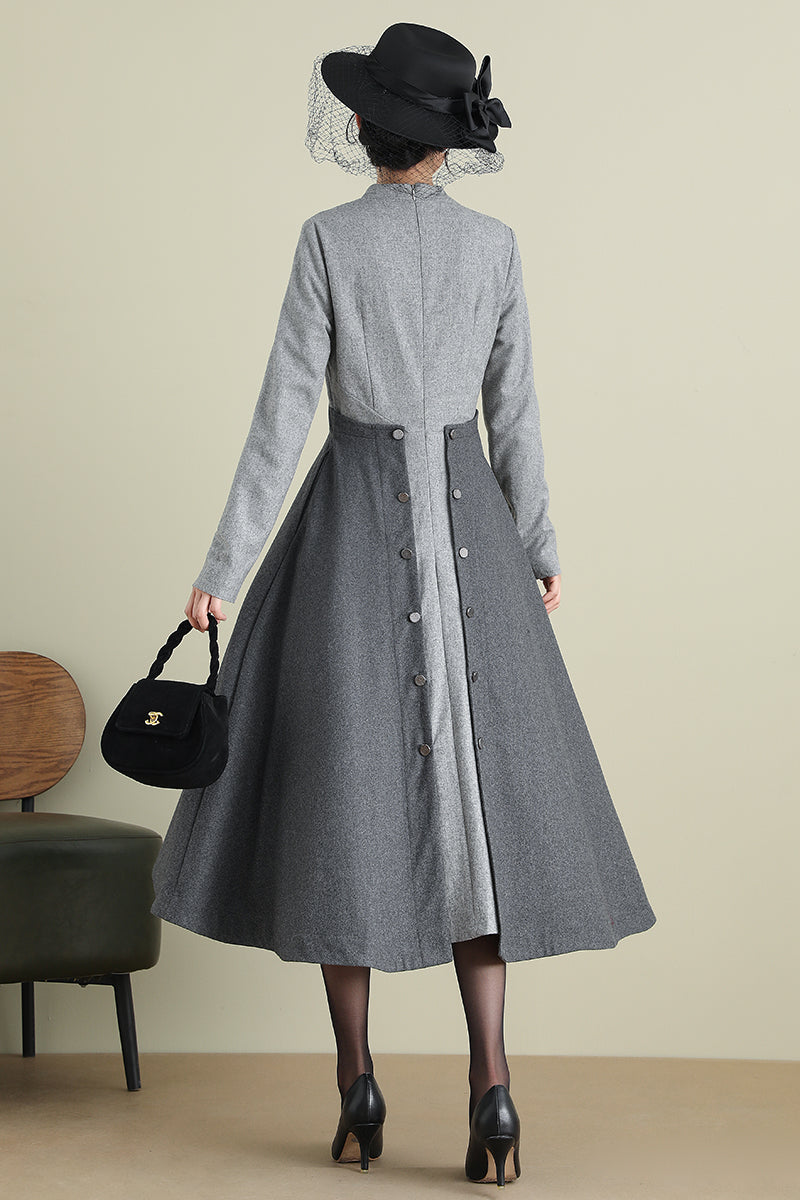 Gray A-Line Long Wool Dress 3898