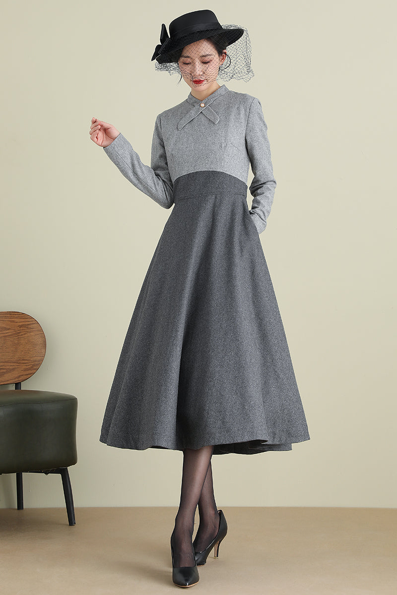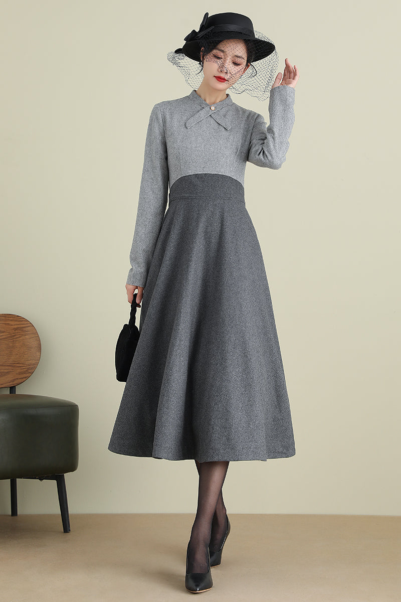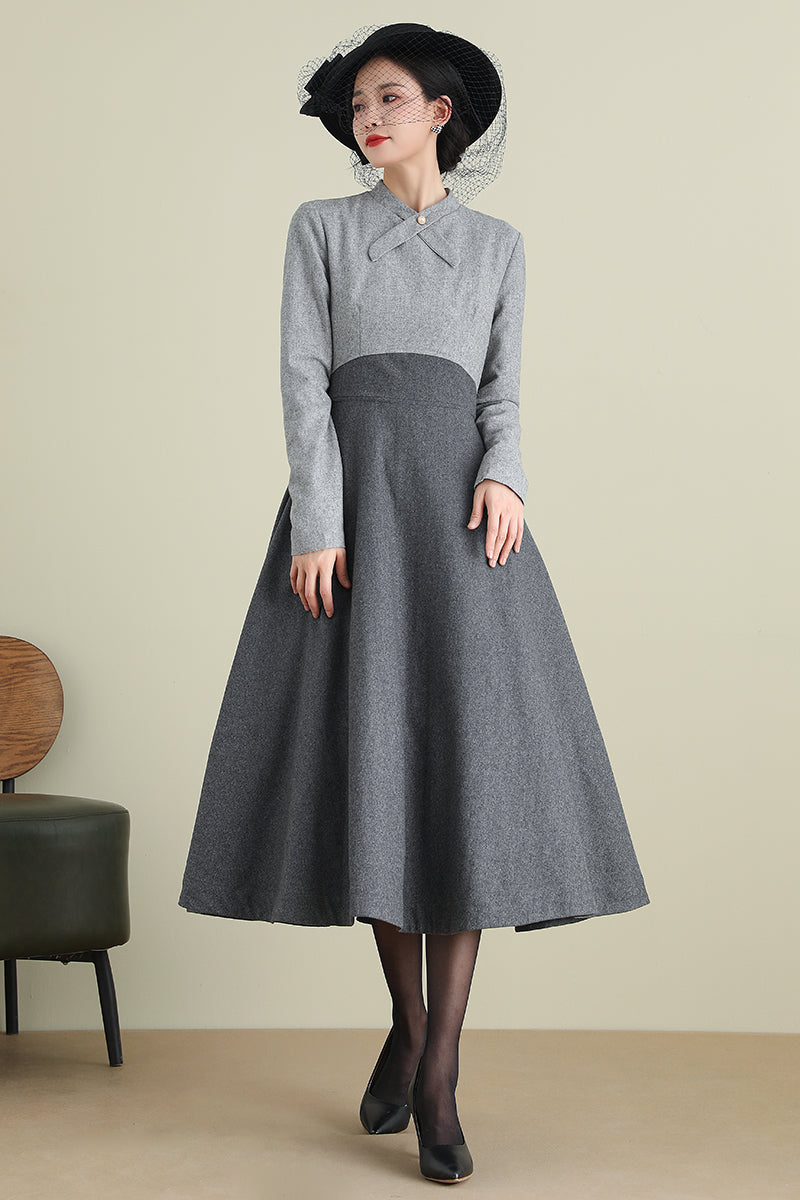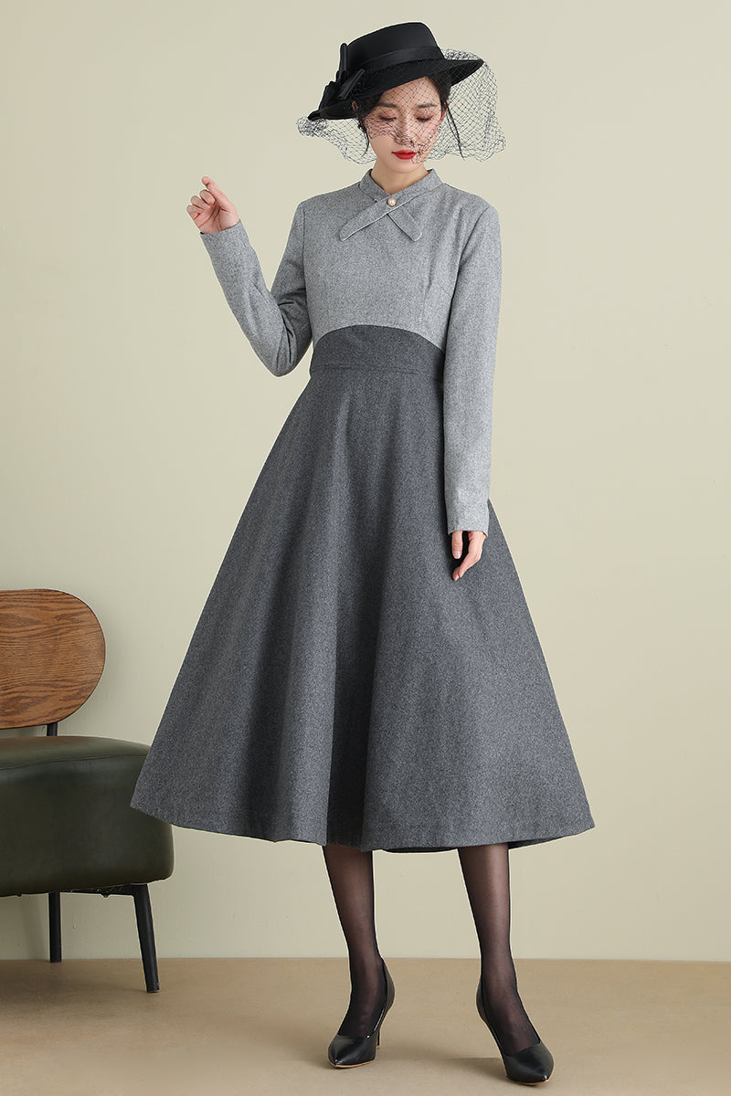 Gray A-Line Long Wool Dress 3898