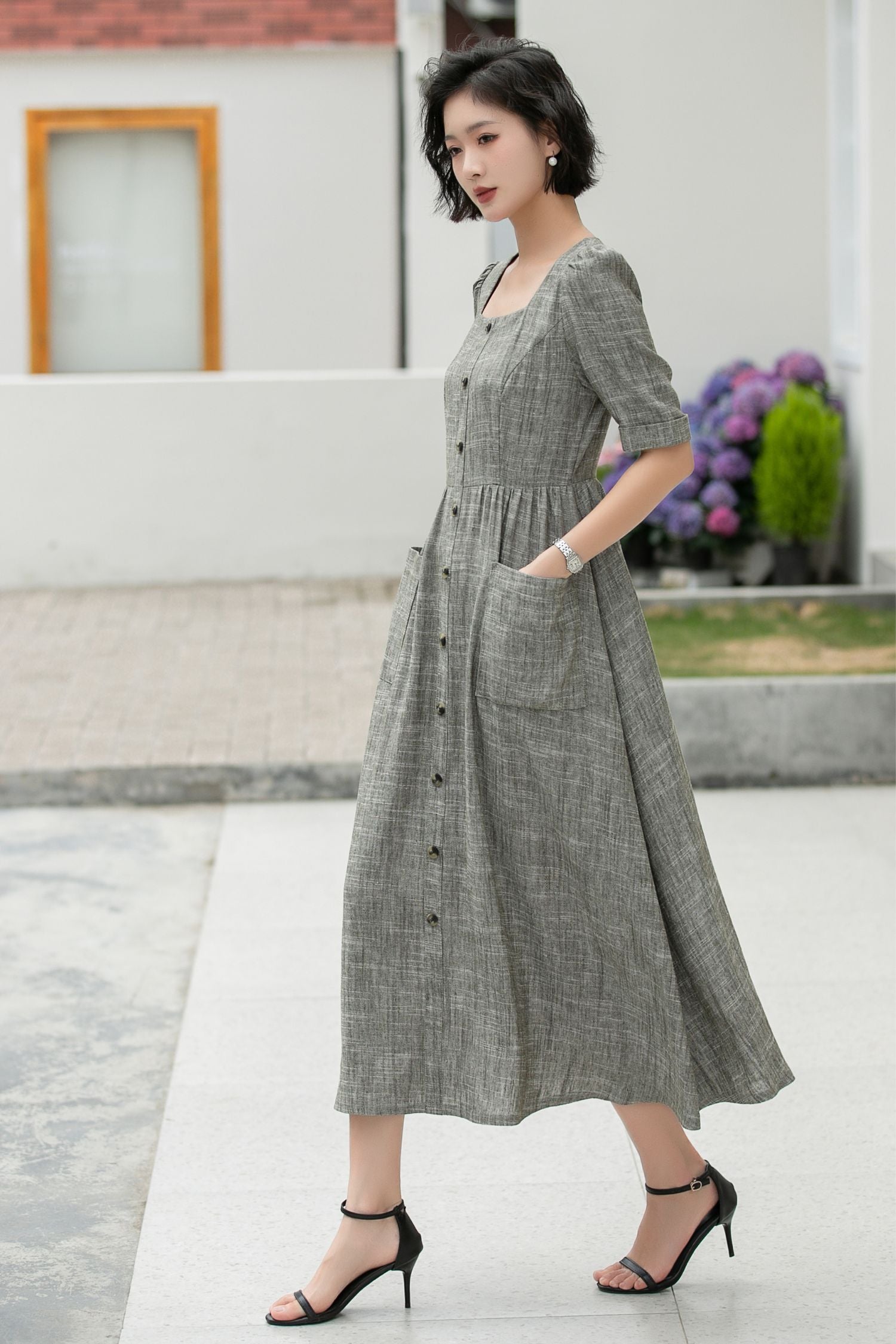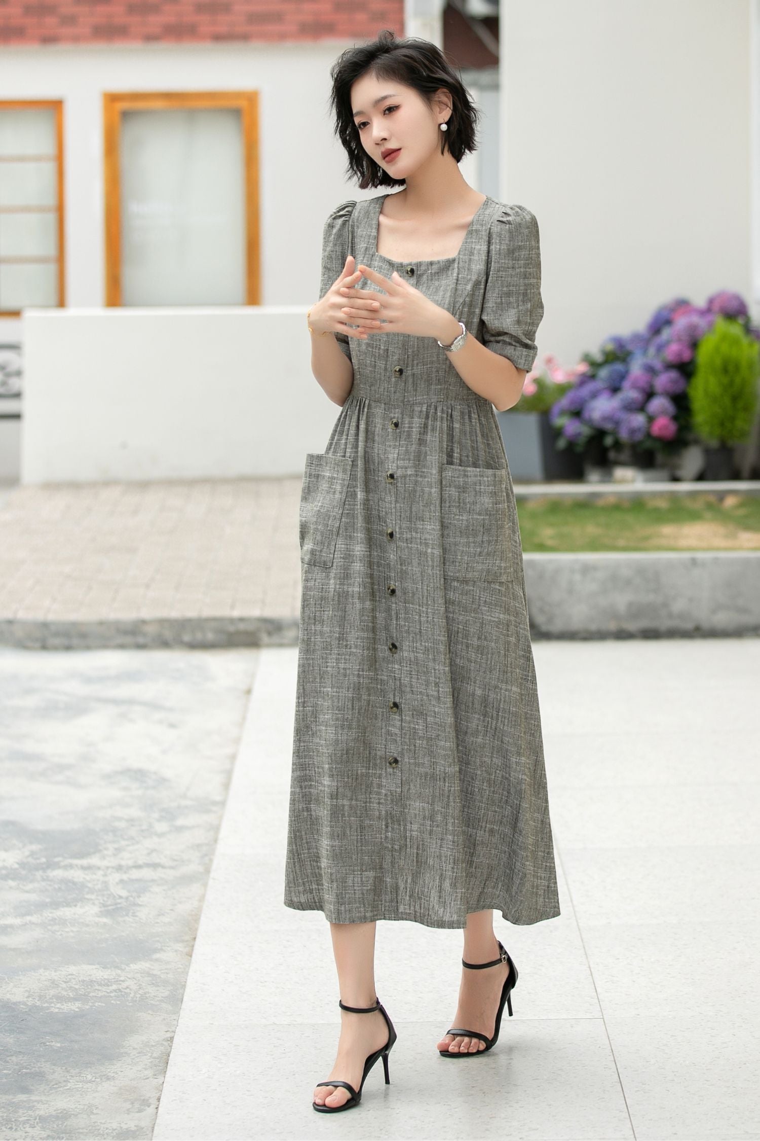 This heather grey linen dress is the perfect blend of relaxed elegance and timeless style. Crafted from a breathable linen-cotton blend, it features a flattering square neckline, delicate puff sleeves, and a full button-down front. The high waist and gently gathered skirt create a flattering silhouette, while the oversized front pockets add a touch of practicality and charm.