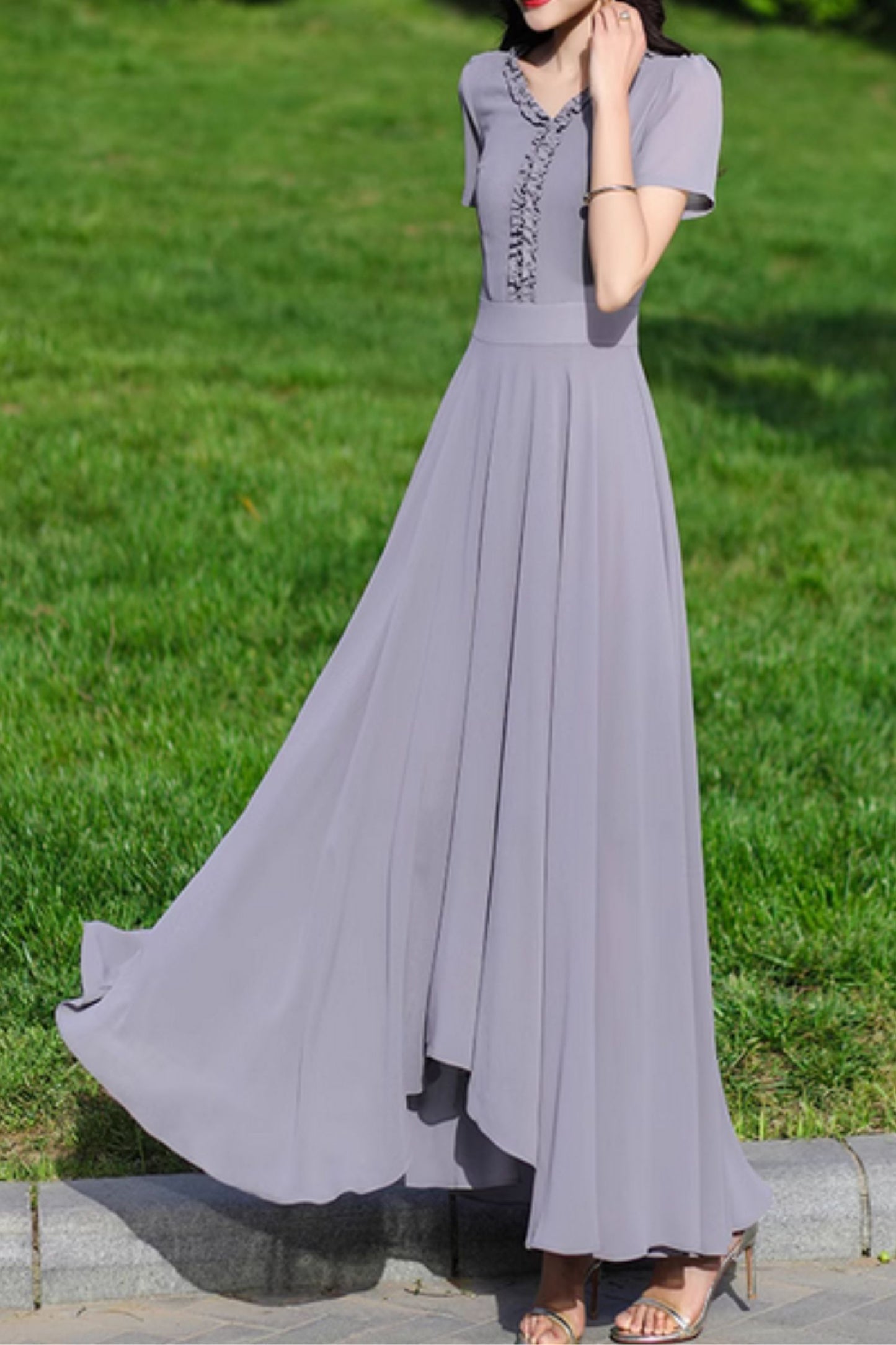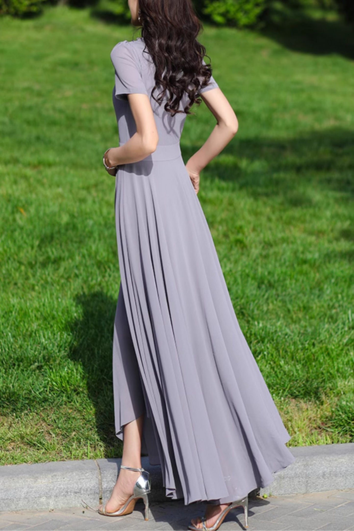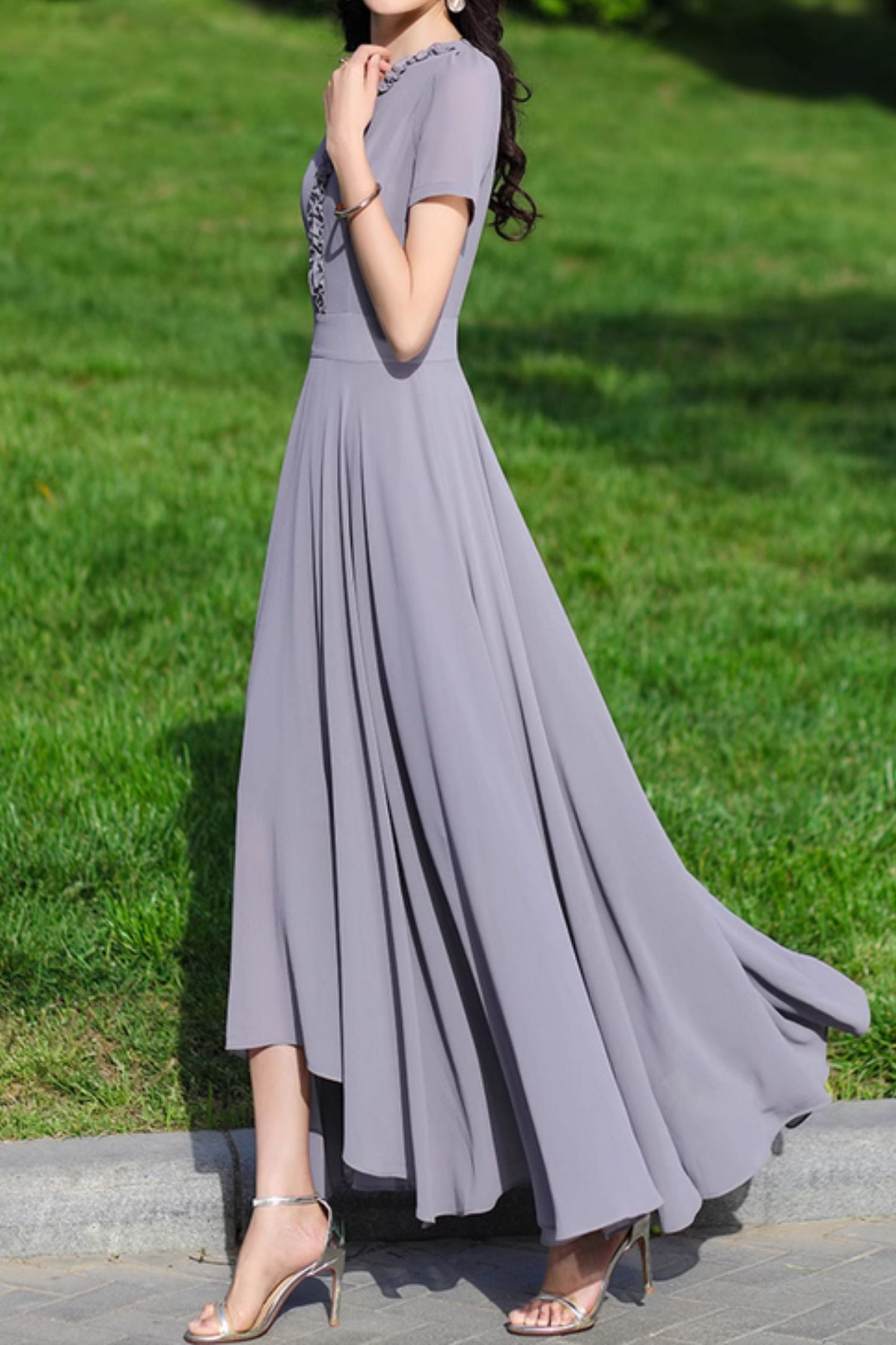 Expertly crafted with a flowing chiffon fabric, this gray irregular maxi summer dress (5088) is perfect for any season. Its unique design offers both elegance and comfort, making it a versatile addition to any wardrobe. Make a statement at any event with this effortlessly stylish dress.