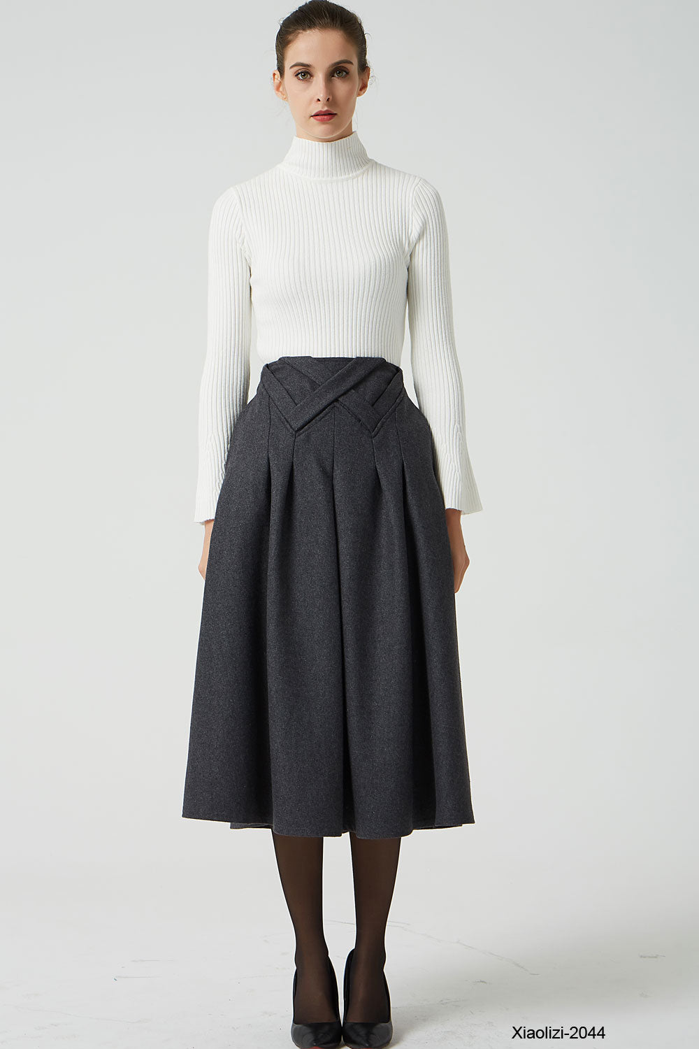 Back elastic waist midi skirt, made from dark gray wool fabric by Xiaolizi. Pleated construction and two seam pockets. Finished with unique cross details in front.