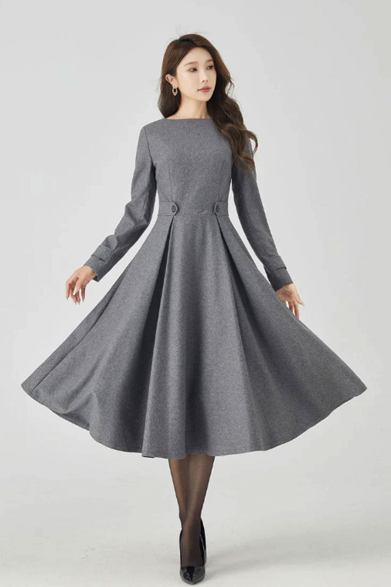 Gray Wool Dress – Handmade Fit & Flare Long Sleeve Winter Midi | Xiaolizi 4525