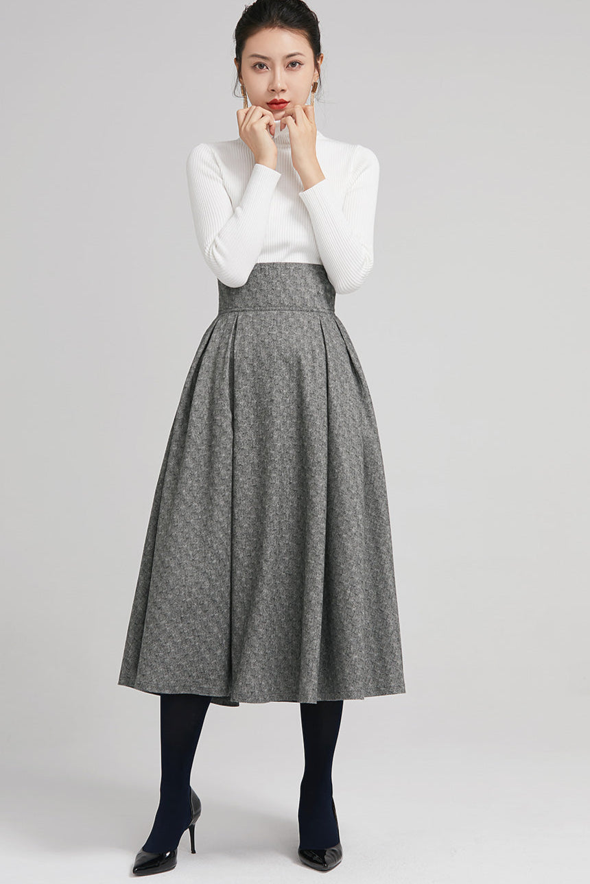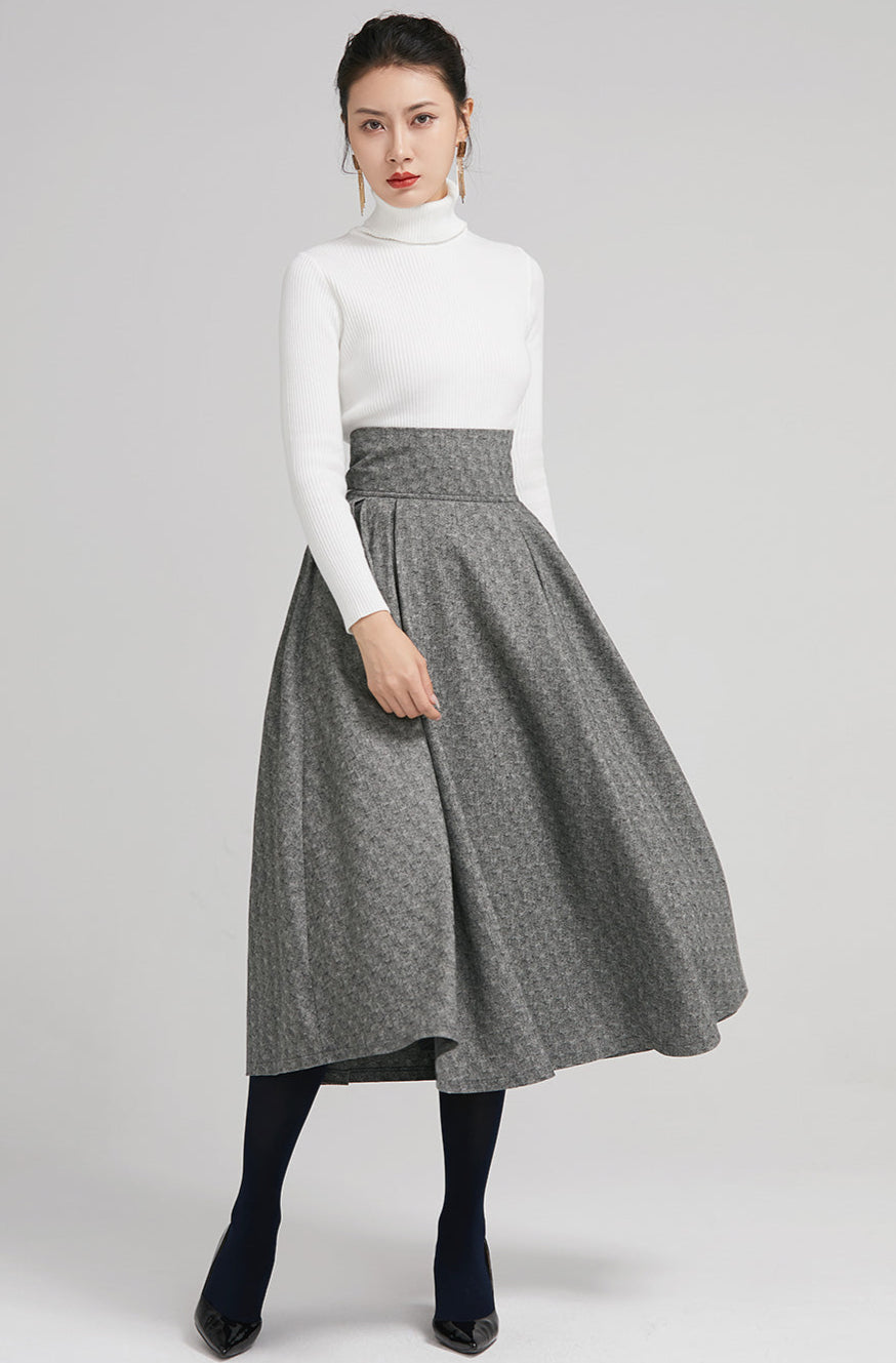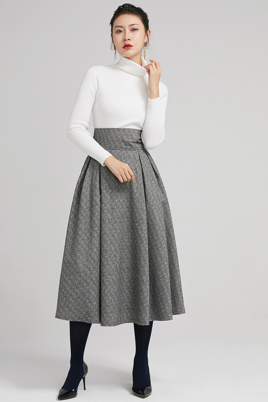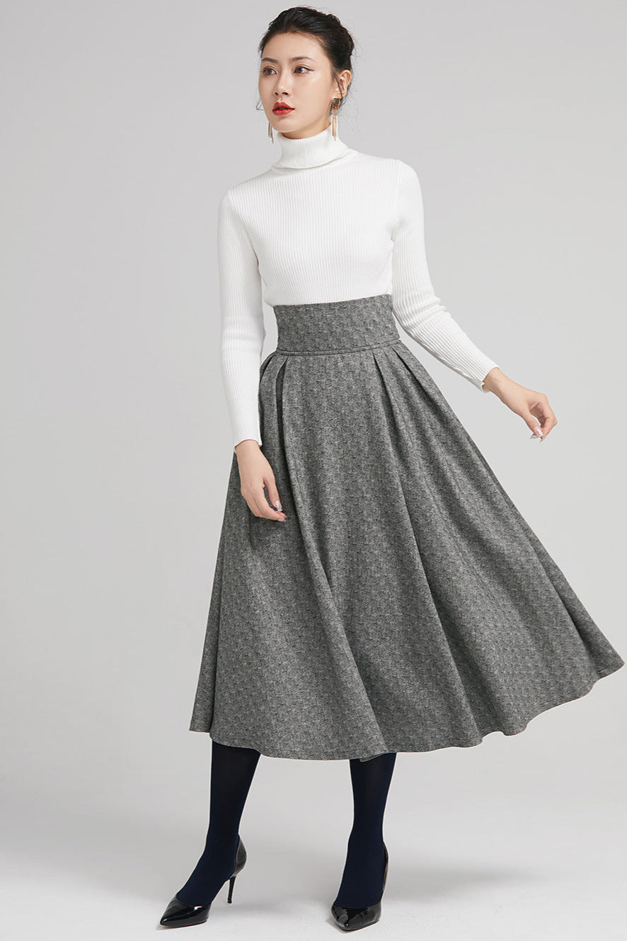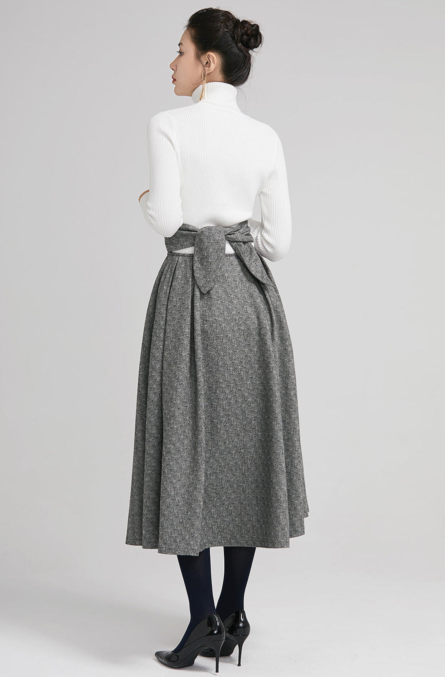 Heather Gray Wool Midi Skirt – Vintage High Waist Winter Skirt with Bow Tie 2247