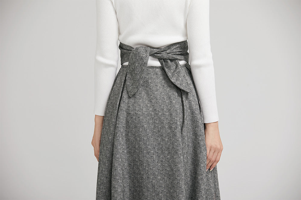 Elevate your winter wardrobe with this heather gray wool midi skirt, featuring a refined high waist and belt band for a flattering fit. The front showcases a structured, elegant silhouette, while the back bow tie detail adds a feminine, vintage-inspired touch. Crafted from soft wool fabric with a smooth lining, this skirt flows gracefully with every step, perfect for creating chic office looks or sophisticated weekend outfits.