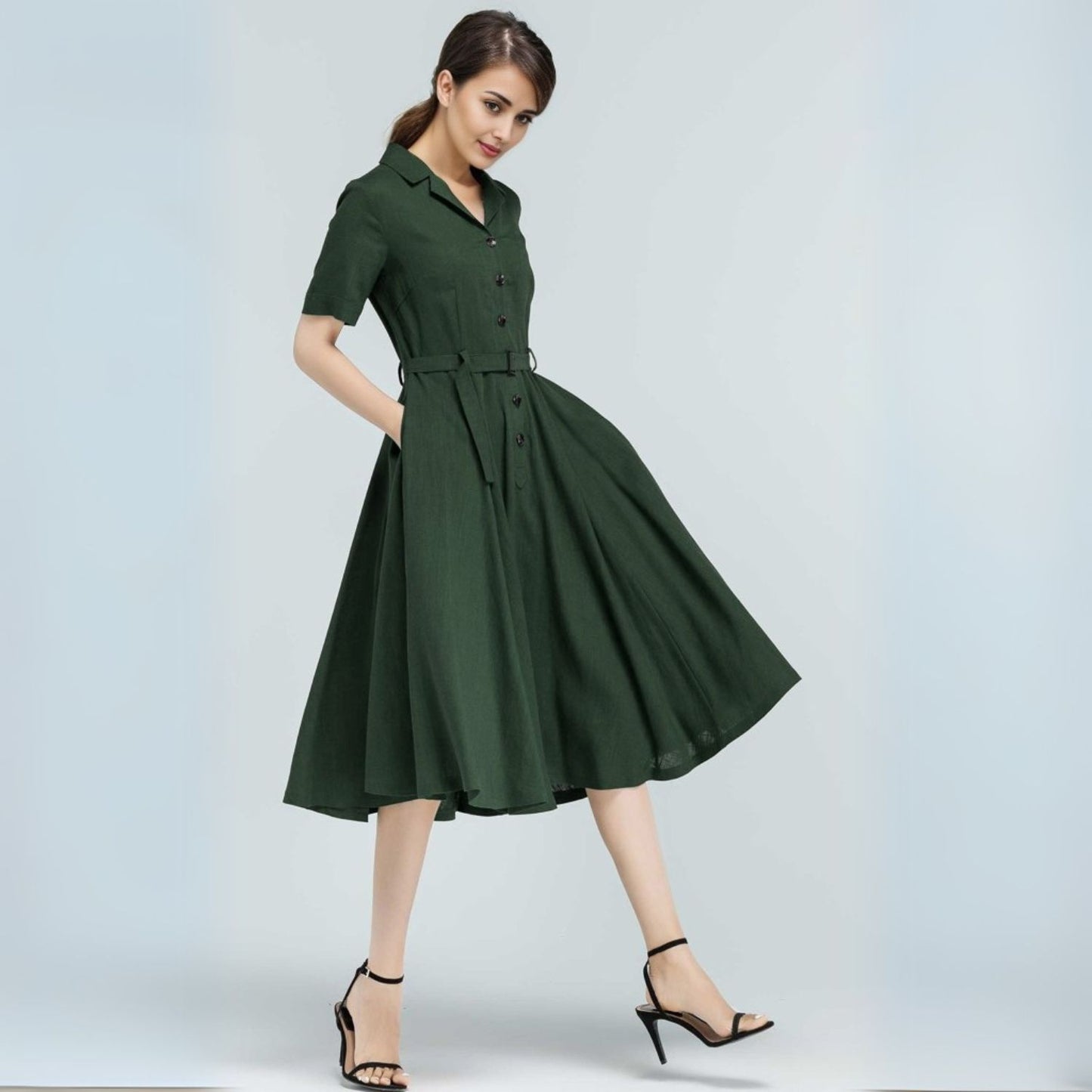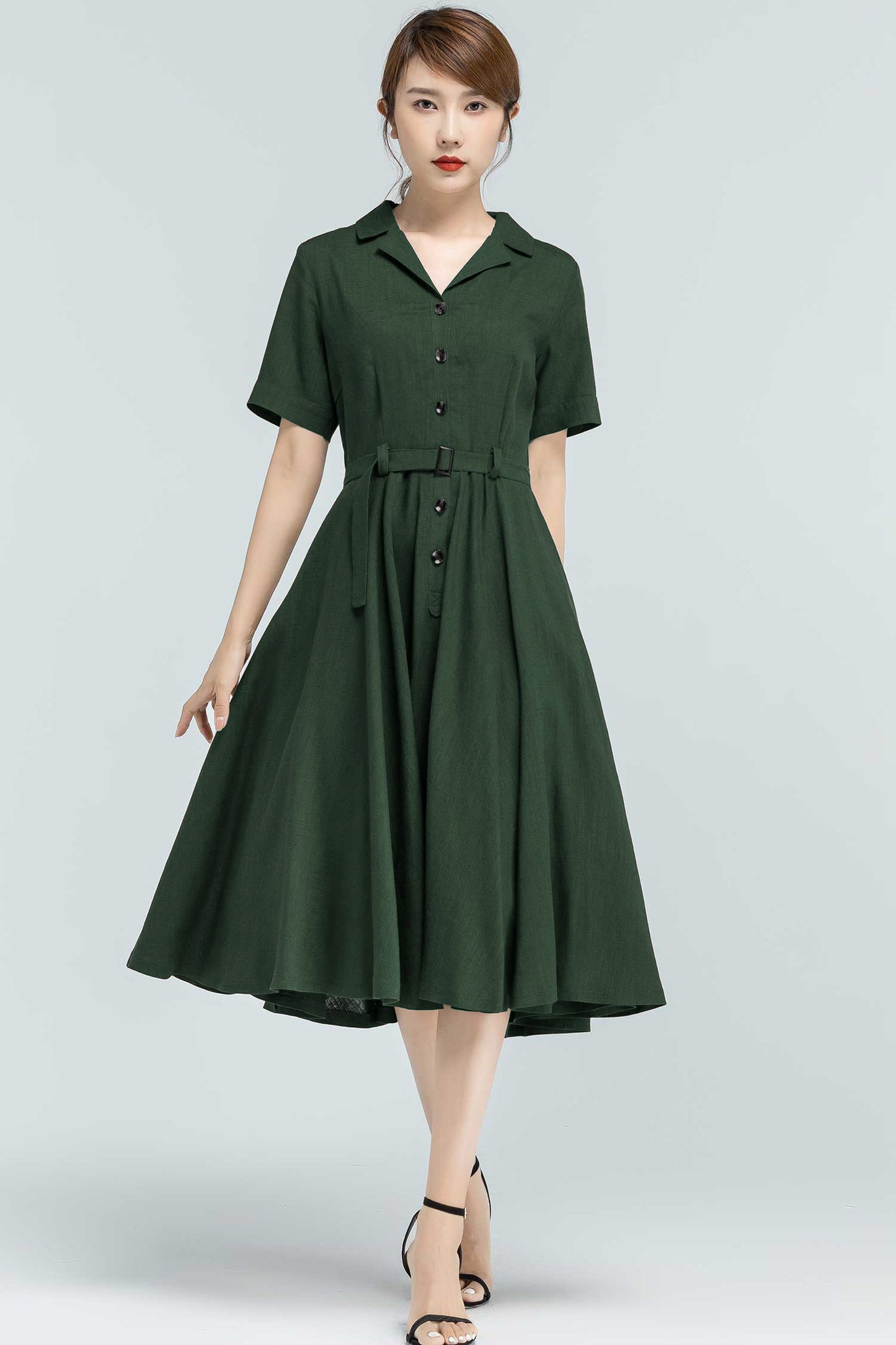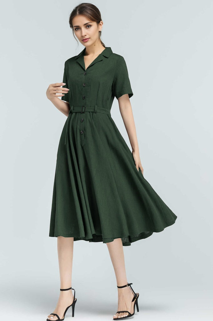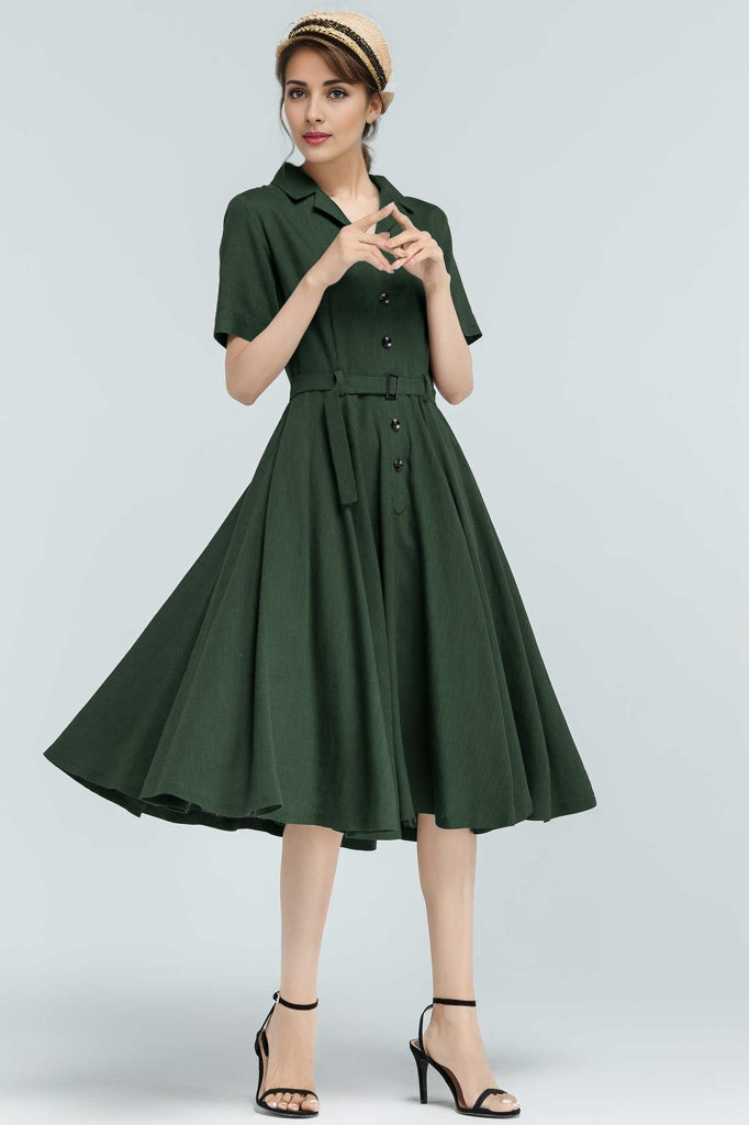 Bring timeless elegance into your everyday wardrobe with this 50s-inspired green linen swing dress. Designed with a flattering belted waist, button-front closure, and handy side pockets, it blends practicality with vintage charm. Made from a breathable linen-cotton blend, it’s perfect for summer strolls, garden parties, or casual workdays—keeping you stylish and comfortable all day long.