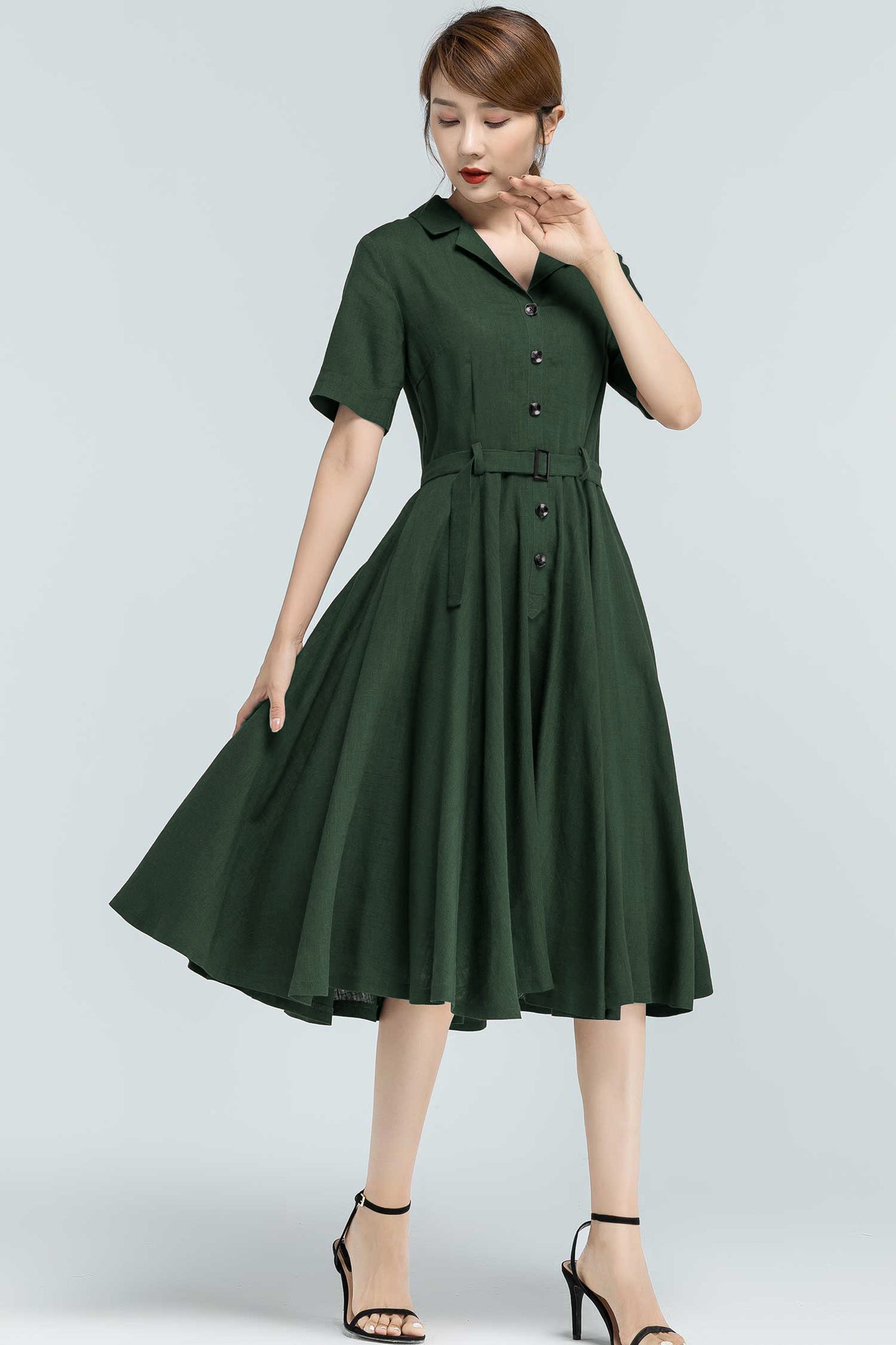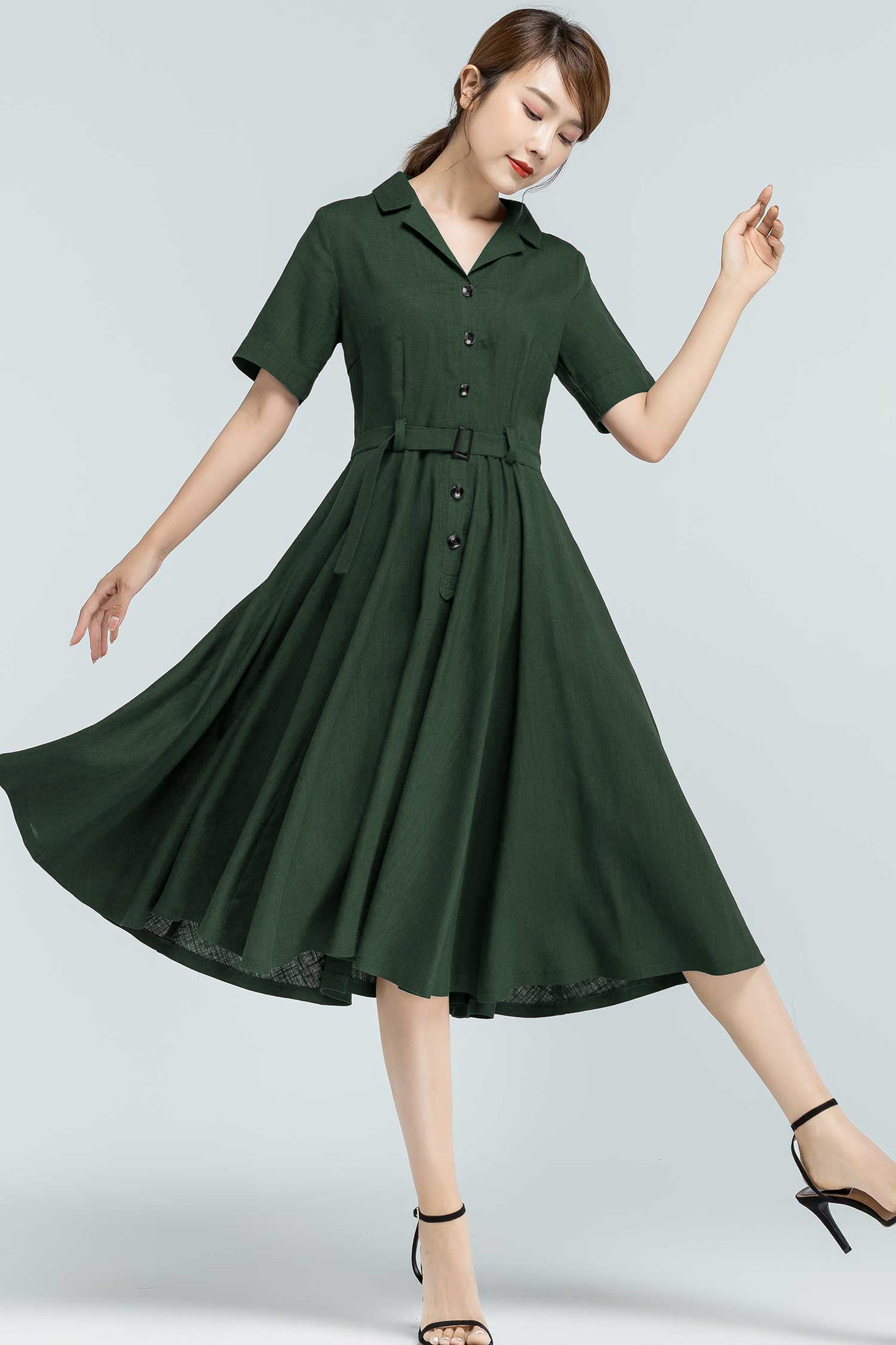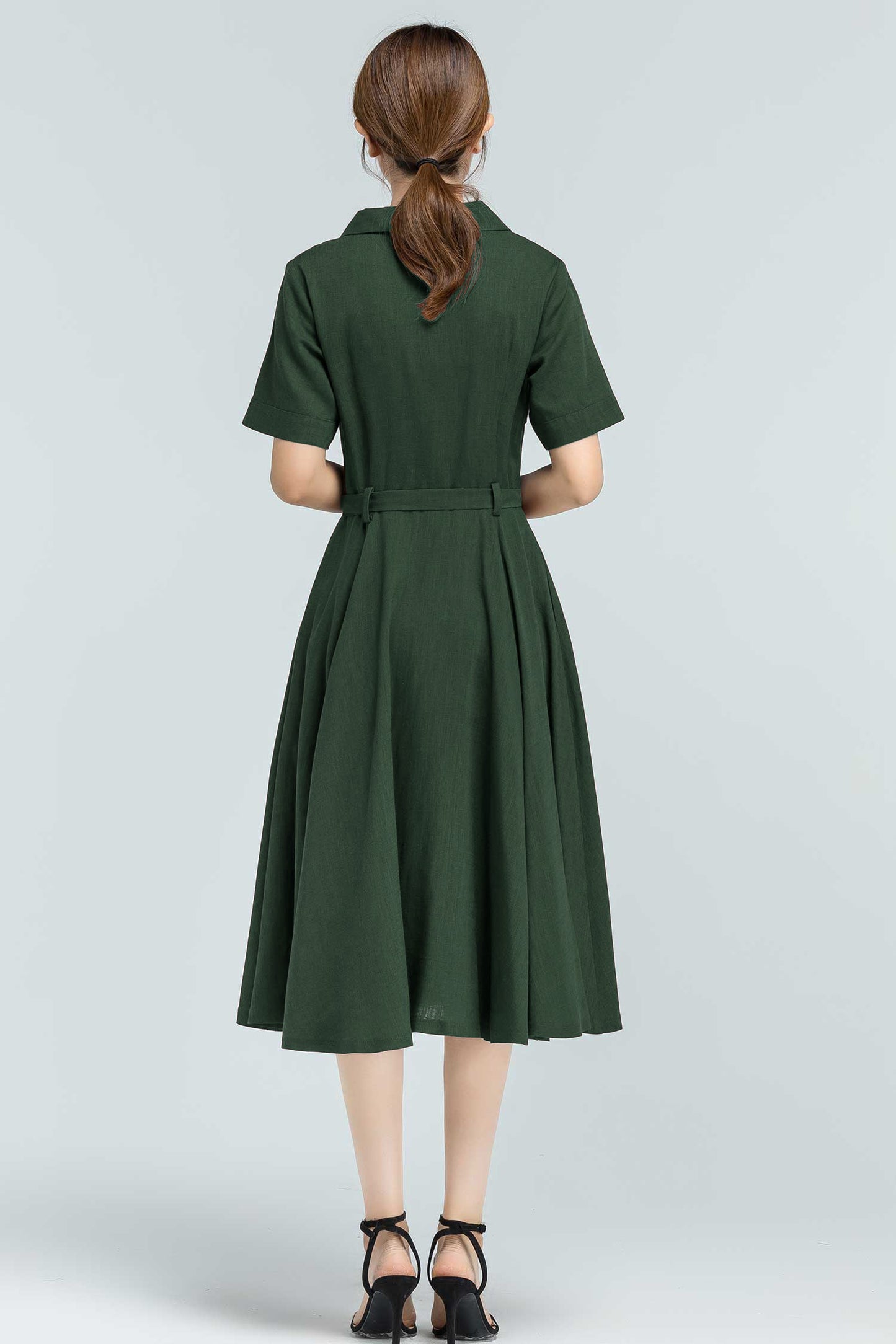Bring timeless elegance into your everyday wardrobe with this 50s-inspired green linen swing dress. Designed with a flattering belted waist, button-front closure, and handy side pockets, it blends practicality with vintage charm. Made from a breathable linen-cotton blend, it’s perfect for summer strolls, garden parties, or casual workdays—keeping you stylish and comfortable all day long.