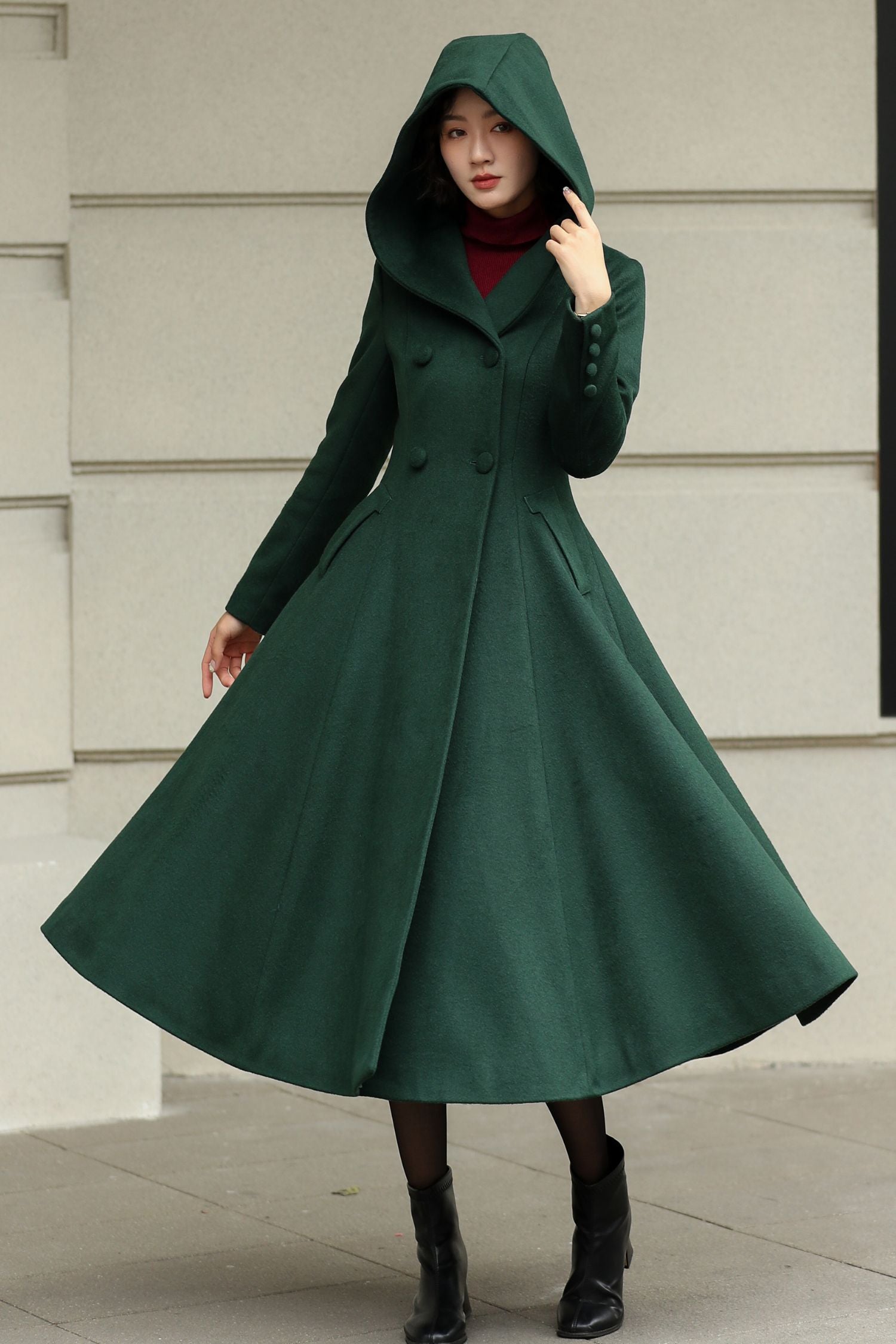 Imagine walking through a crisp winter morning, wrapped in the soft warmth of this handmade green hooded wool coat — where timeless elegance meets everyday comfort. Lovingly crafted from a premium wool blend, it features a gracefully tailored fit-and-flare silhouette that flatters the figure and moves beautifully with you. The large hood offers extra protection from chilly winds, while the double-breasted design and smooth satiny lining ensure both style and comfort. Perfect for autumn and winter, this coat embodies Xiaolizi’s signature blend of vintage charm and modern refinement.