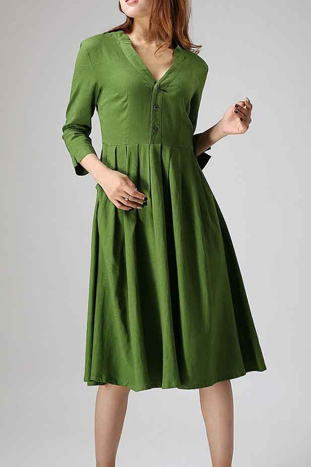 Green linen dress woman knee length dress casual long dress 0891#