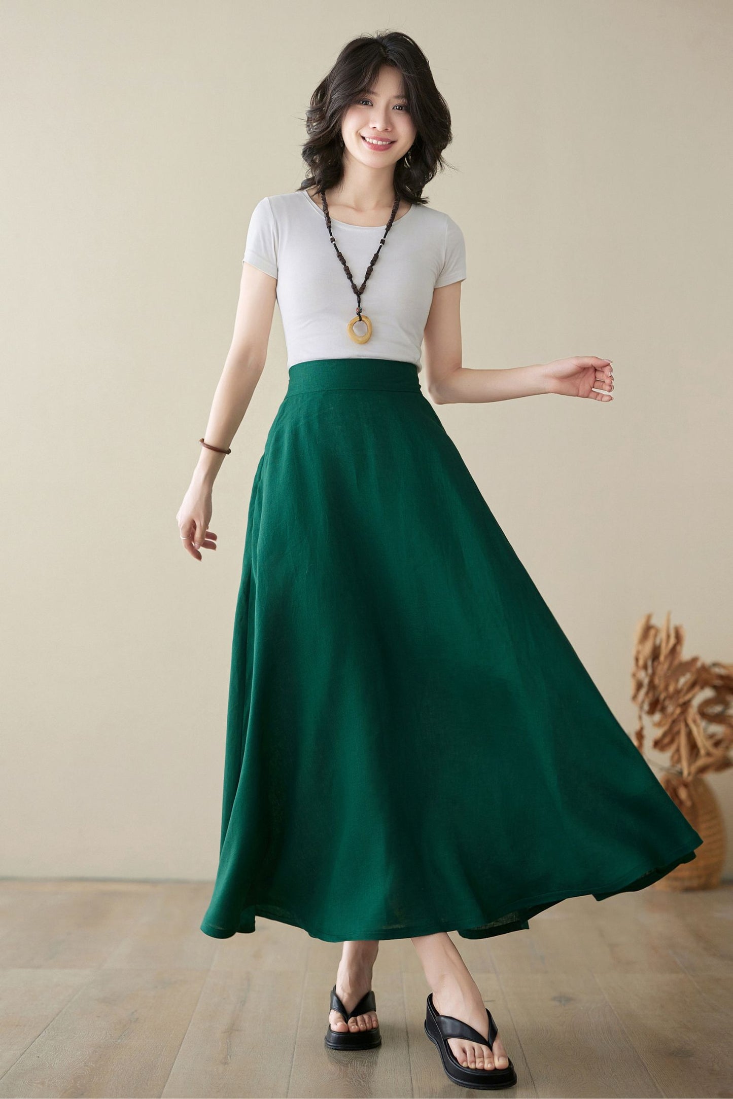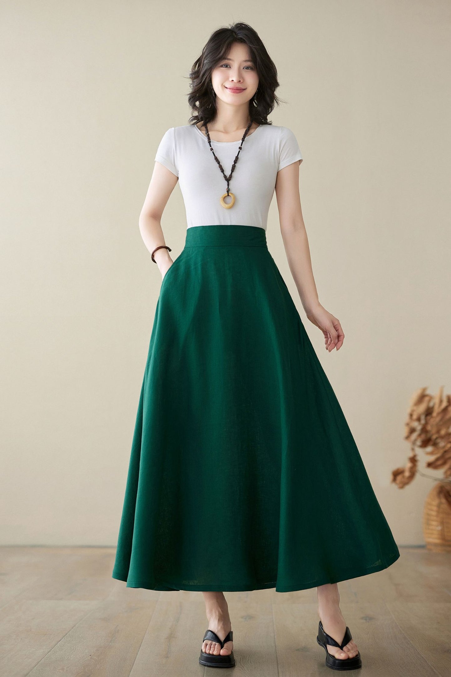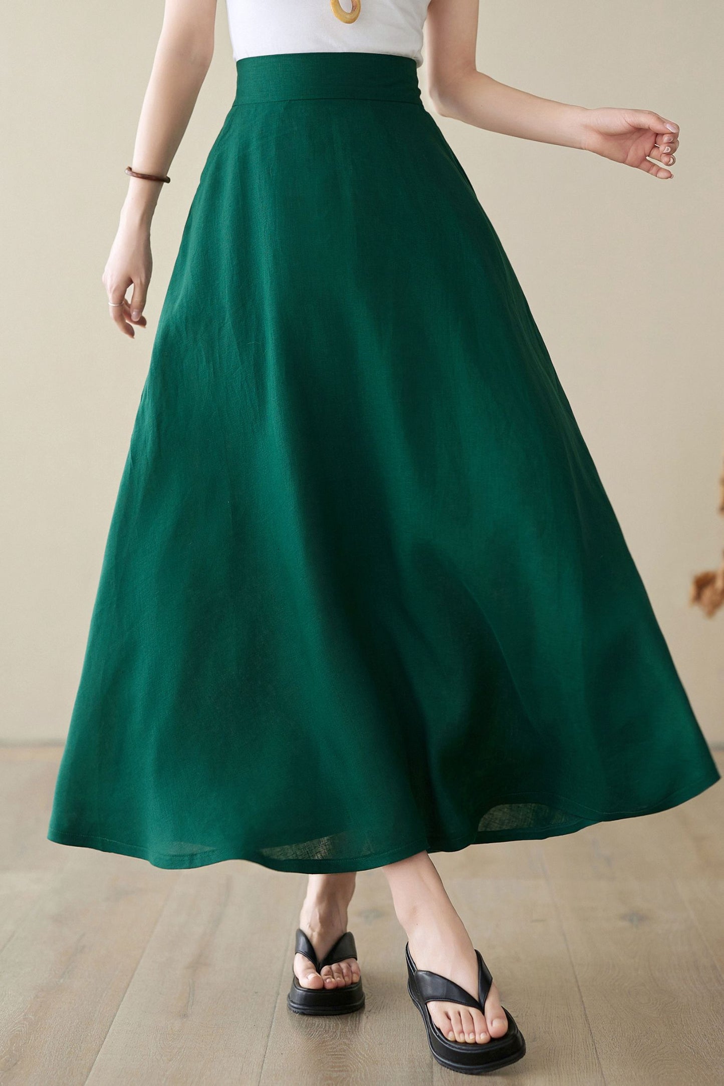 Green Linen Maxi Skirt with pockets 4974