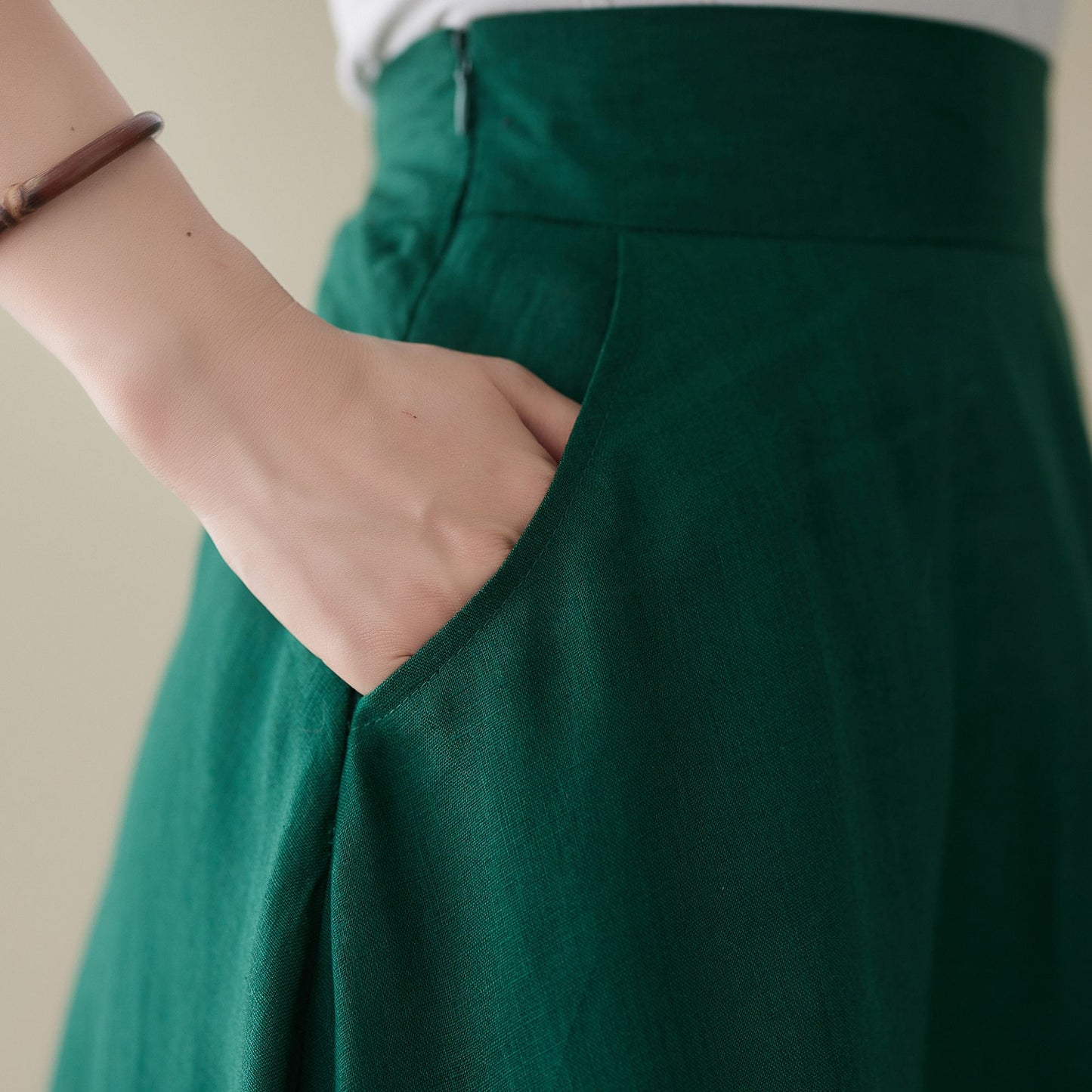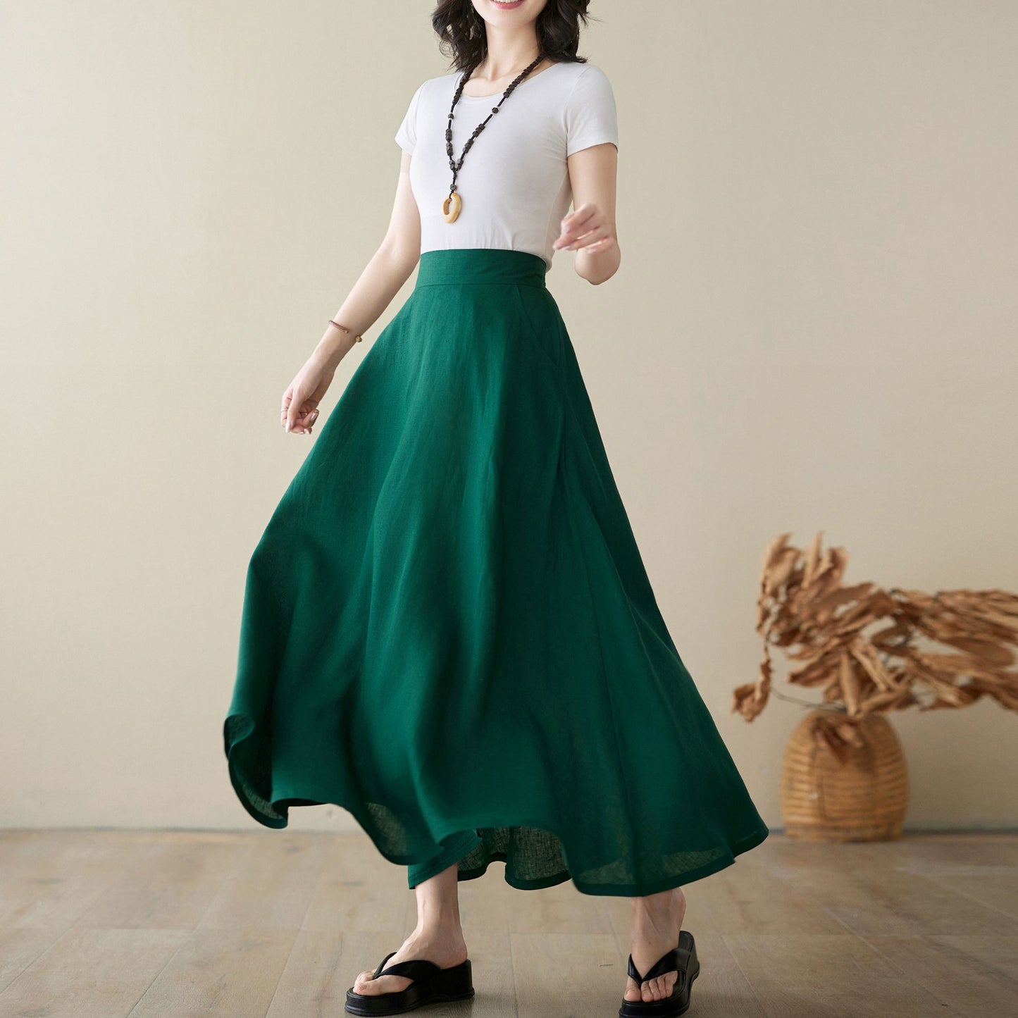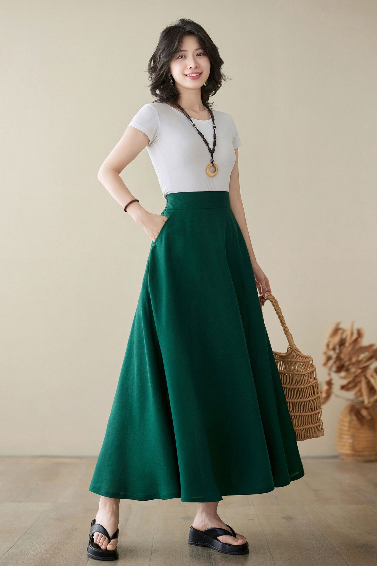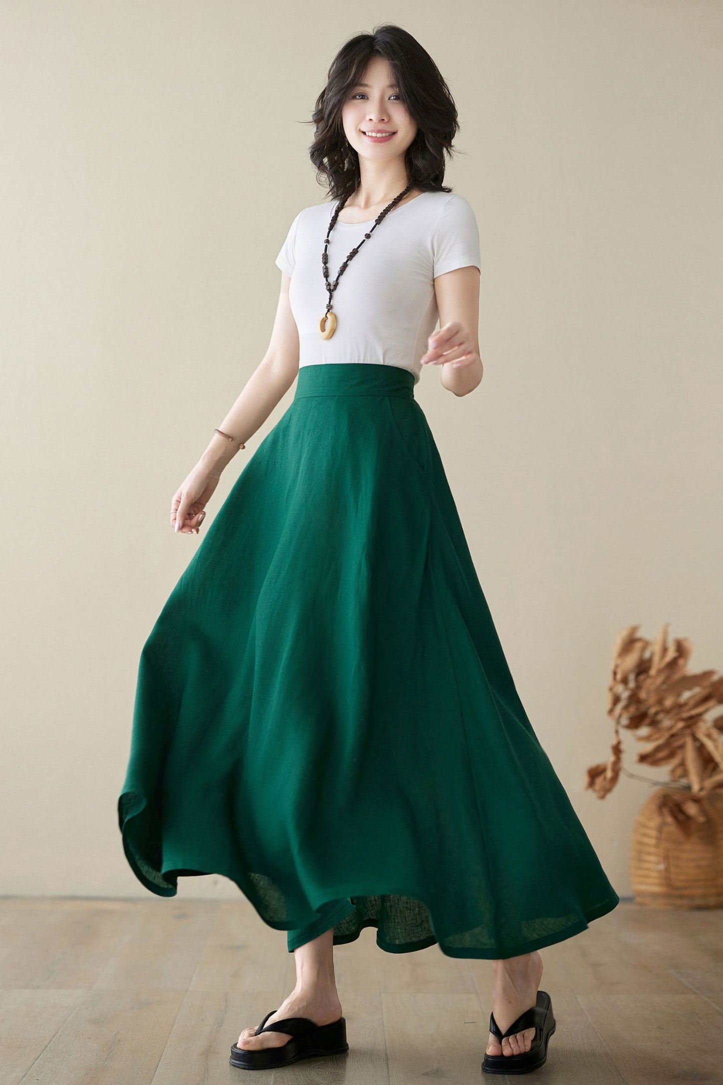 Green Linen Maxi Skirt with pockets 4974