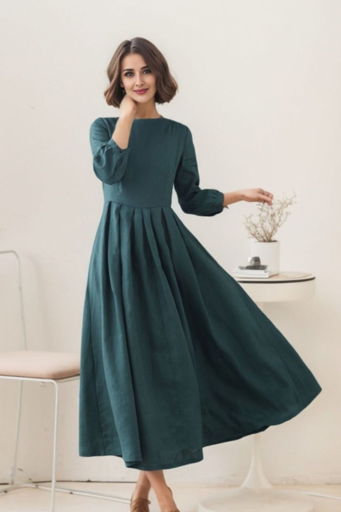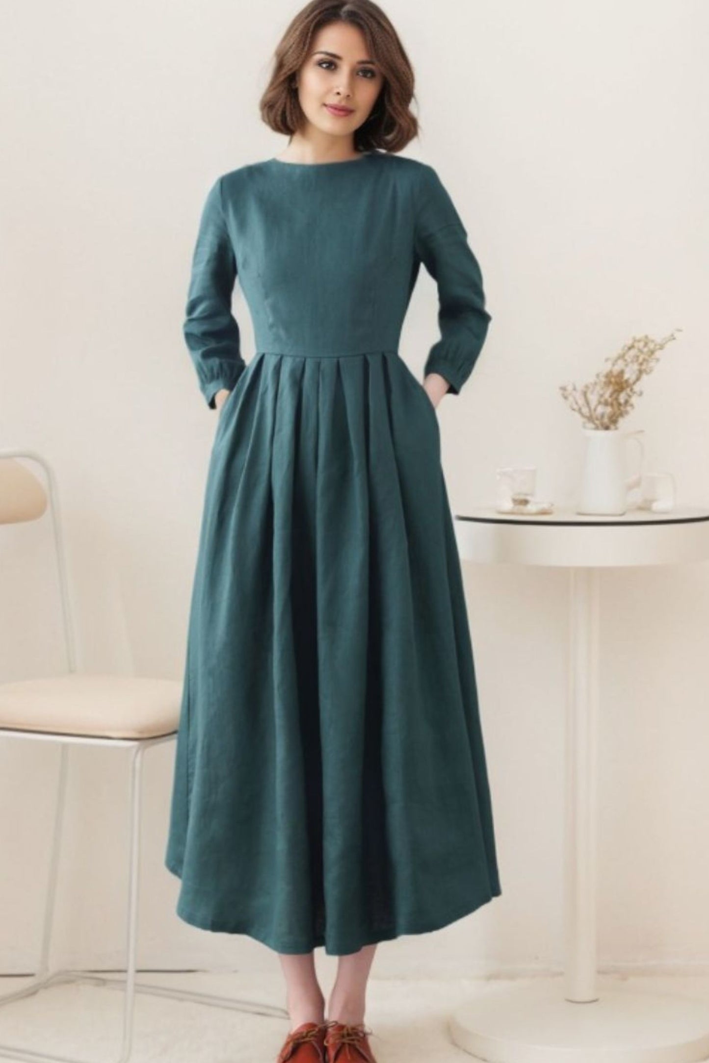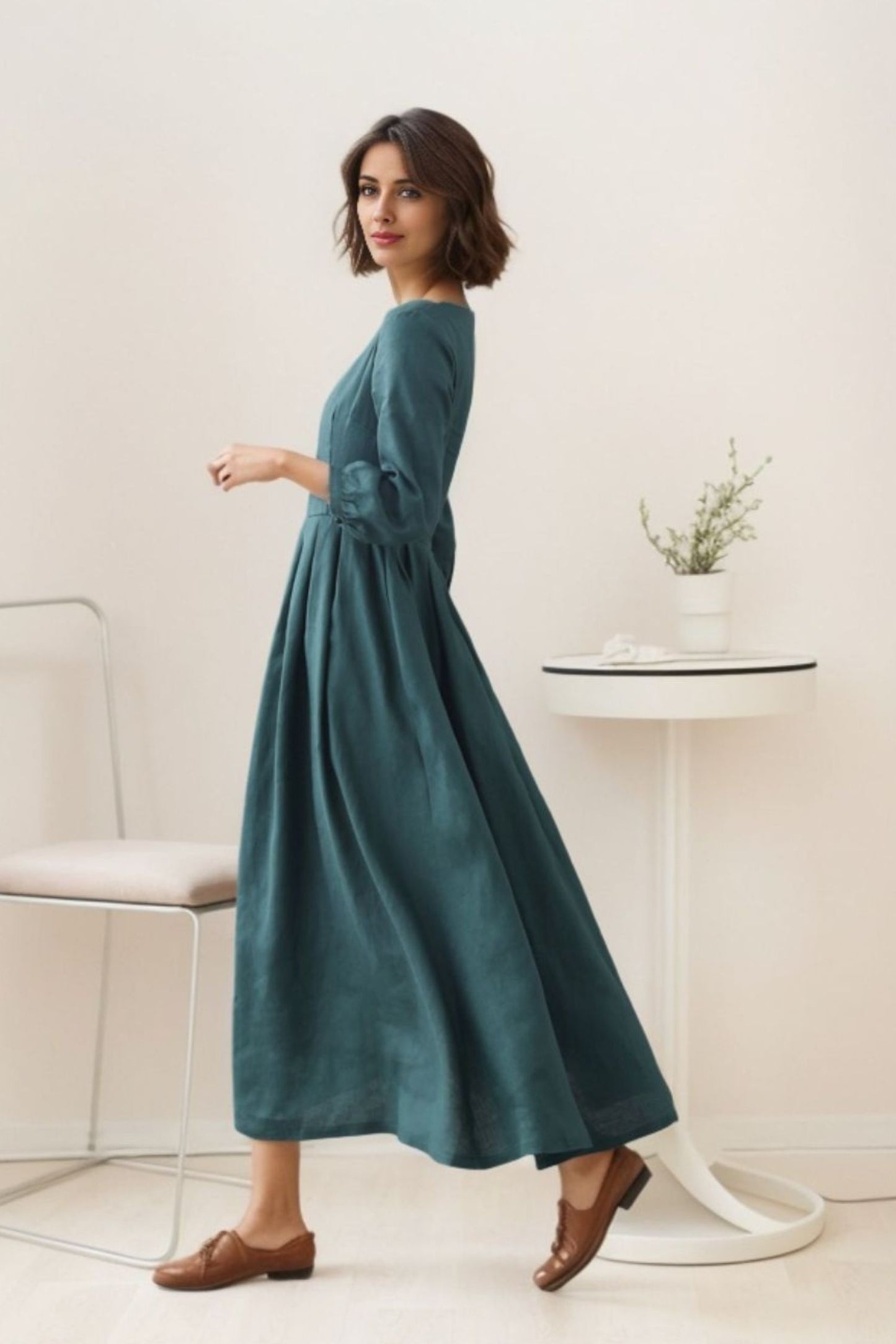 Green Linen Maxi Swing Dress - Flowy A-Line Design 5513