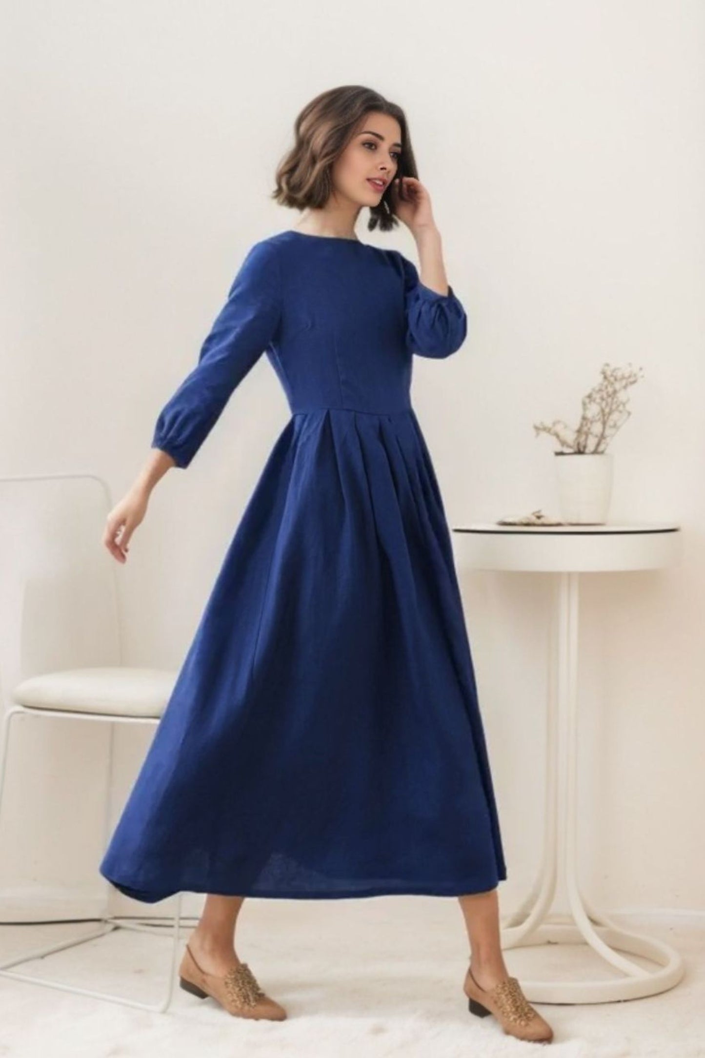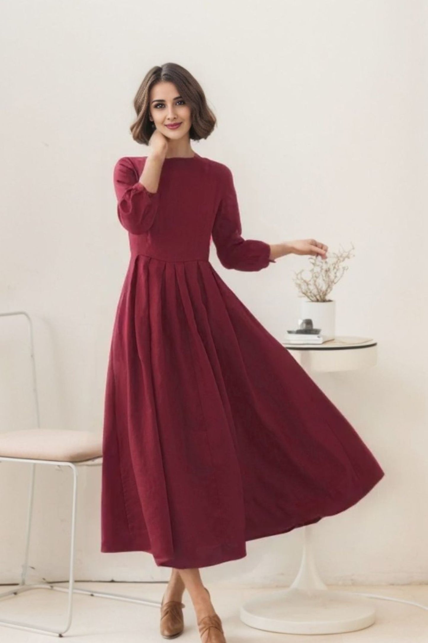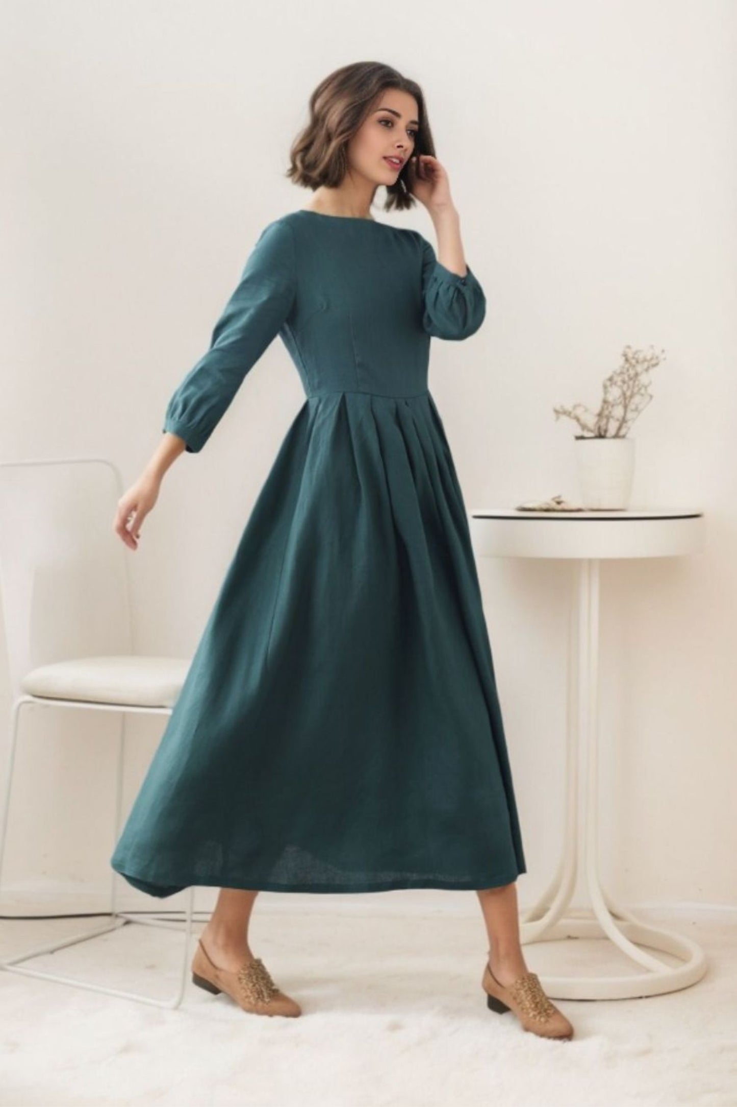 Green Linen Maxi Swing Dress - Flowy A-Line Design 5513
