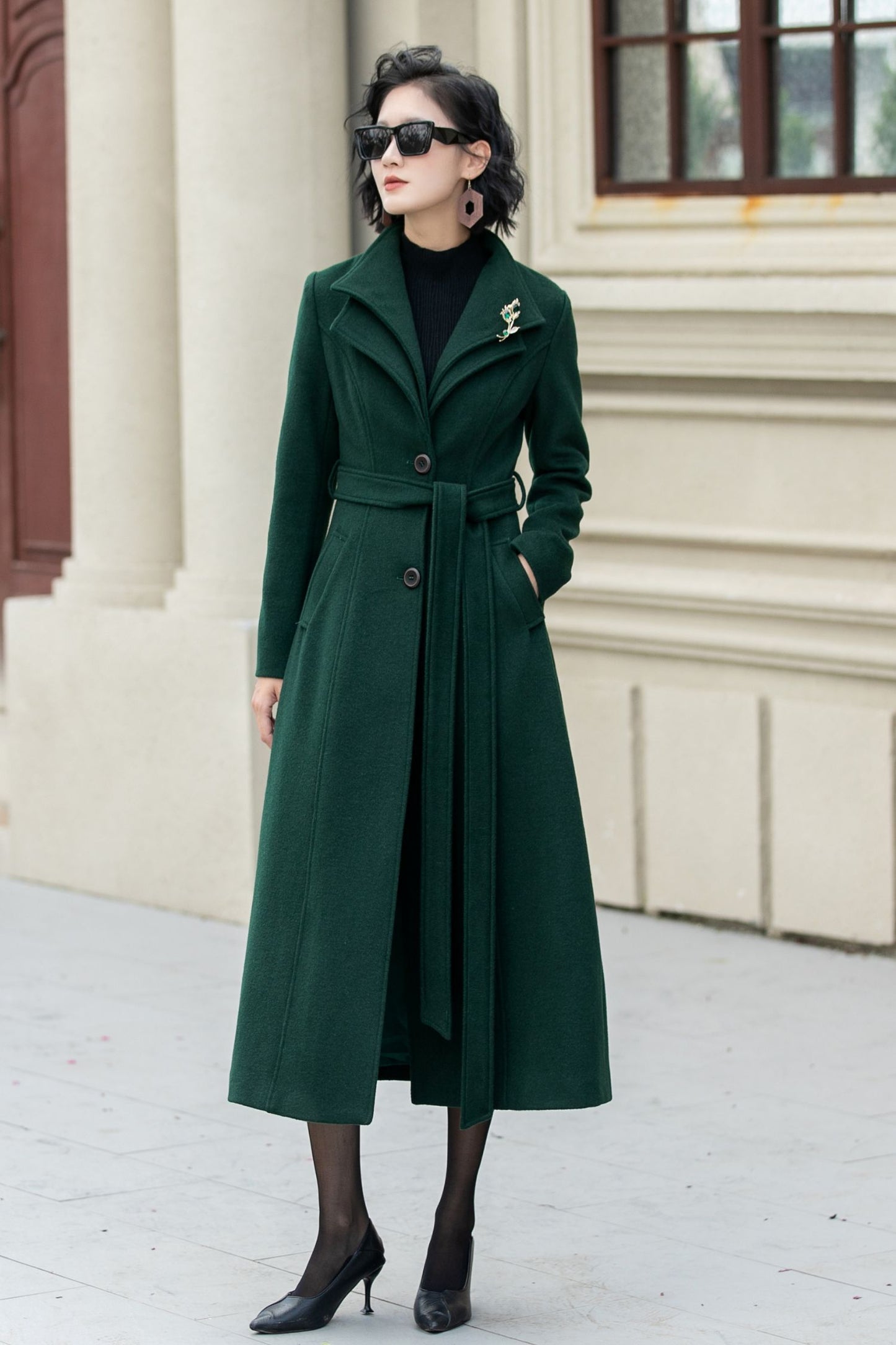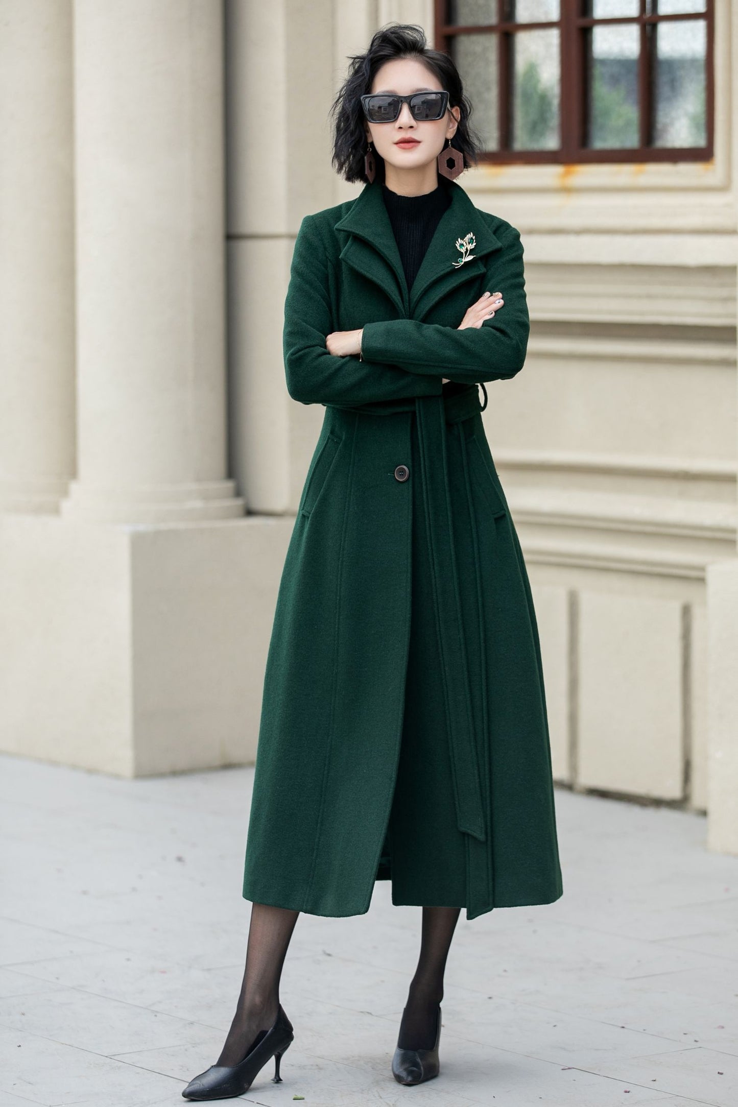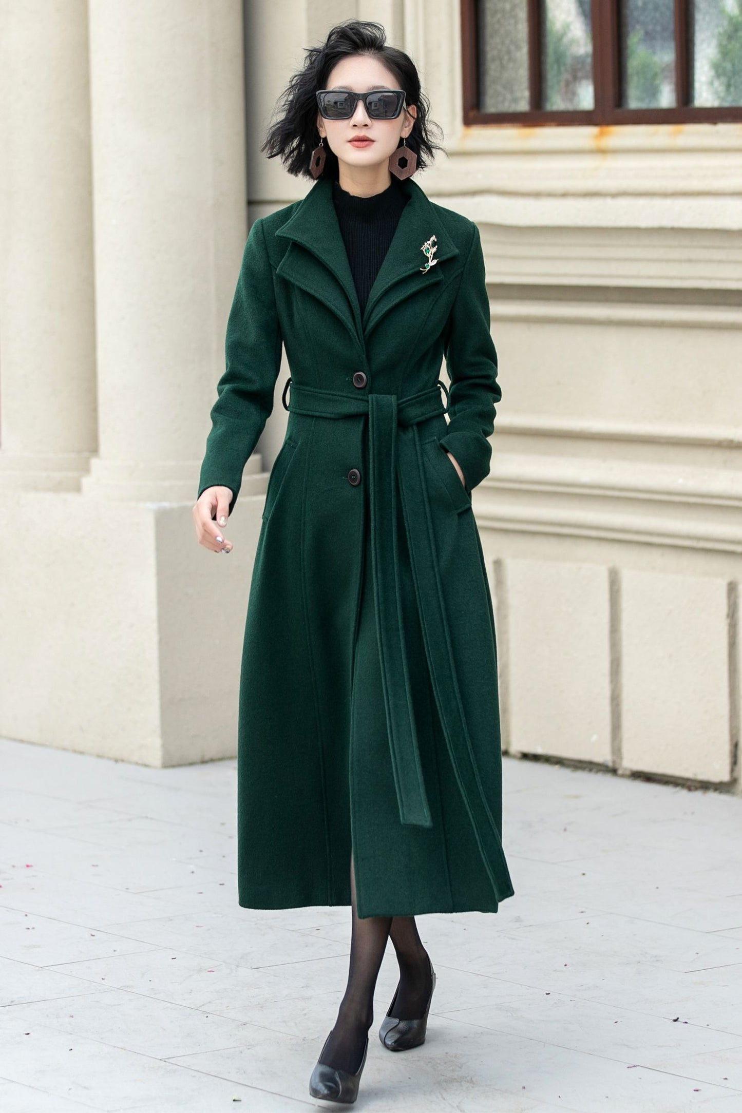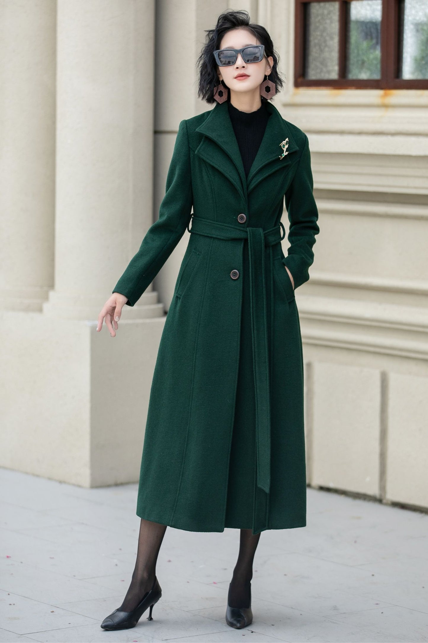 This stunning green wool coat is the perfect blend of elegance and functionality. Crafted from high-quality wool, it features a flared silhouette that adds a touch of sophistication to any outfit. The coat is designed with a notched lapel collar and long sleeves, providing both style and warmth.