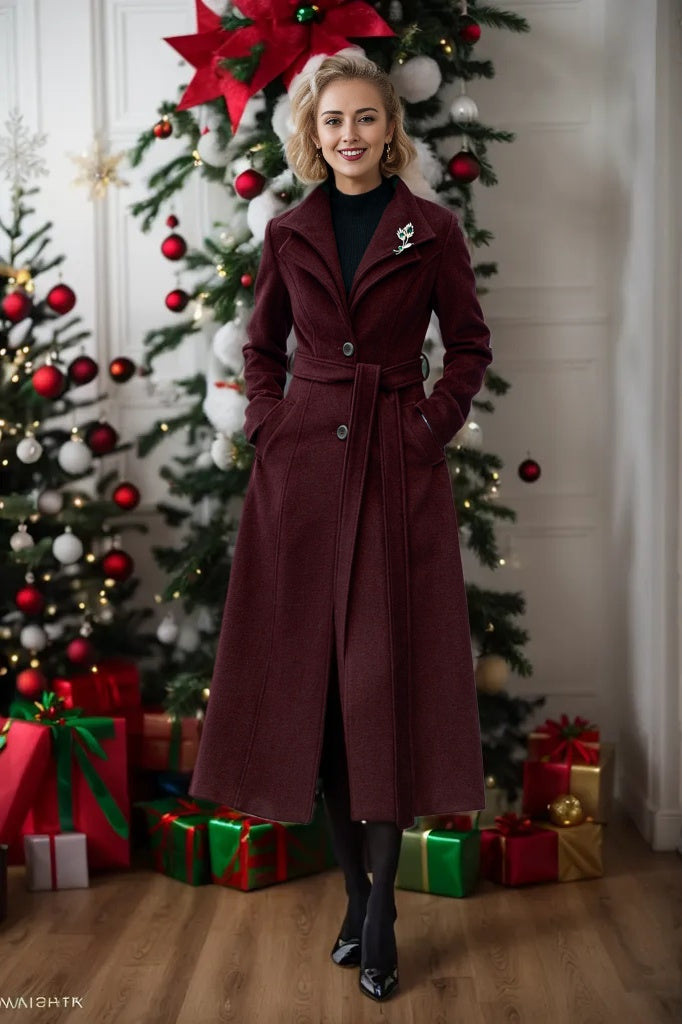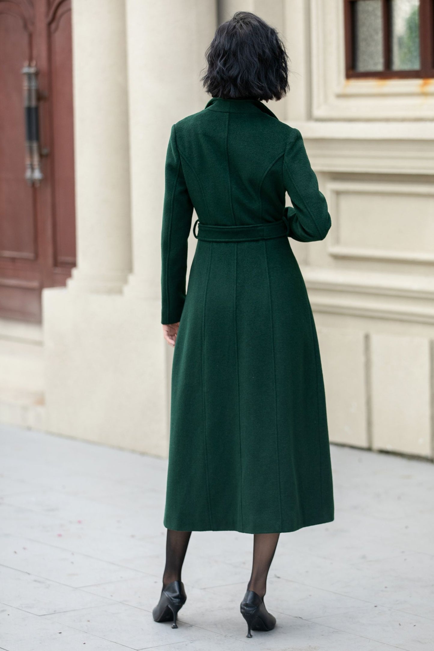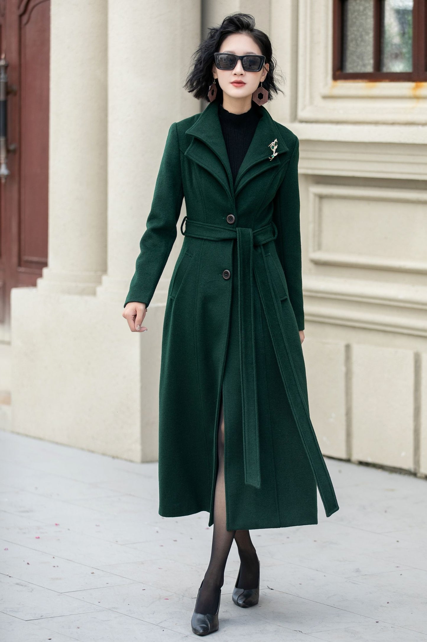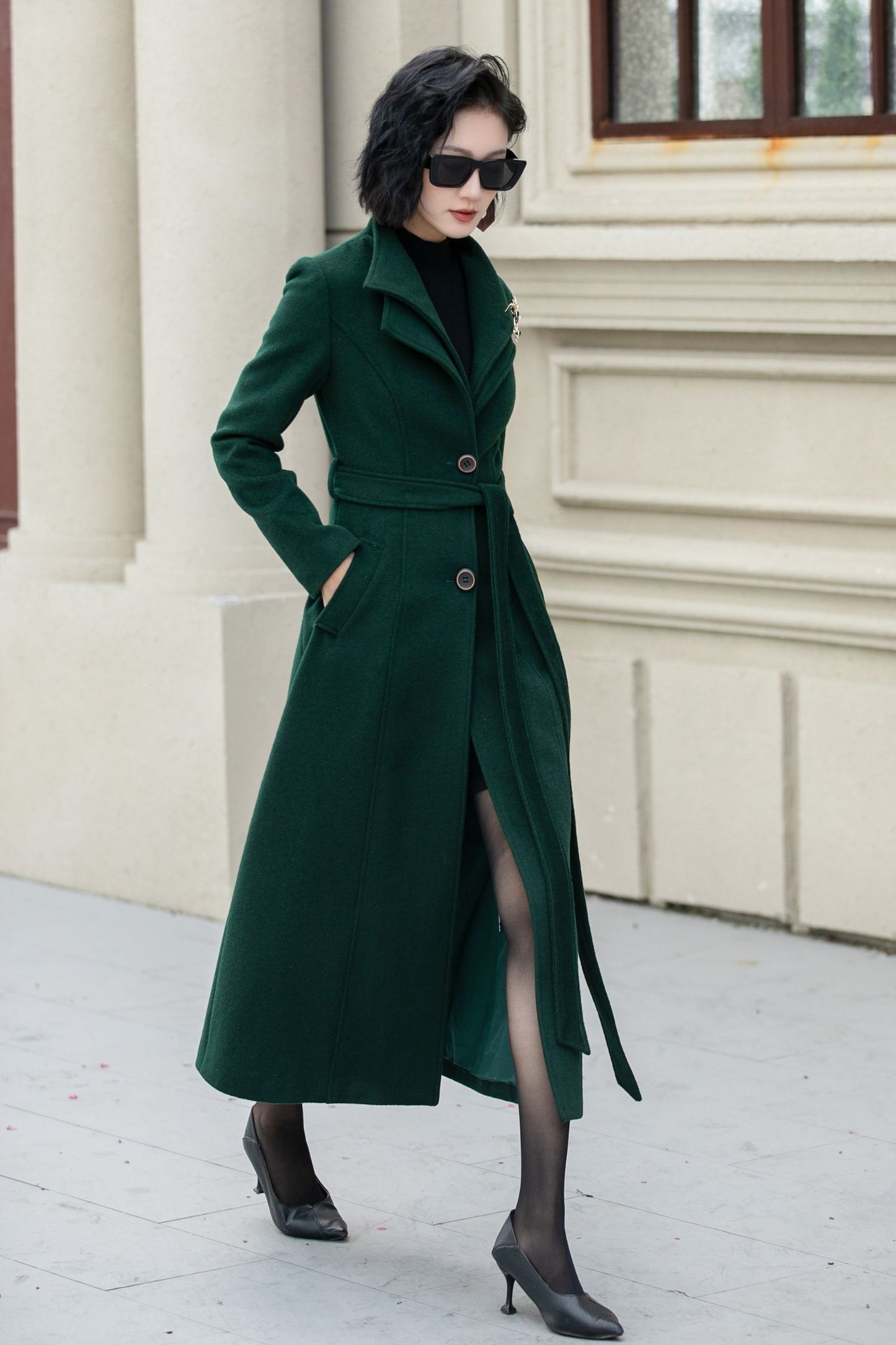 This stunning green wool coat is the perfect blend of elegance and functionality. Crafted from high-quality wool, it features a flared silhouette that adds a touch of sophistication to any outfit. The coat is designed with a notched lapel collar and long sleeves, providing both style and warmth.