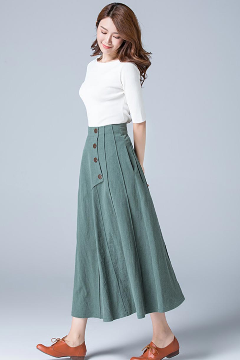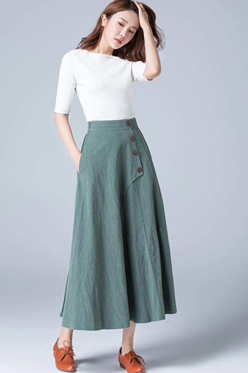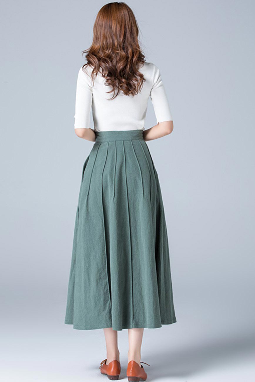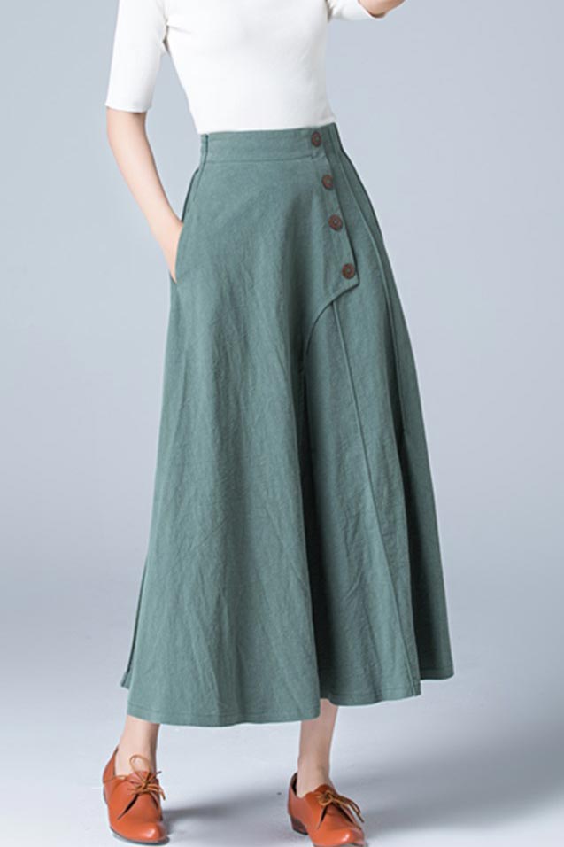Our green linen skirt is styled with a fitted waist that nips in the silhouette above a full skirt that gently swishes as you move. finished with bottons decoration in front and pleating on the back, practical side seam pockets.