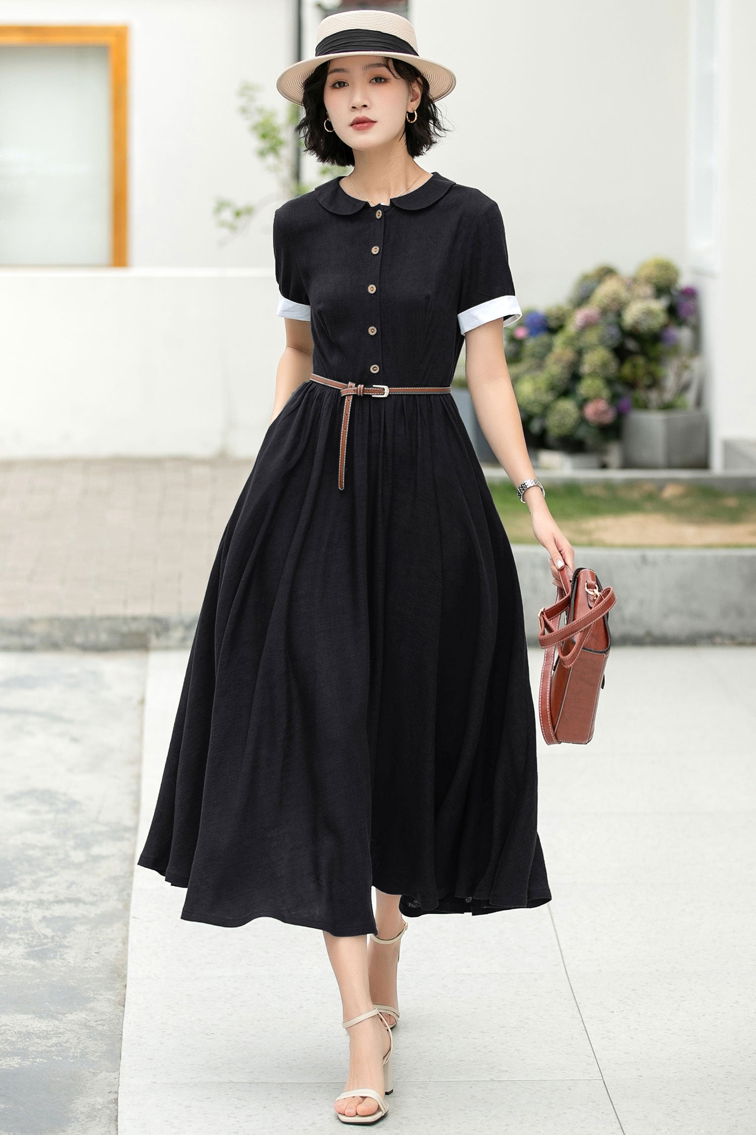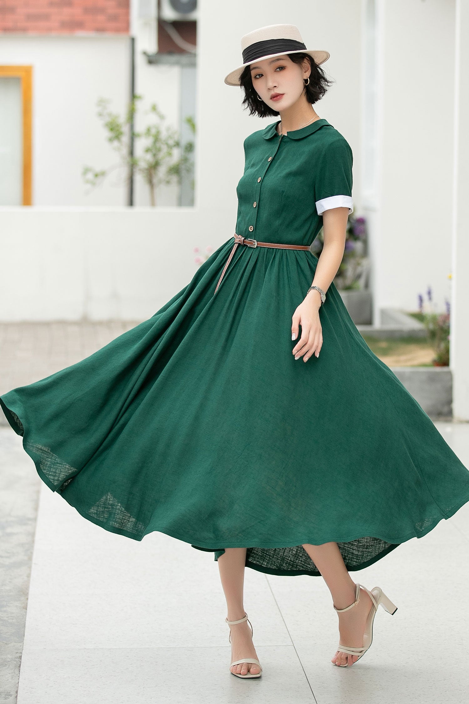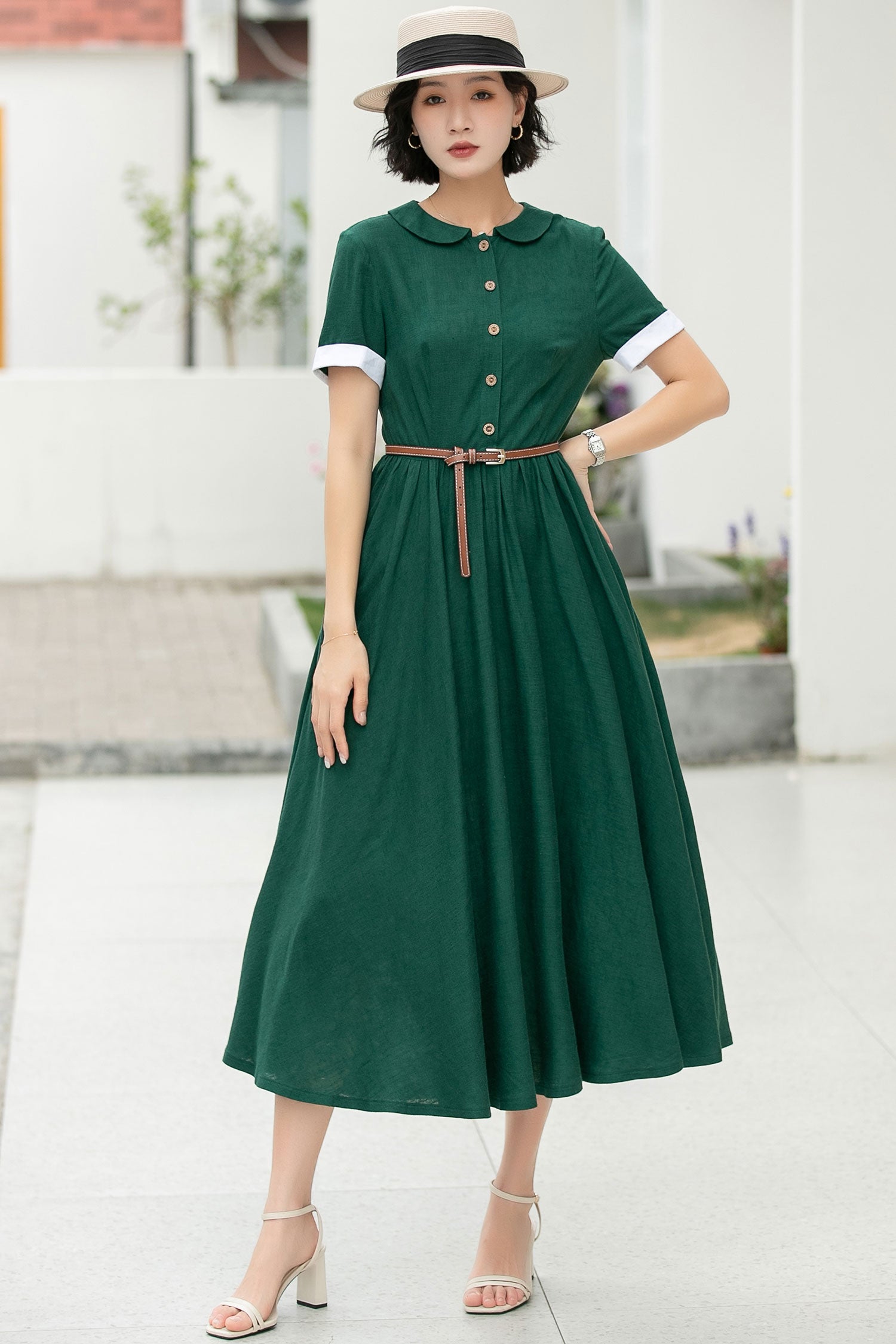 Step into timeless elegance with this green midi dress. Its classic Peter Pan collar and short sleeves with white cuffs exude a preppy - chic allure. Crafted from soft, breathable fabric, it's ideal for any spring or summer occasion. A wardrobe staple you'll cherish!
