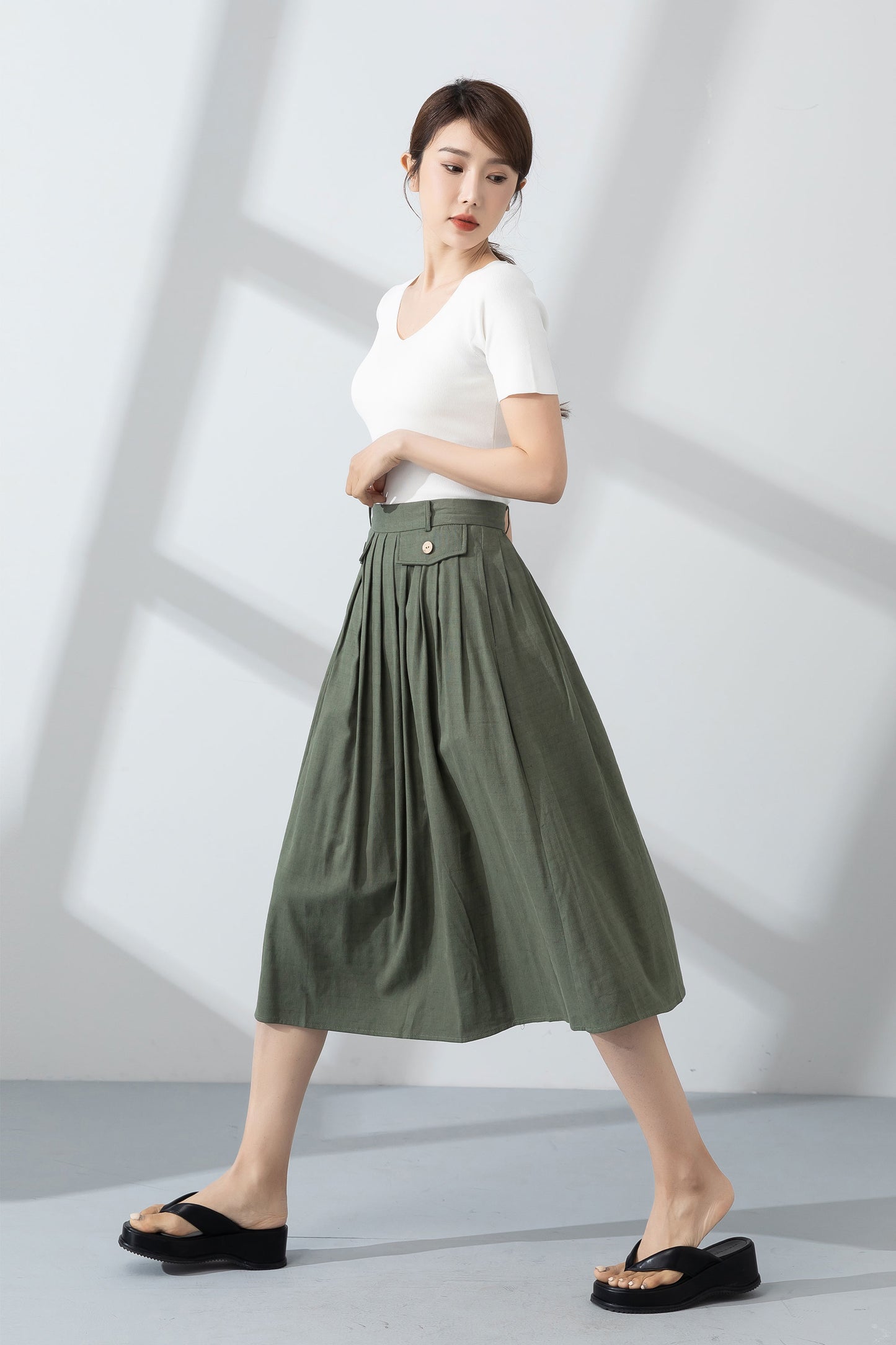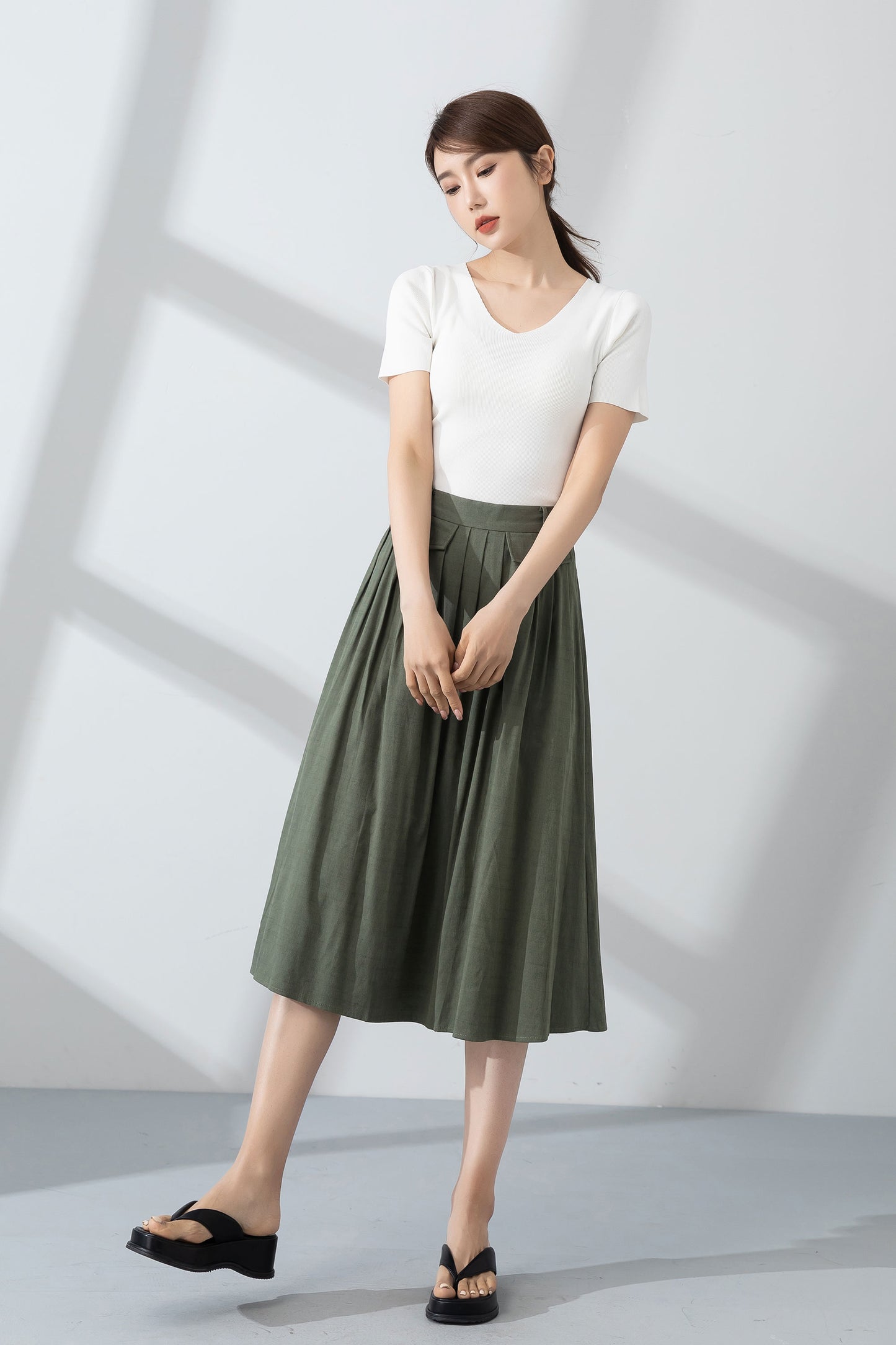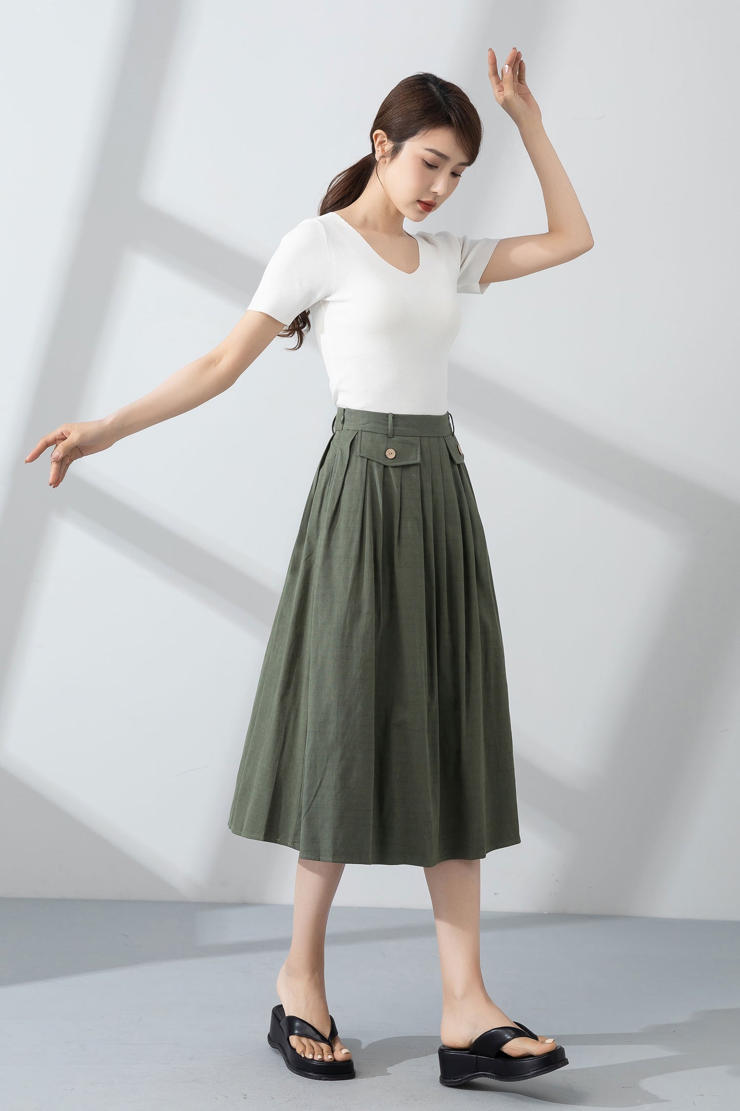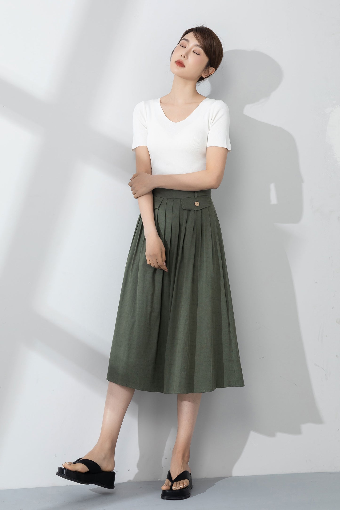 Green pleated linen skirt for women summer 4232