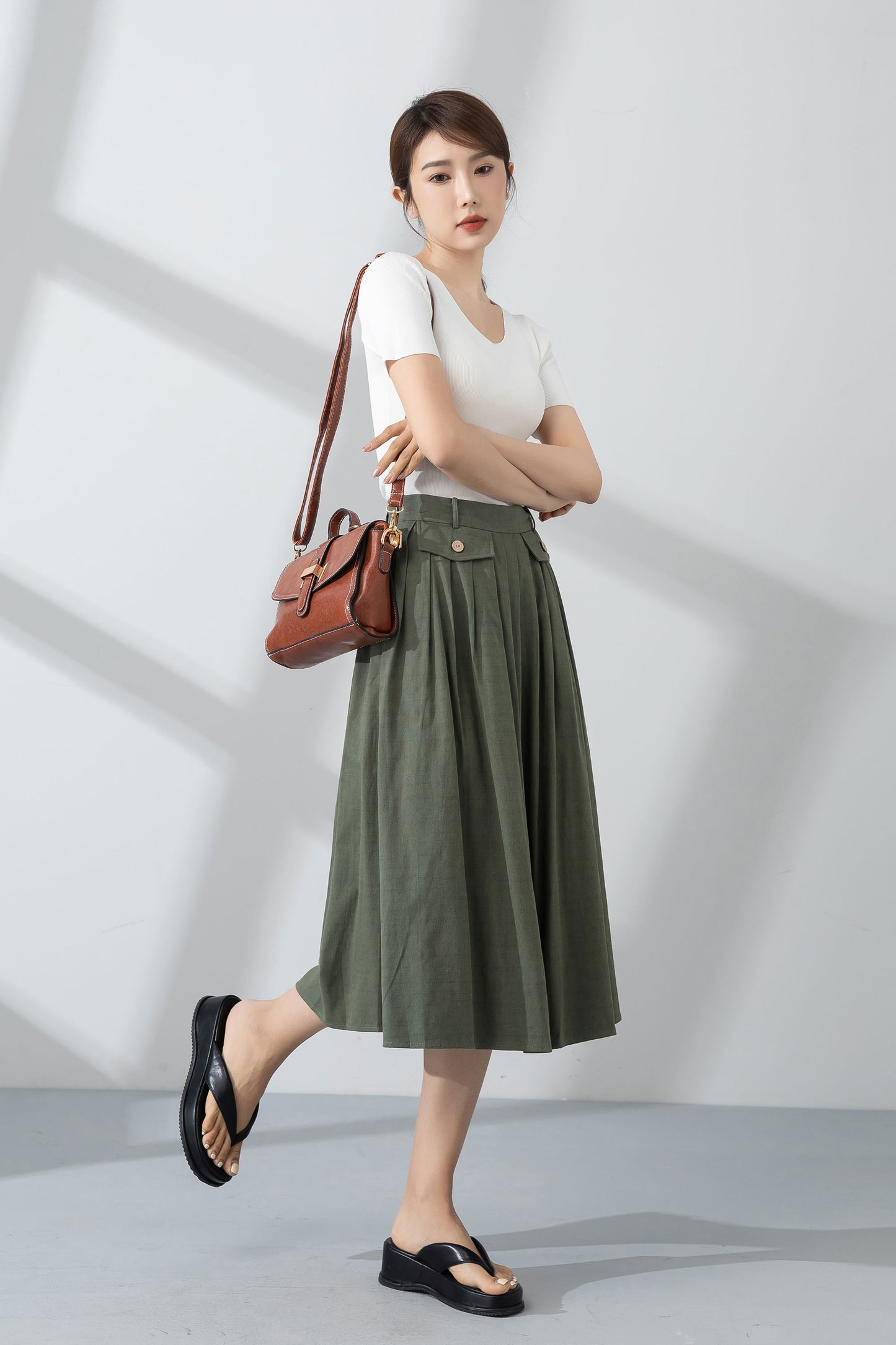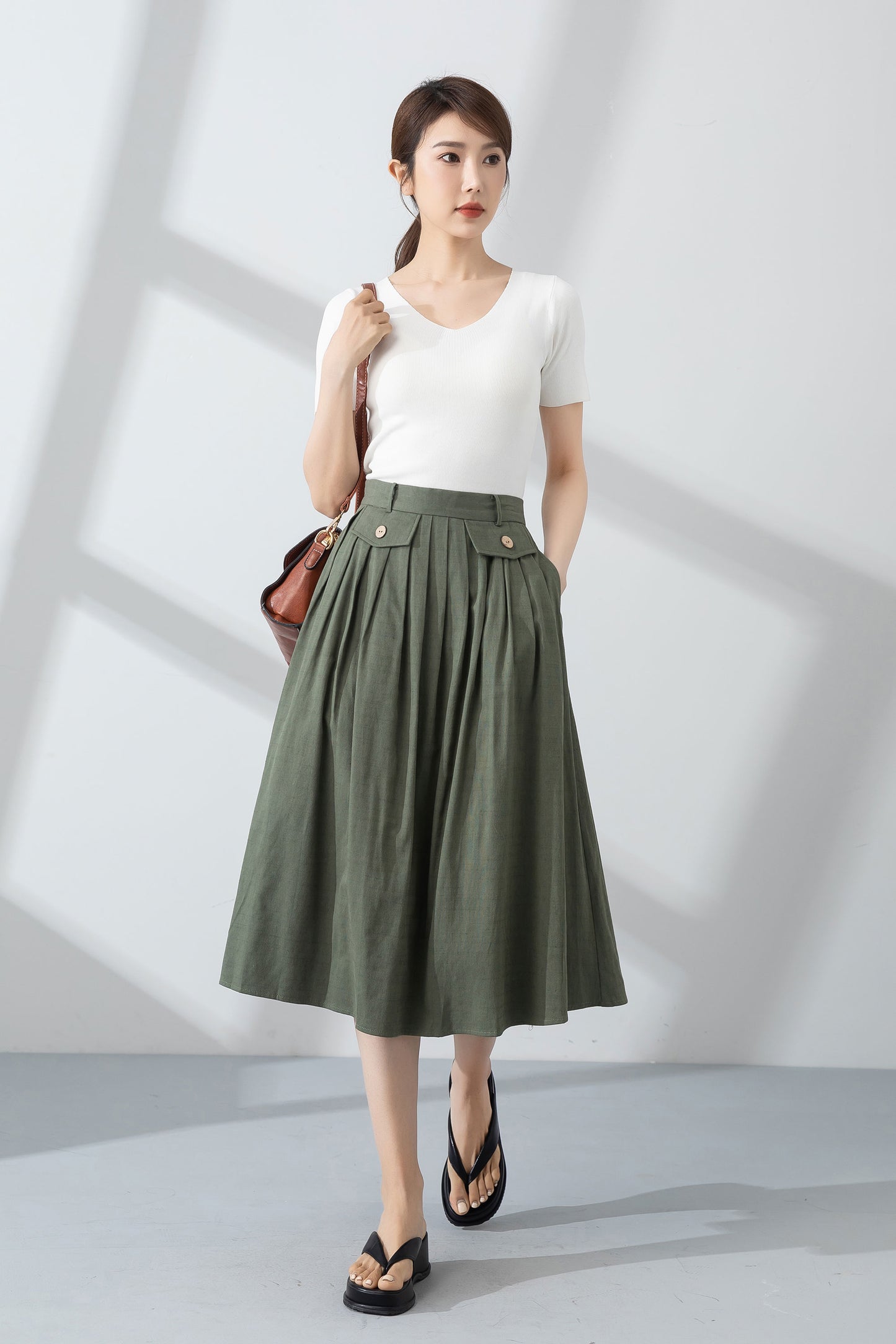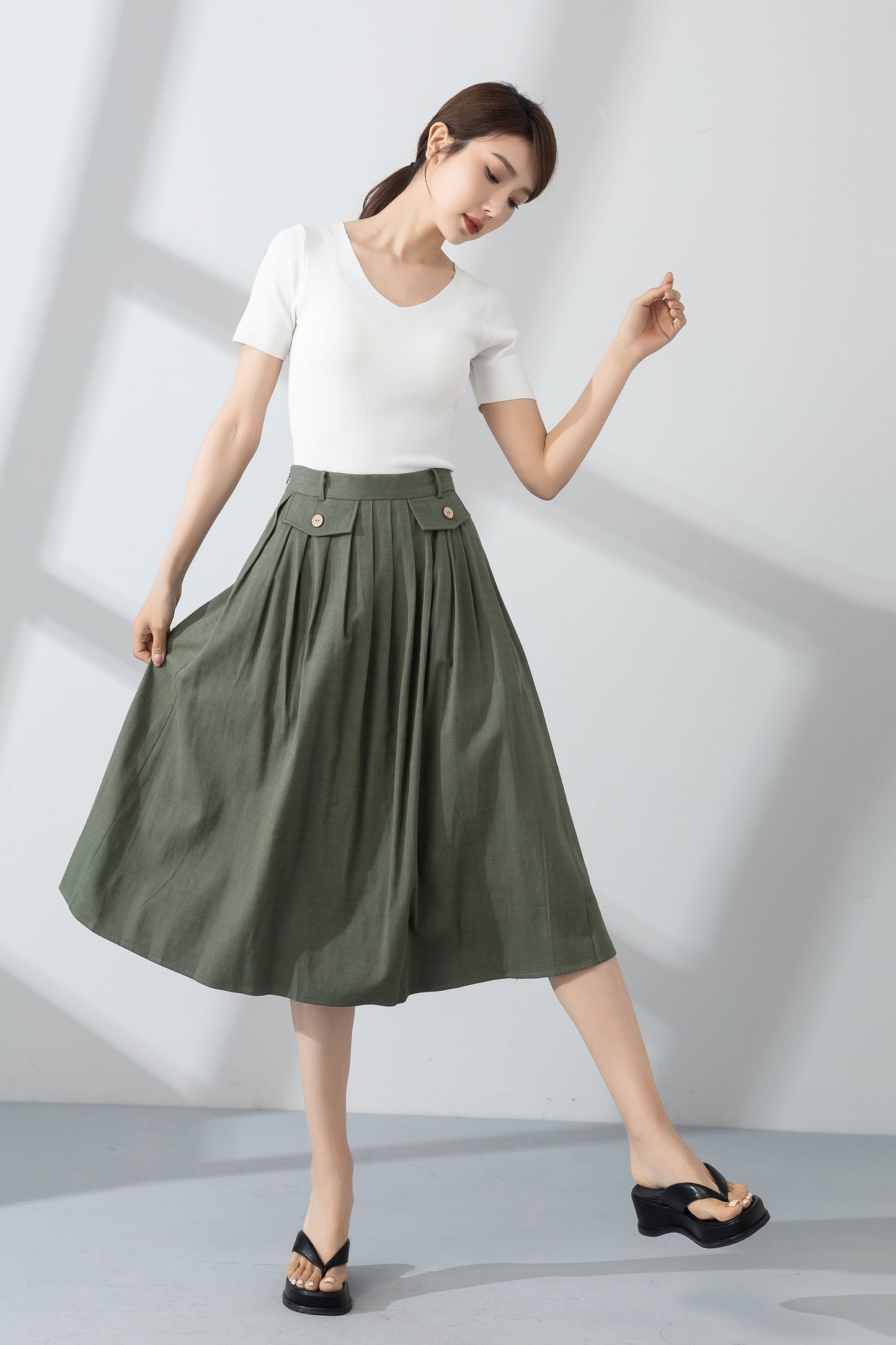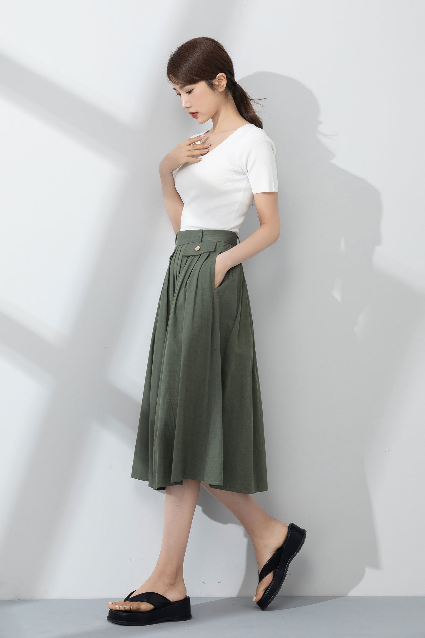 Green pleated linen skirt for women summer 4232