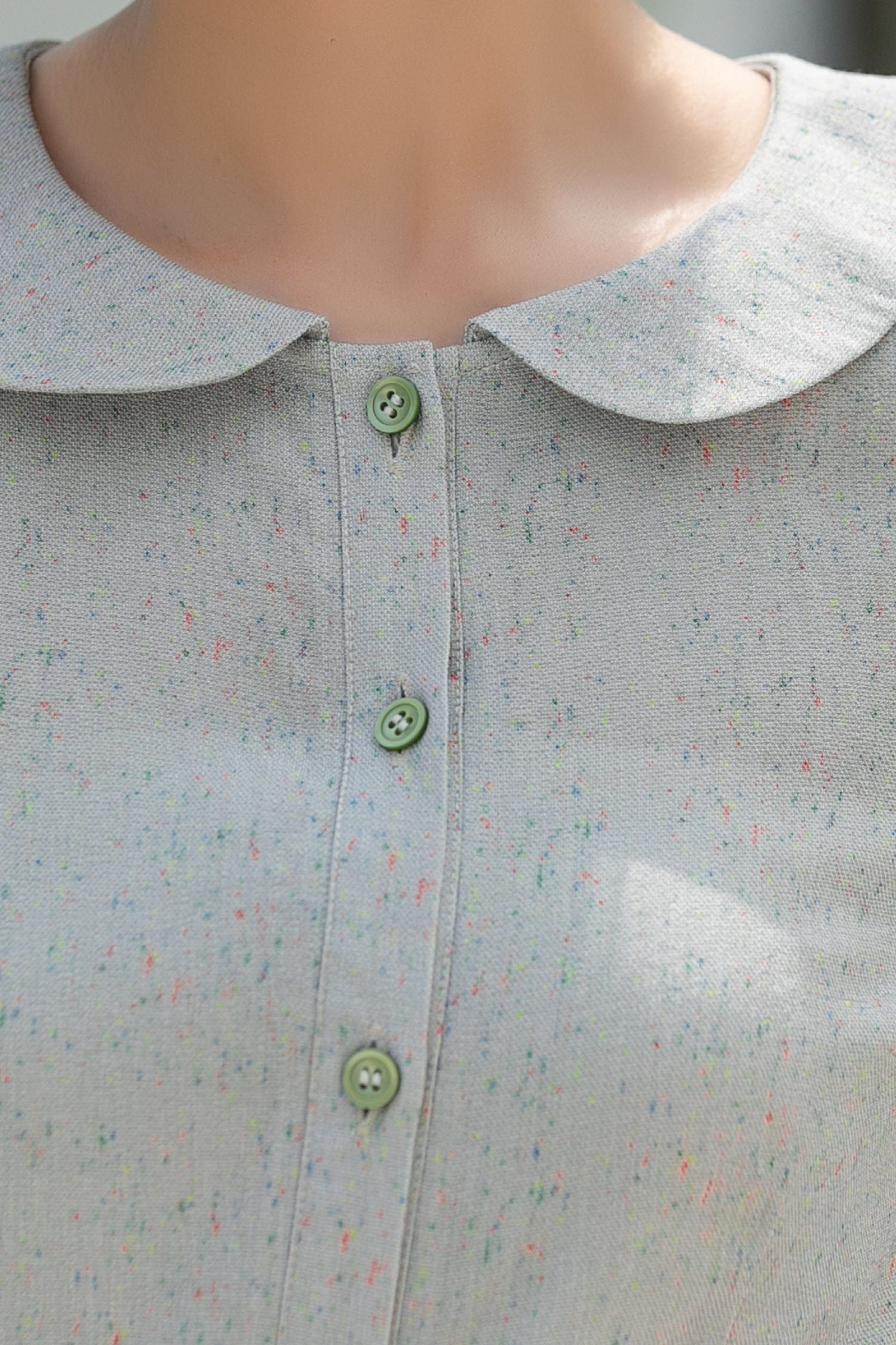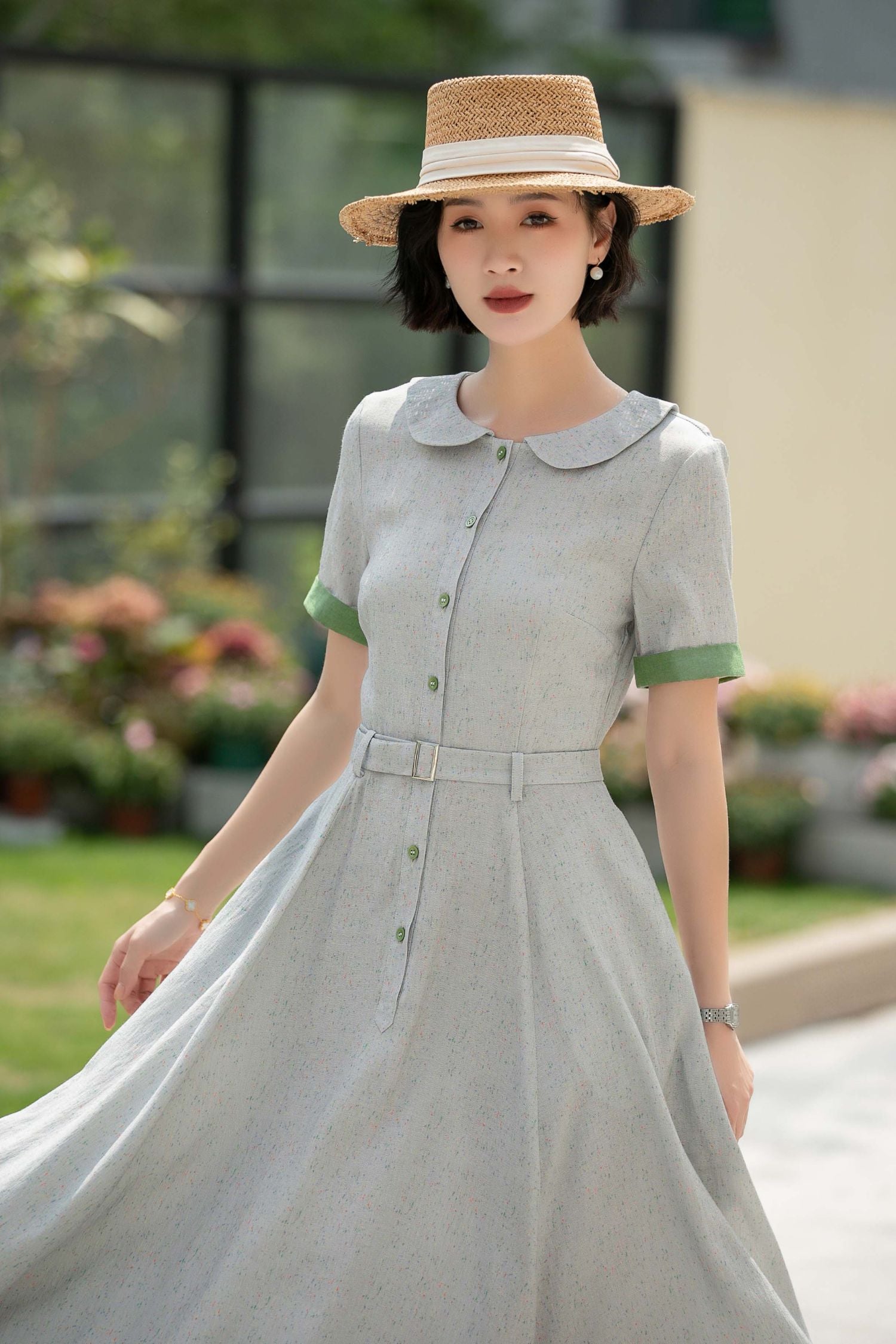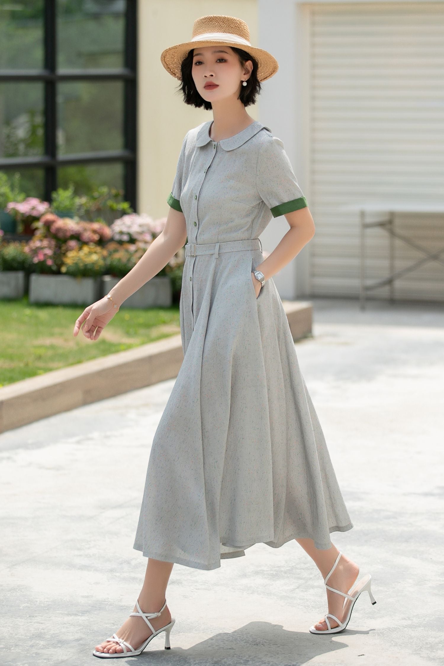 This dress exudes a charming vintage - inspired vibe. It features a sweet Peter Pan collar and short sleeves with green trim for a pop of color. The button - down front adds a classic touch, and the waist belt cinches to flatter your figure. Made from light fabric, it has a flowing midi - length skirt. Perfect for spring and summer, it combines comfort and style.