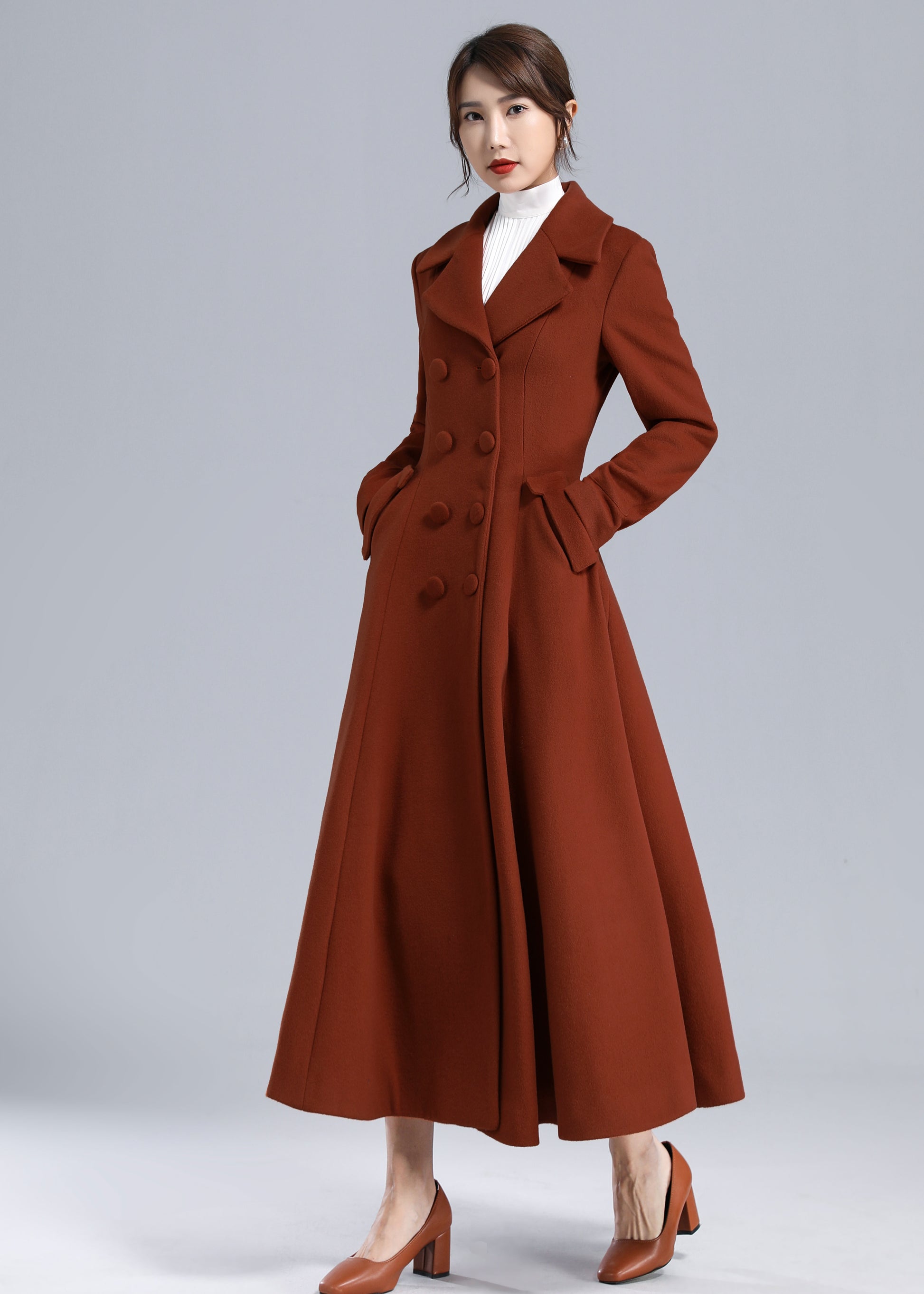 Rust Red Wool Maxi Coat – Statement Double Breasted Swing Overcoat 5495