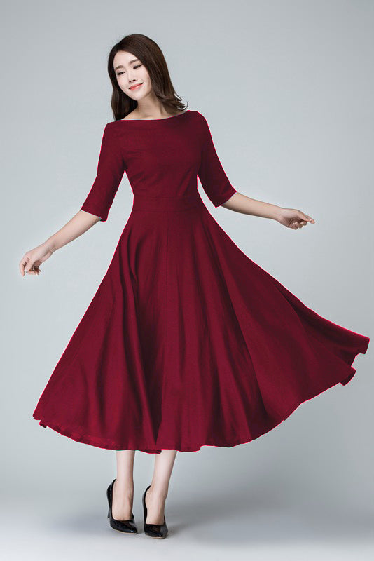 Make a striking entrance with this handmade red linen-cotton midi dress, a piece designed for special moments. Its deep red hue and flowing fit-and-flare cut create an aura of confidence and grace, perfect for festive dinners, holiday gatherings, or formal celebrations. Featuring a round neckline, half sleeves, and seam pockets, this dress combines practical comfort with timeless elegance. A versatile choice that transitions effortlessly from day to evening, embodying sophistication for every occasion.