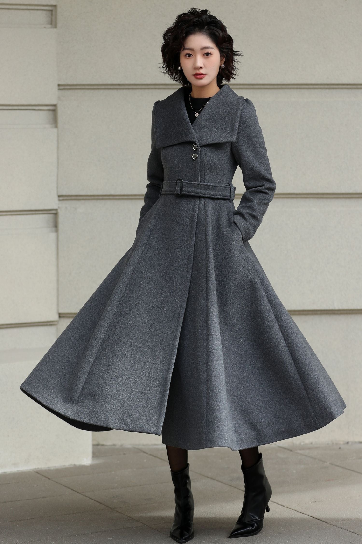 The softly folded collar frames the neckline with understated elegance, while the fitted waist and flowing A-line skirt create a flattering fit-and-flare silhouette. Finished with a matching belt and practical side pockets, this fully lined coat offers warmth, comfort, and enduring style throughout autumn and winter.
