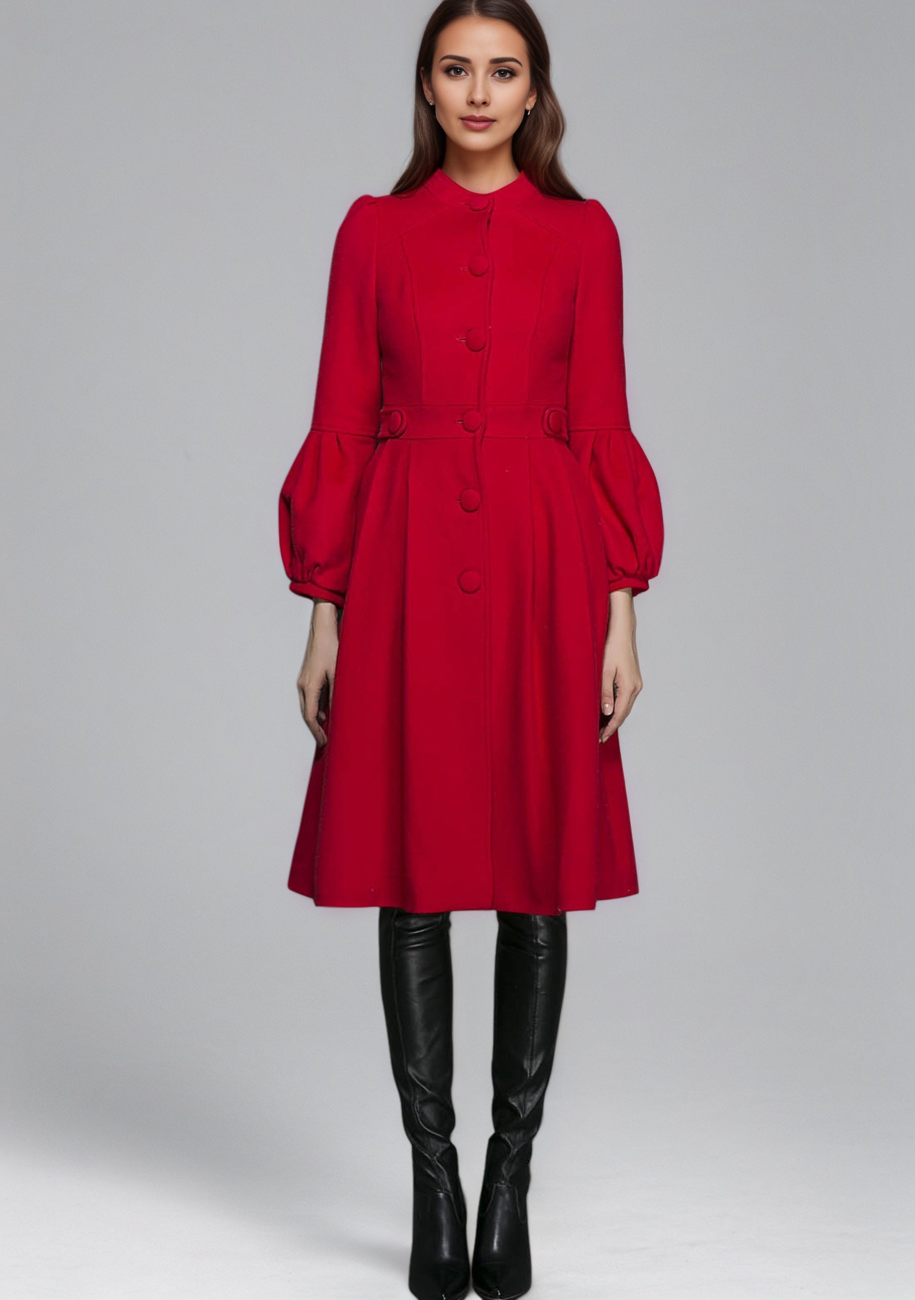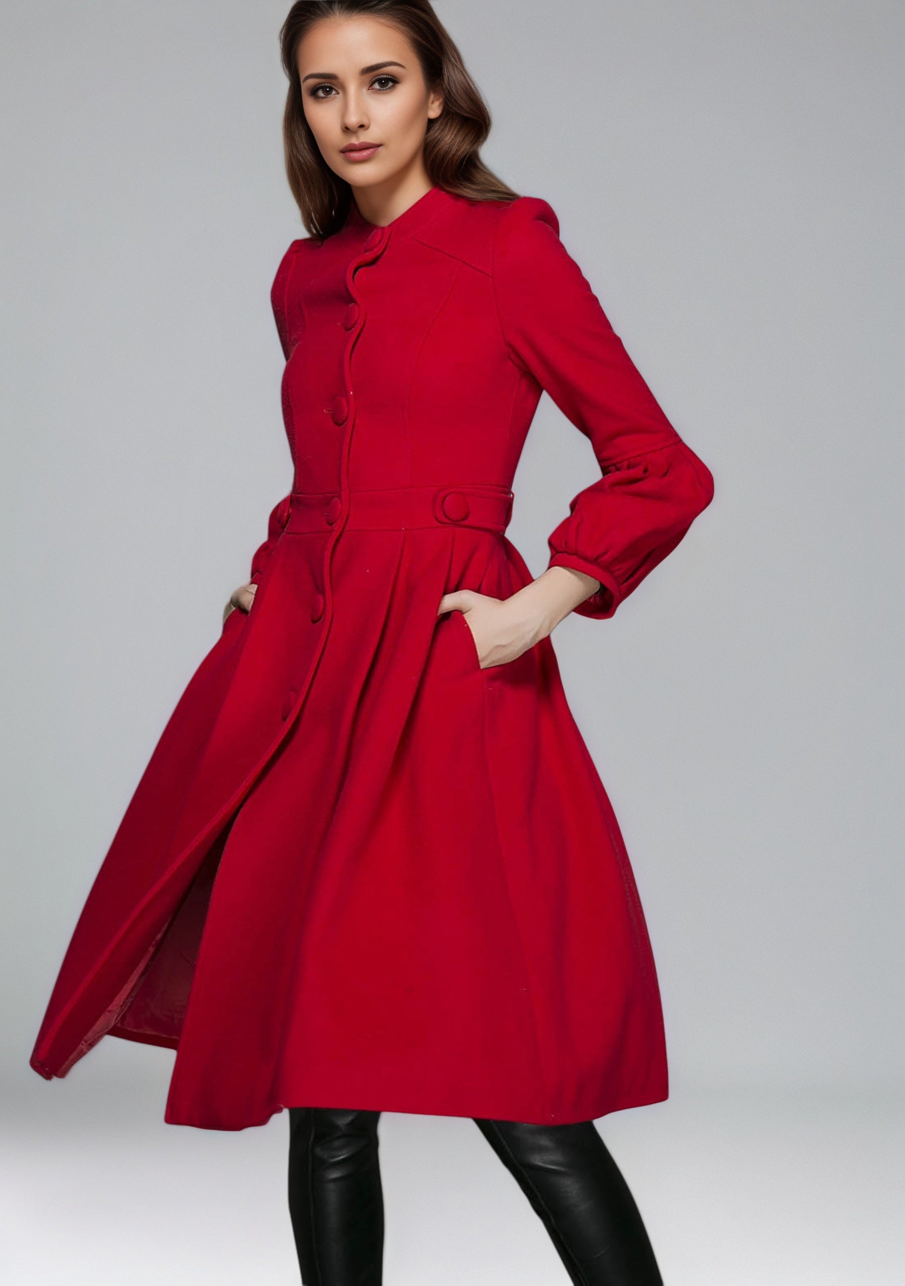 Vintage Red Wool Princess Coat – Bracelet Sleeves, Below-Knee, Pleated Skirt 6350