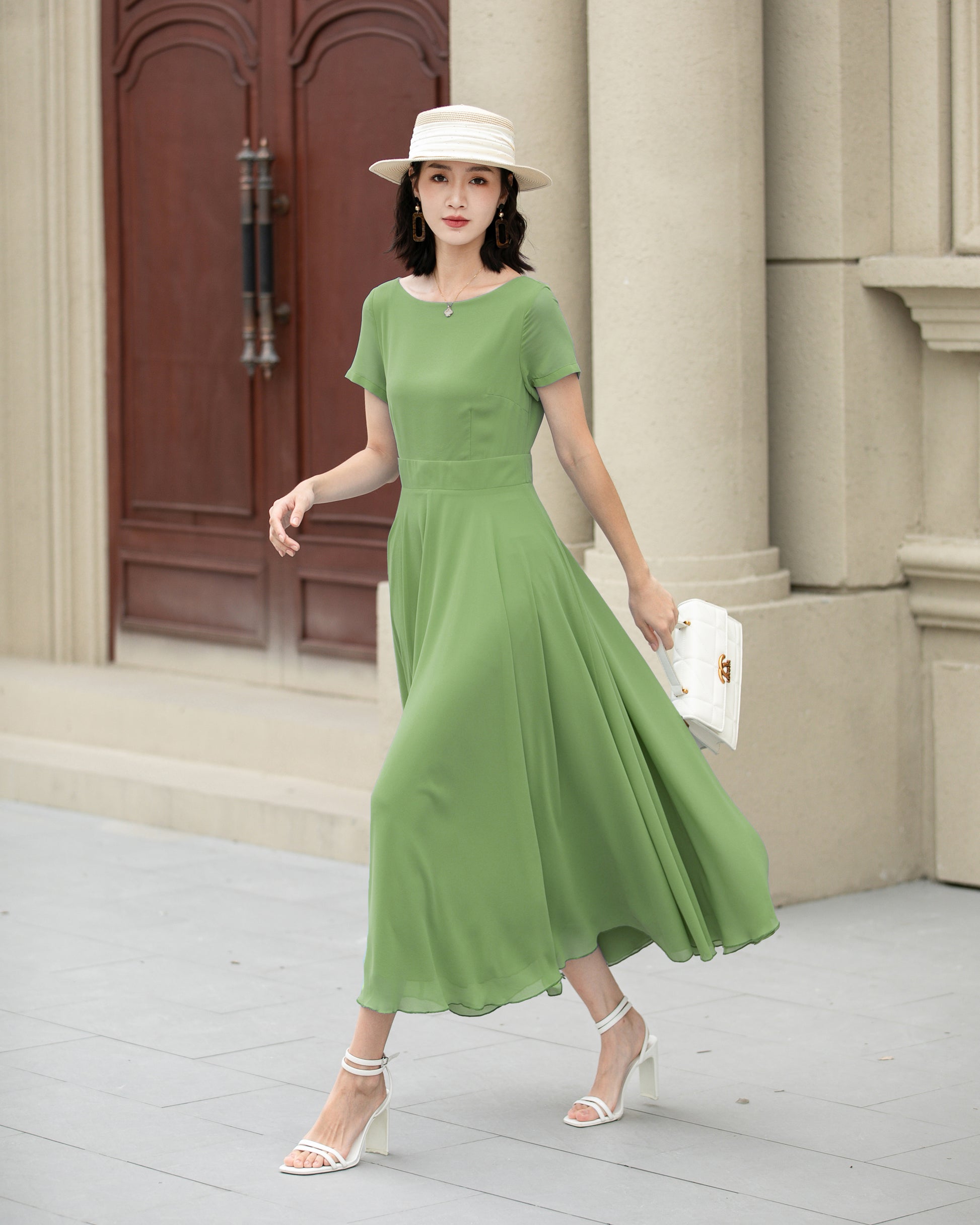Expertly handcrafted chiffon dress featuring a flattering swing fit and flared silhouette. The lightweight fabric creates elegant movement while the tailored design enhances your natural shape. Perfect for both casual and semi-formal occasions, this versatile piece combines comfort with sophisticated style.