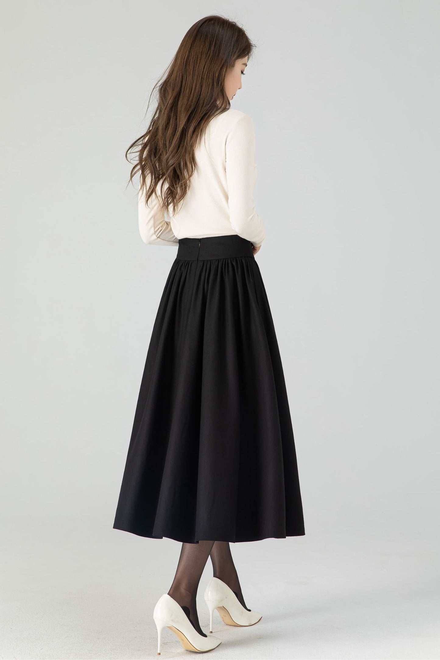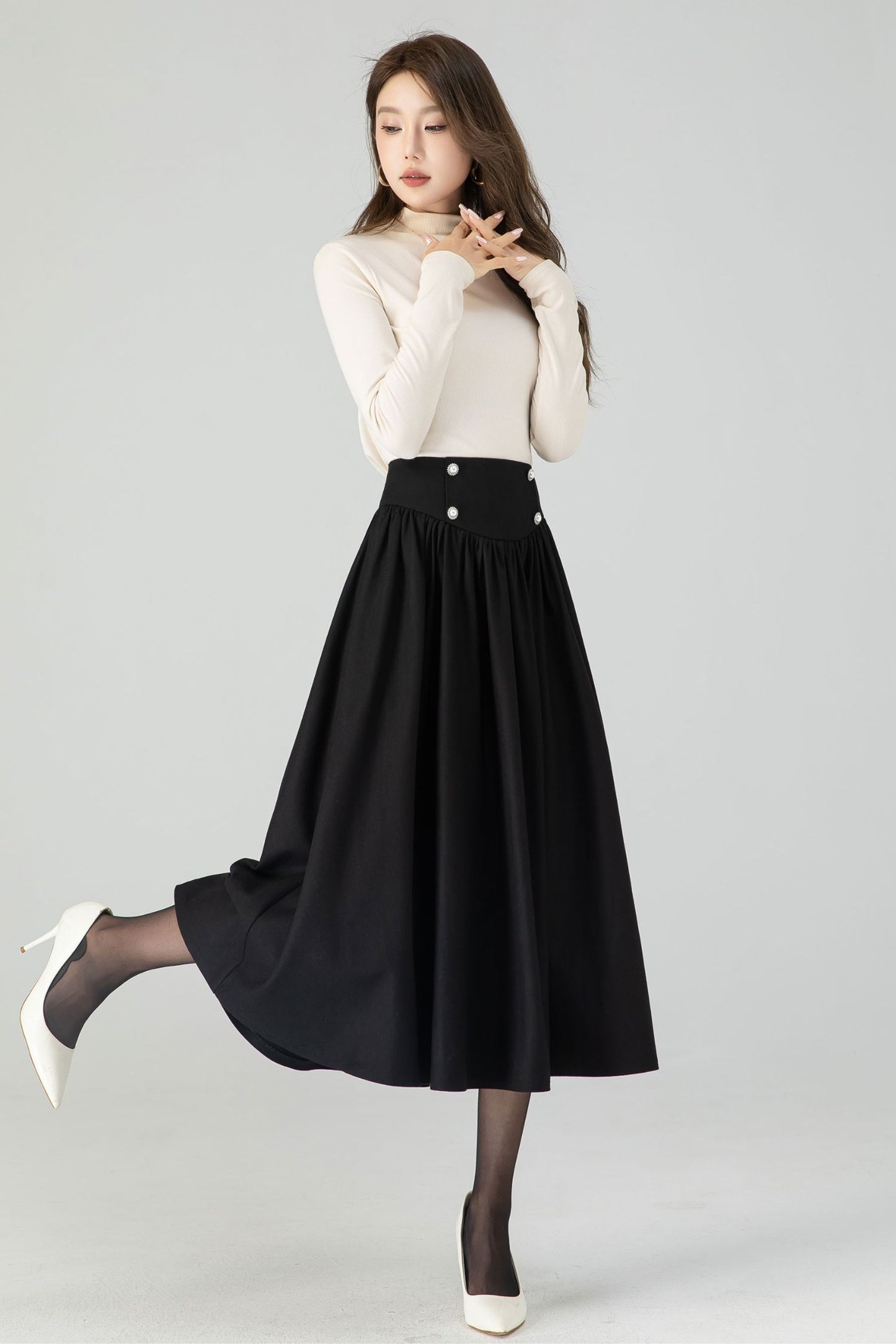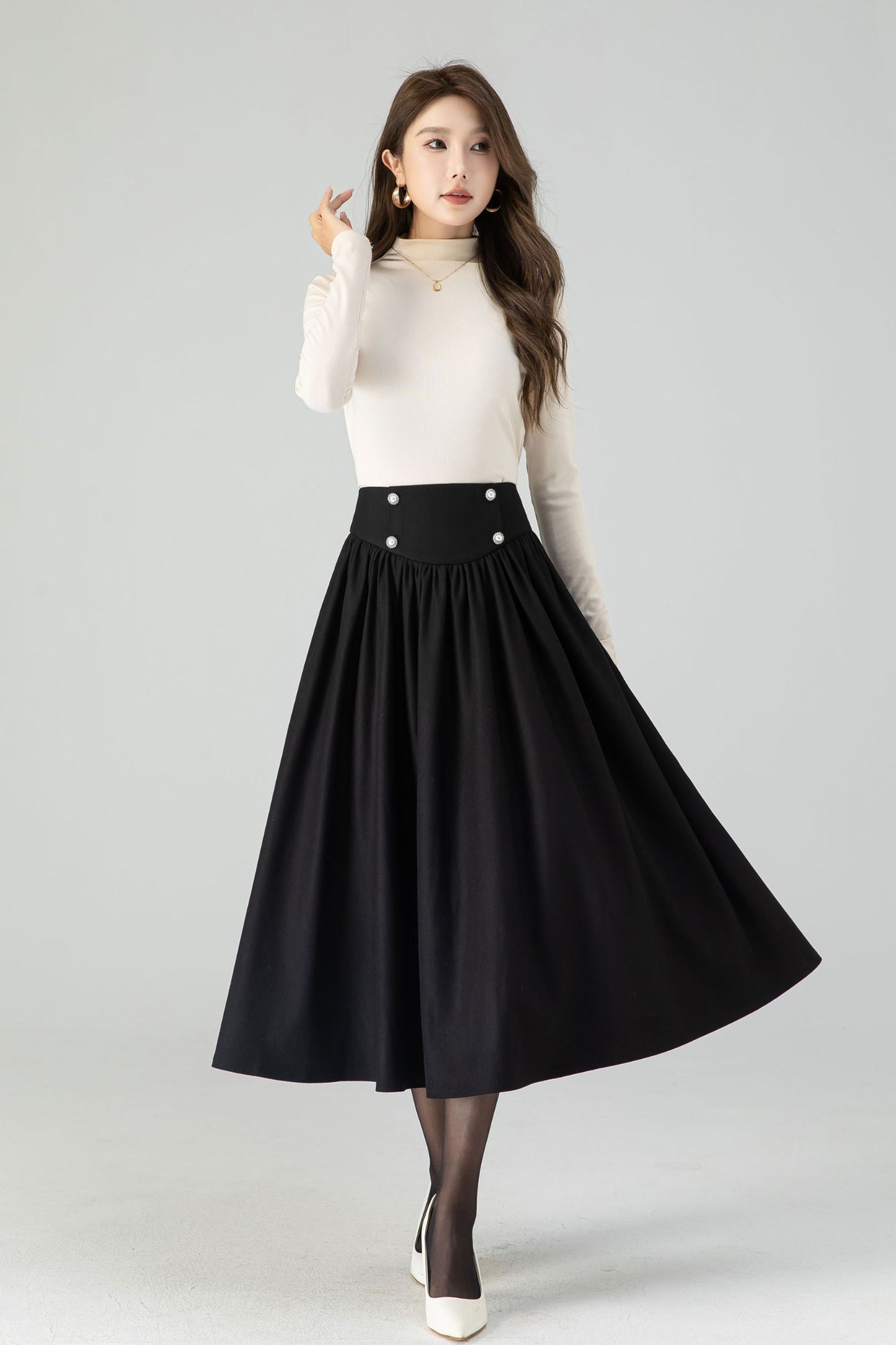 Black wool swing midi skirt featuring pleats and a button closure on the front. The classic black hue exudes timeless charm, and the premium wool fabric ensures both style and warmth. The carefully designed buttons add a touch of sophistication to your look. This versatile midi skirt effortlessly transitions from day to night, making it a must-have choice for those who appreciate both fashion and comfort.