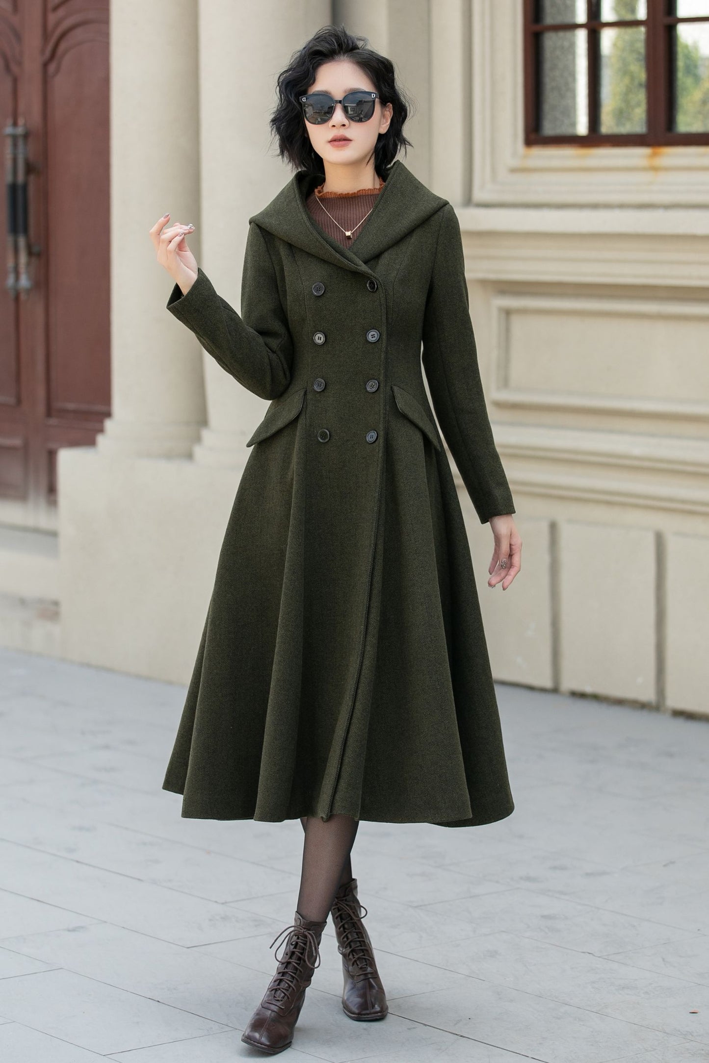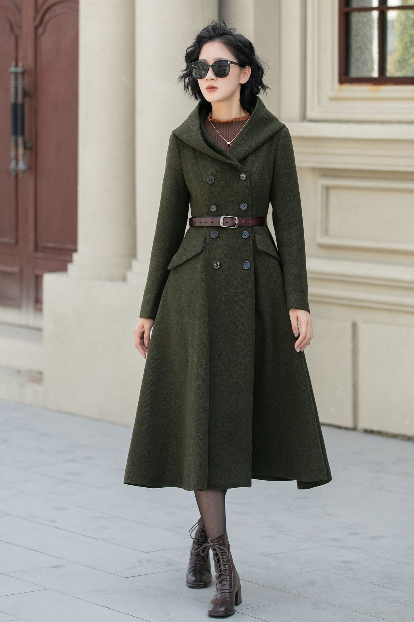 Channel timeless elegance with a touch of British military inspiration in this army green hooded wool coat. Tailored in a flattering fit-and-flare silhouette, it captures both strength and femininity, making it a true wardrobe statement.
