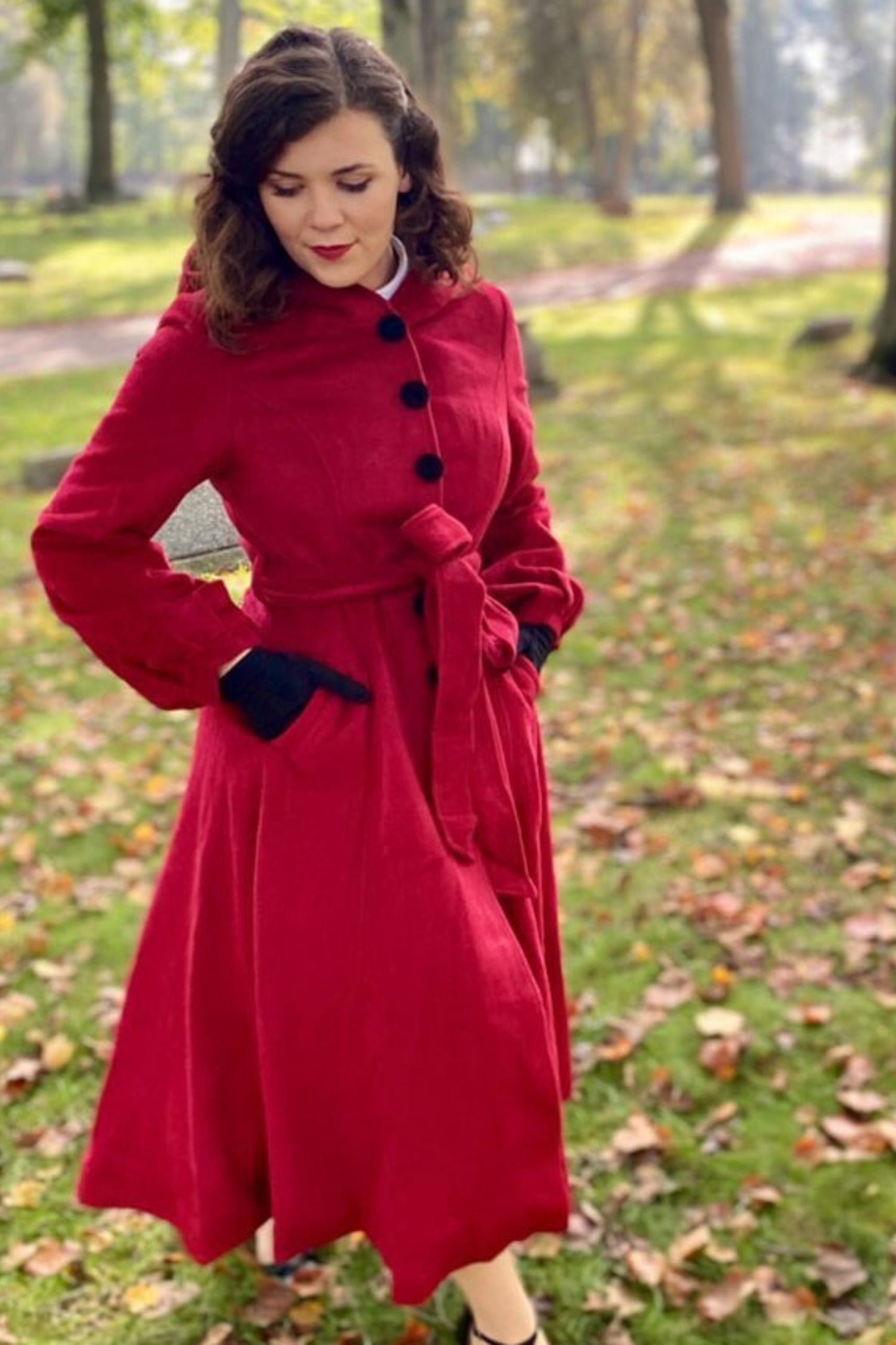 Luxuriously warm and effortlessly chic, this coat boasts a cozy wool-blend fabric, removable tie-waist belt, and handy side pockets. The fit-and-flare silhouette flatters, while the long sleeves, generous hood, and button front closure keep out the chill. Perfect for adding festive flair to any winter outfit.