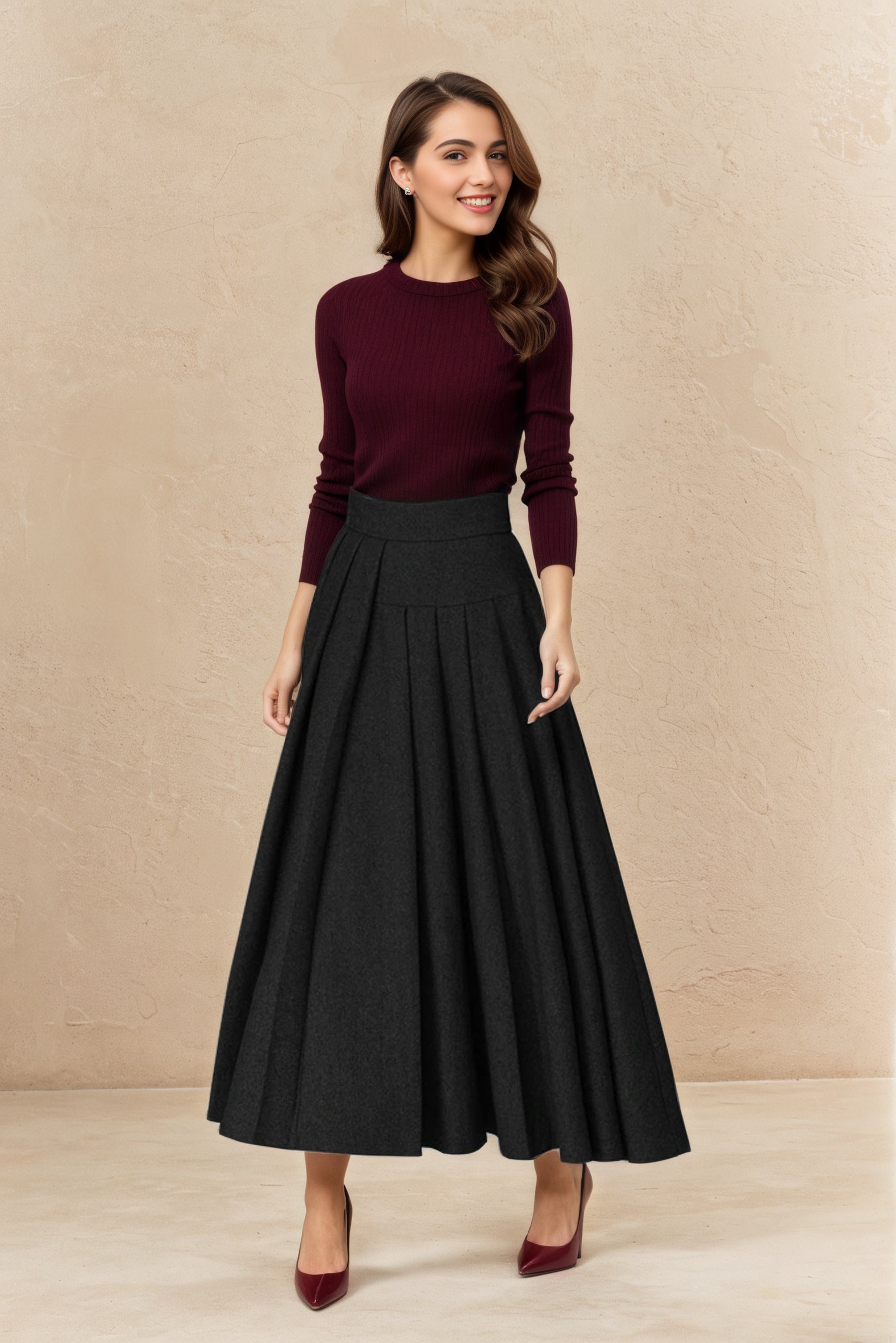 Embrace understated sophistication with this handmade black wool midi skirt, featuring a structured A-line silhouette and a subtle irregular hem for modern movement. Crafted from a premium wool blend and fully lined for comfort, it offers warmth and refinement for colder seasons. Whether styled with a fitted turtleneck or soft knit sweater, this skirt brings timeless elegance to your autumn and winter wardrobe.