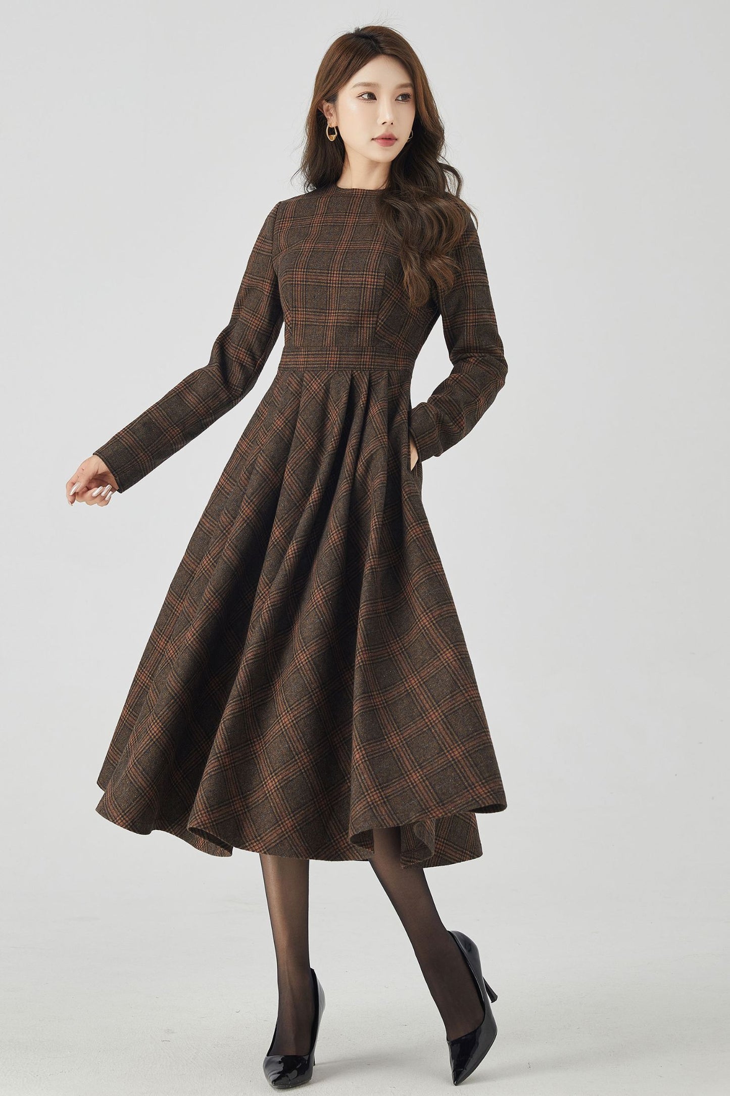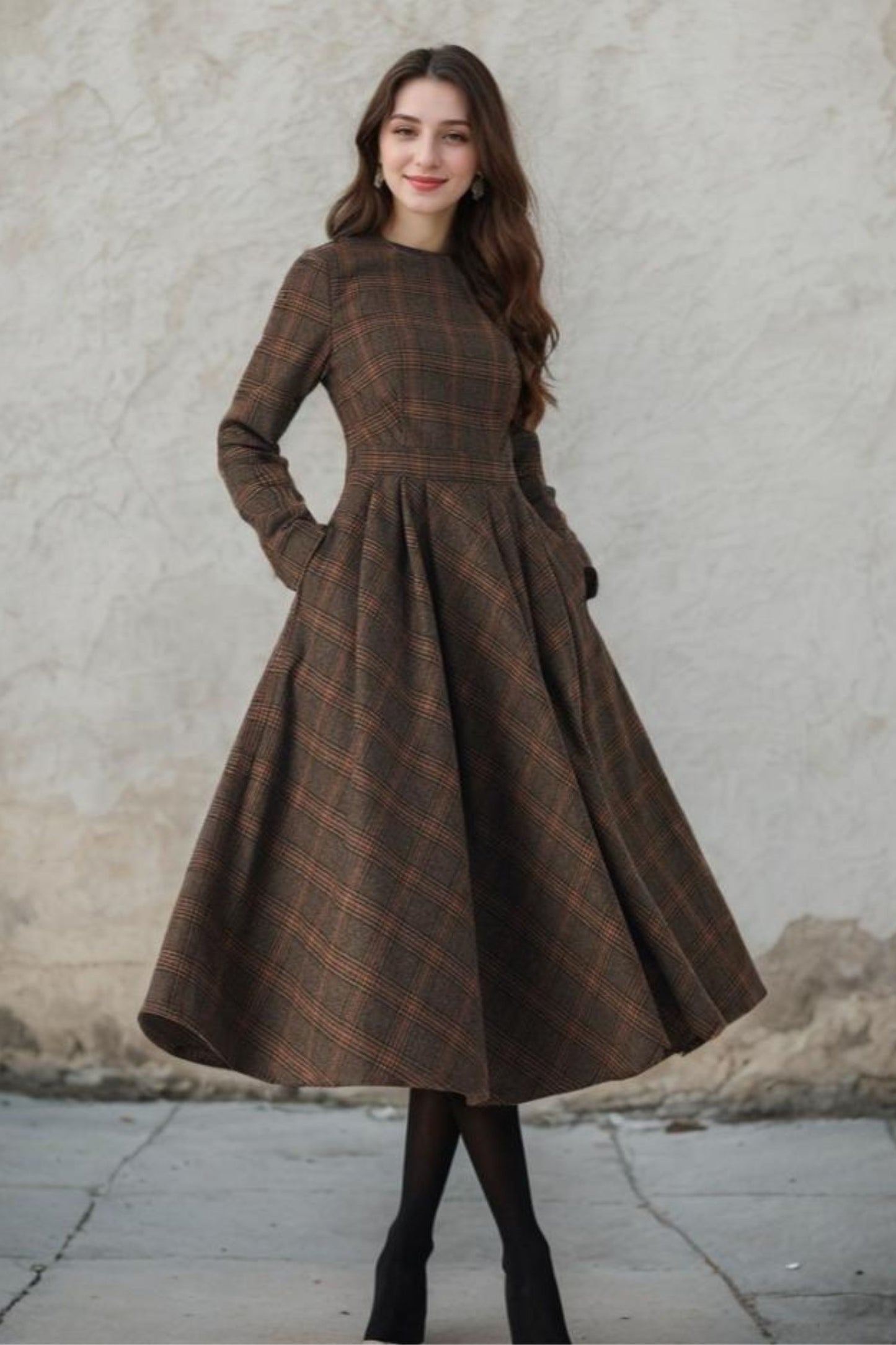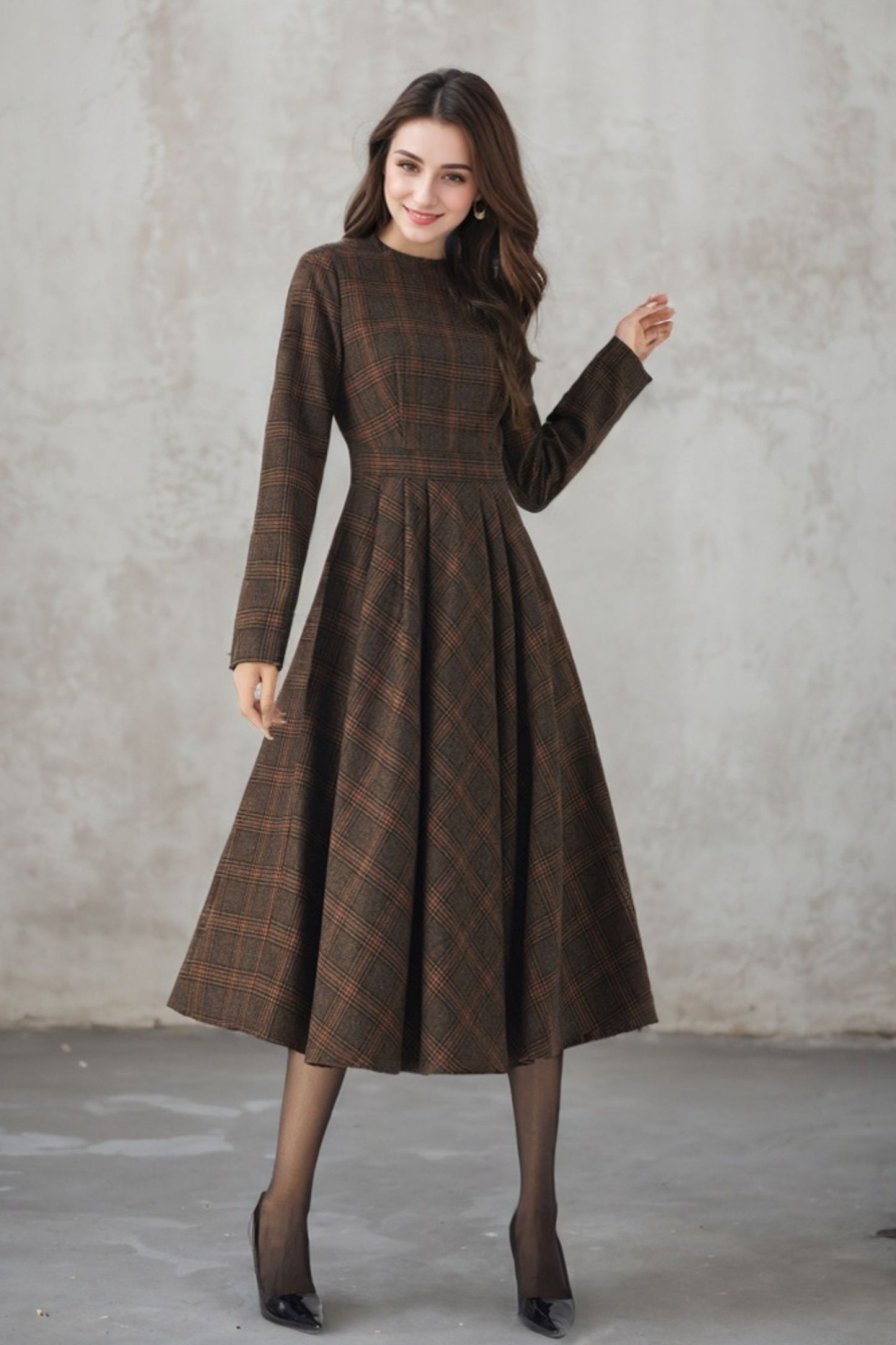 This dress combines classic charm with modern style. The long sleeves provide warmth and elegance, while the high-quality wool fabric ensures both comfort and durability. The plaid pattern adds a touch of sophistication. Perfect for any occasion, our plaid wool long sleeve dress is a versatile and stylish addition to your wardrobe.