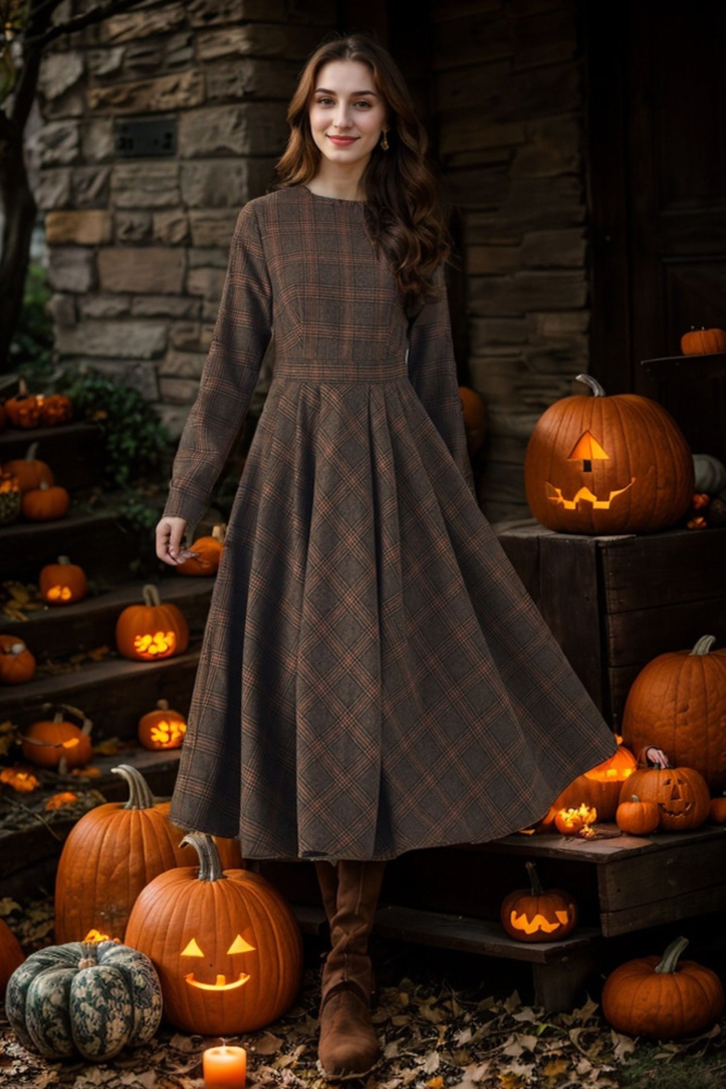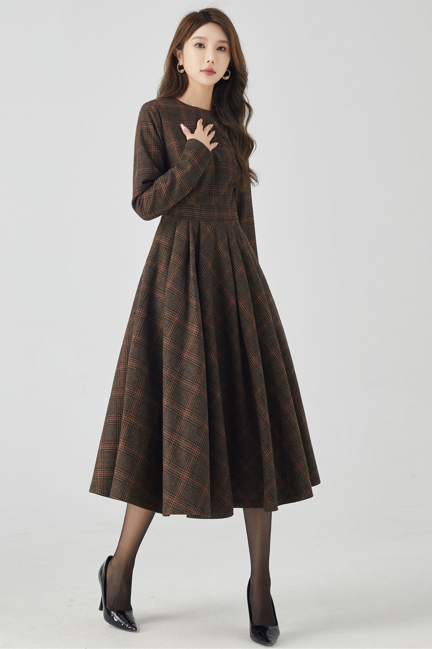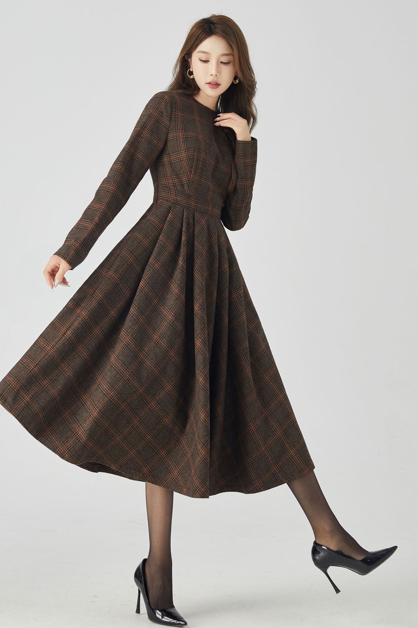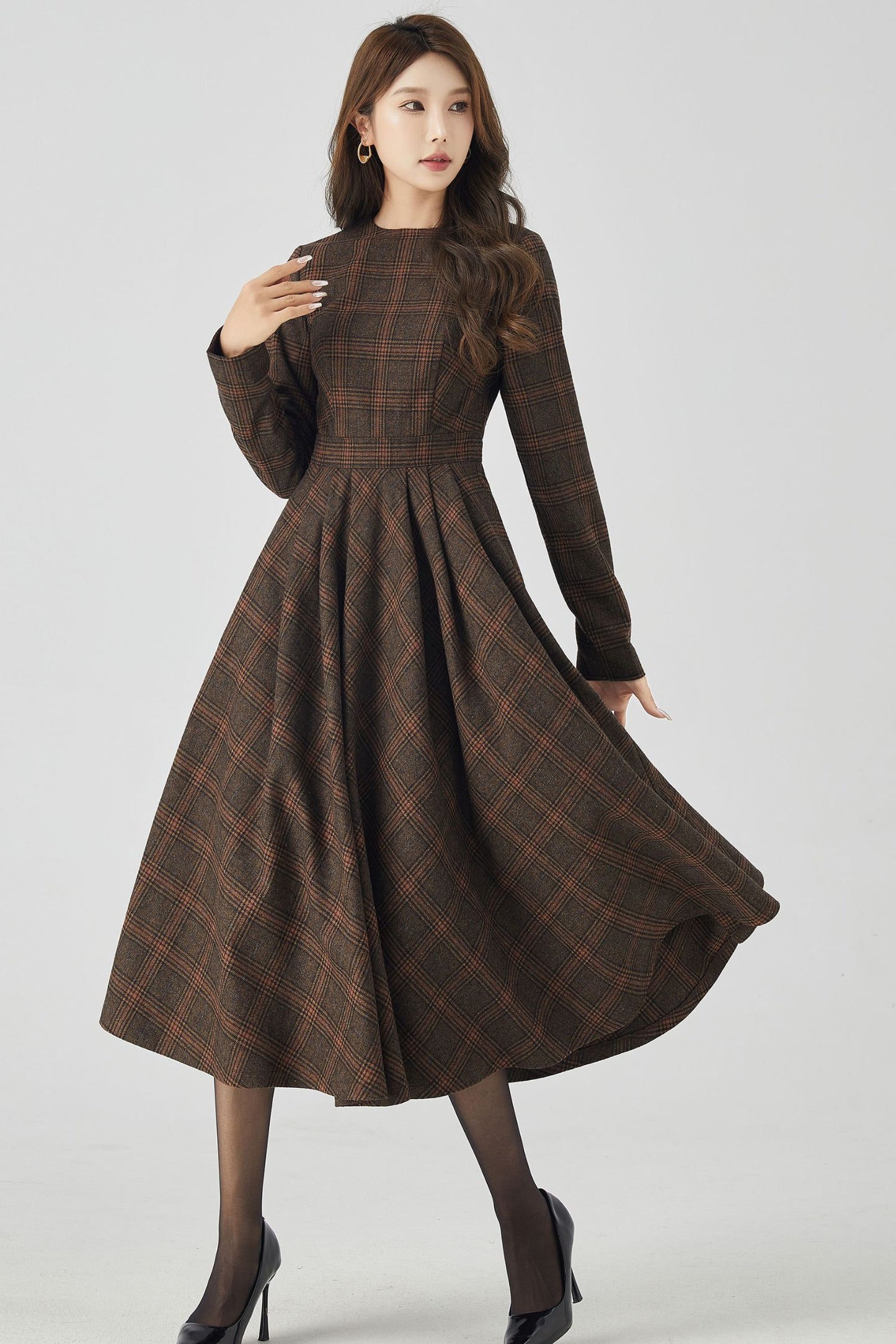 This dress combines classic charm with modern style. The long sleeves provide warmth and elegance, while the high-quality wool fabric ensures both comfort and durability. The plaid pattern adds a touch of sophistication. Perfect for any occasion, our plaid wool long sleeve dress is a versatile and stylish addition to your wardrobe.