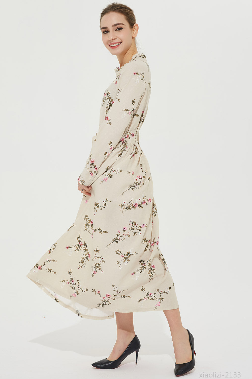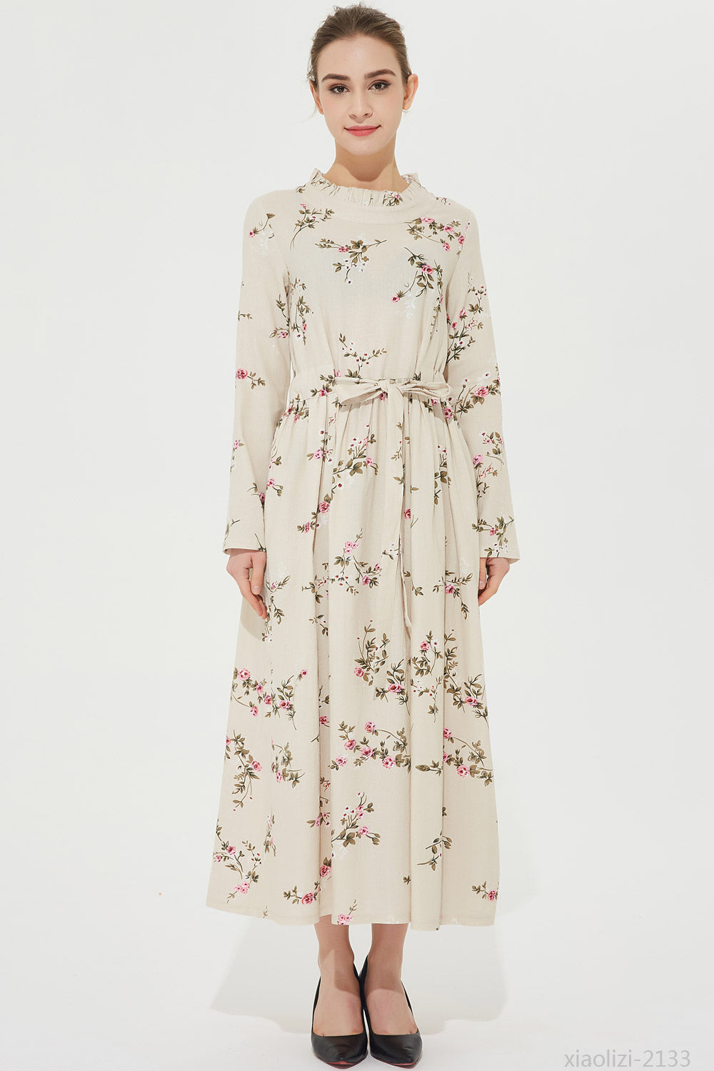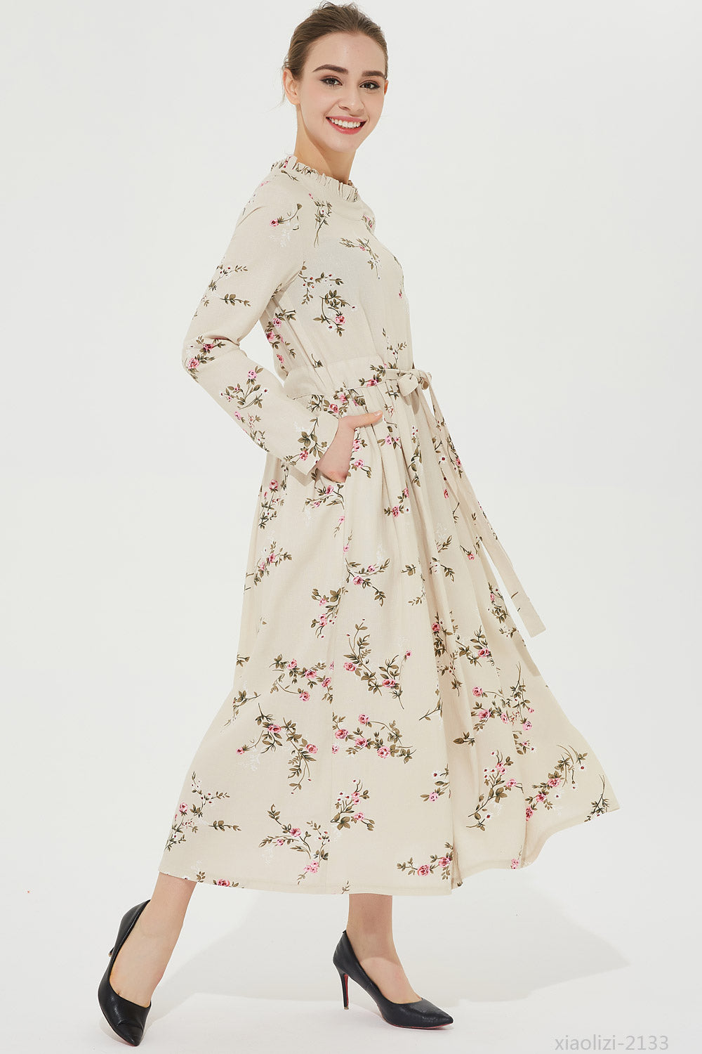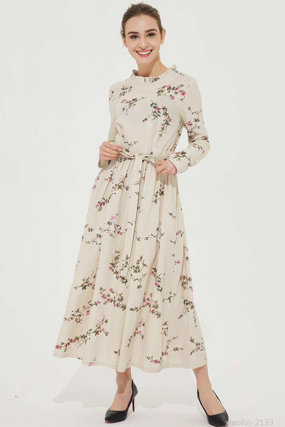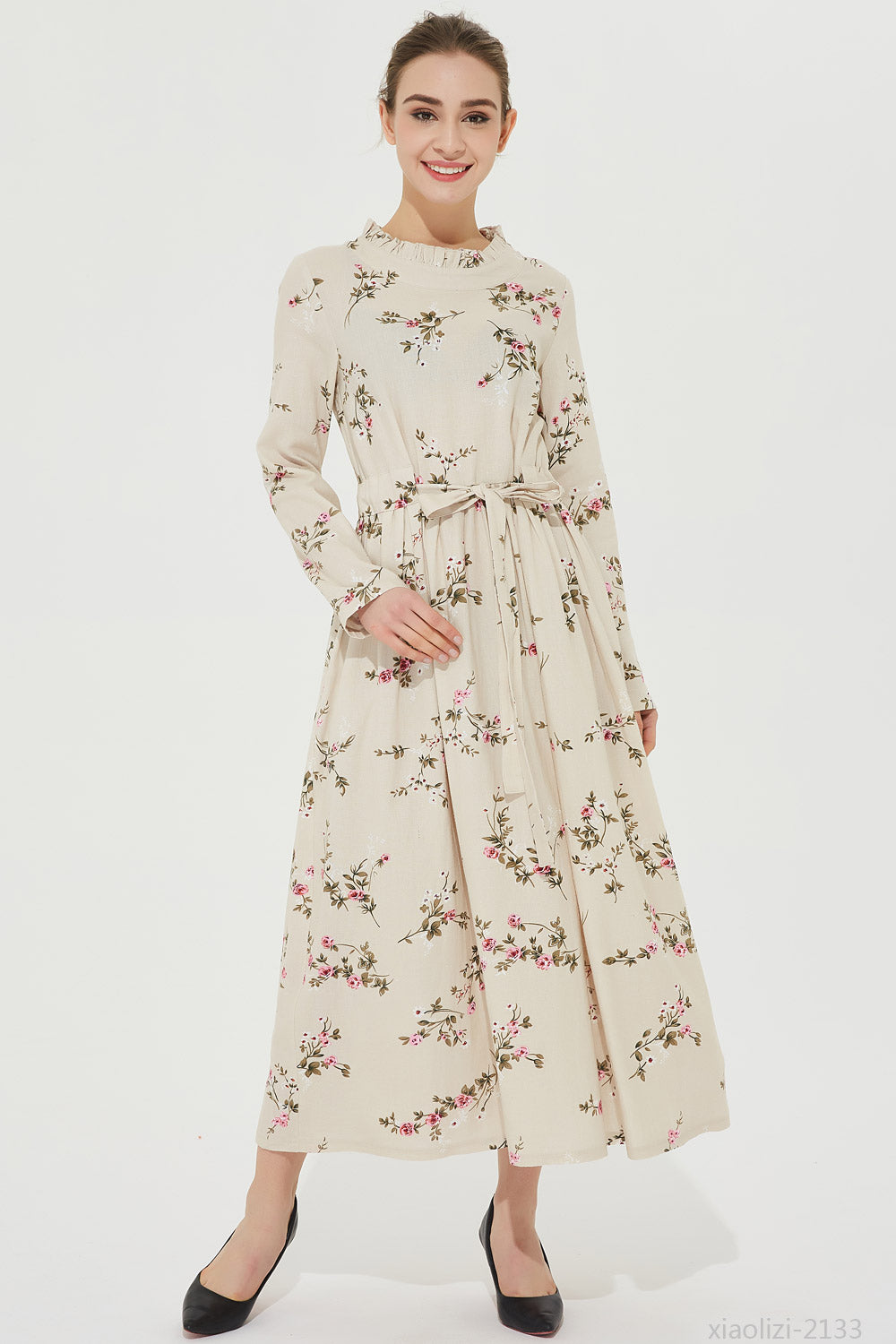 The long linen dress is in beautiful condition for Spring. The vintage women dress is made of soft linen with a beige floral print, with a high collar and long sleeves. The waist can be adjusted by the drawstring. the casual dress has two side seam pockets. The handmade dress can be wear for party, holidays, picnic and for any kind of occasion!