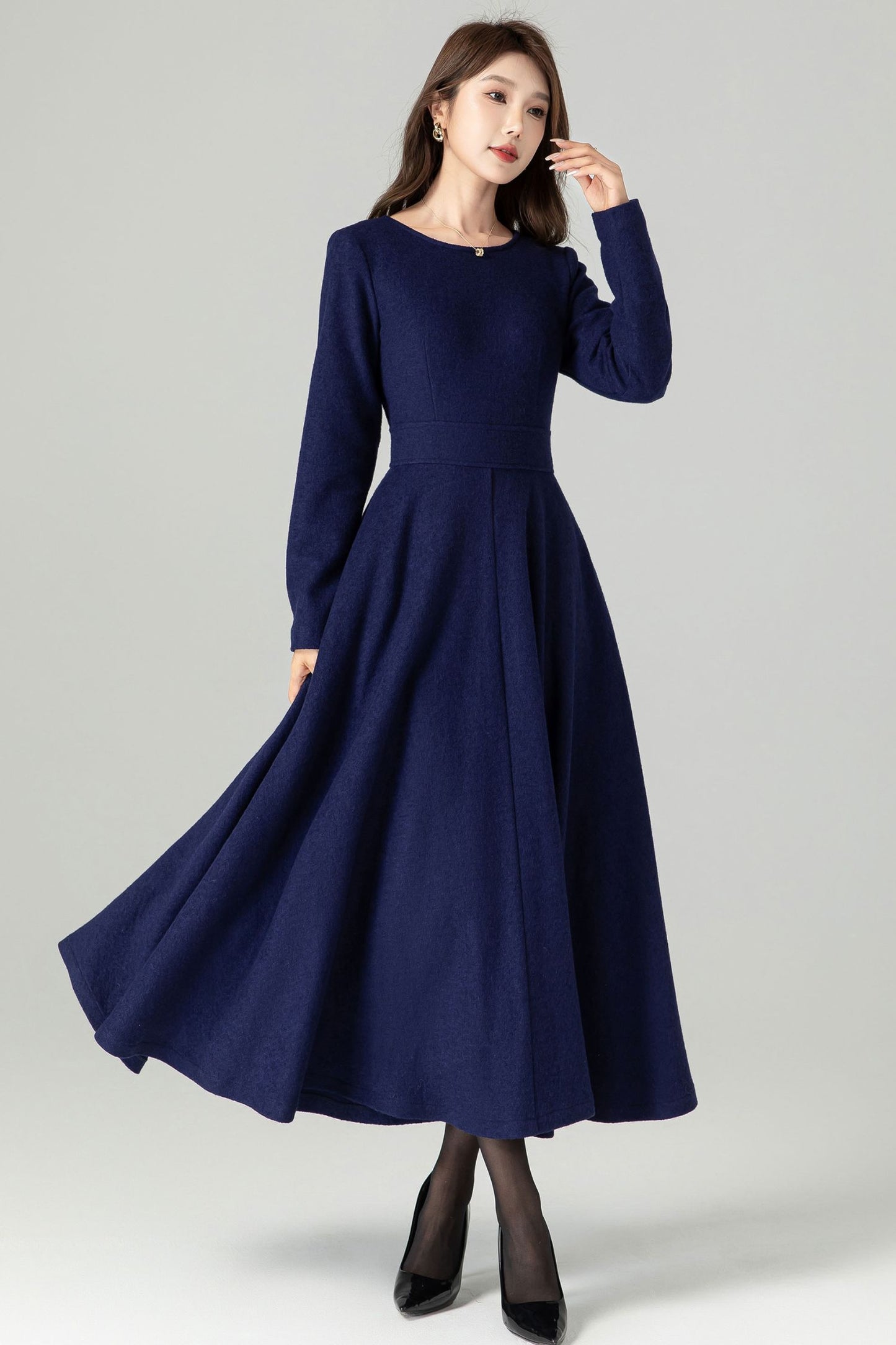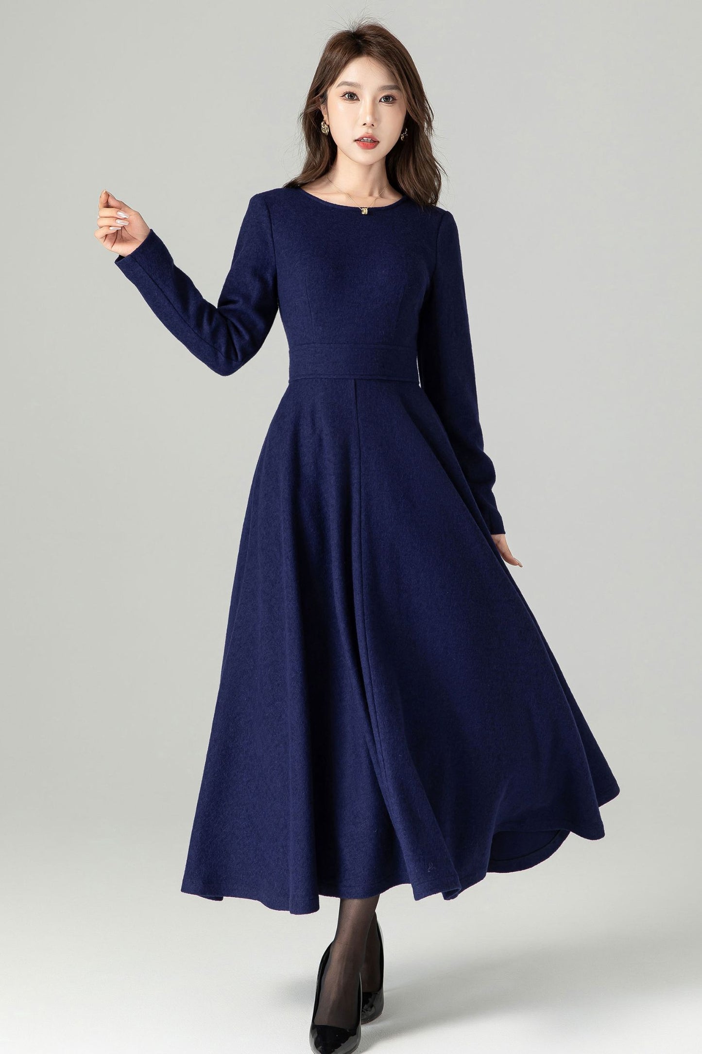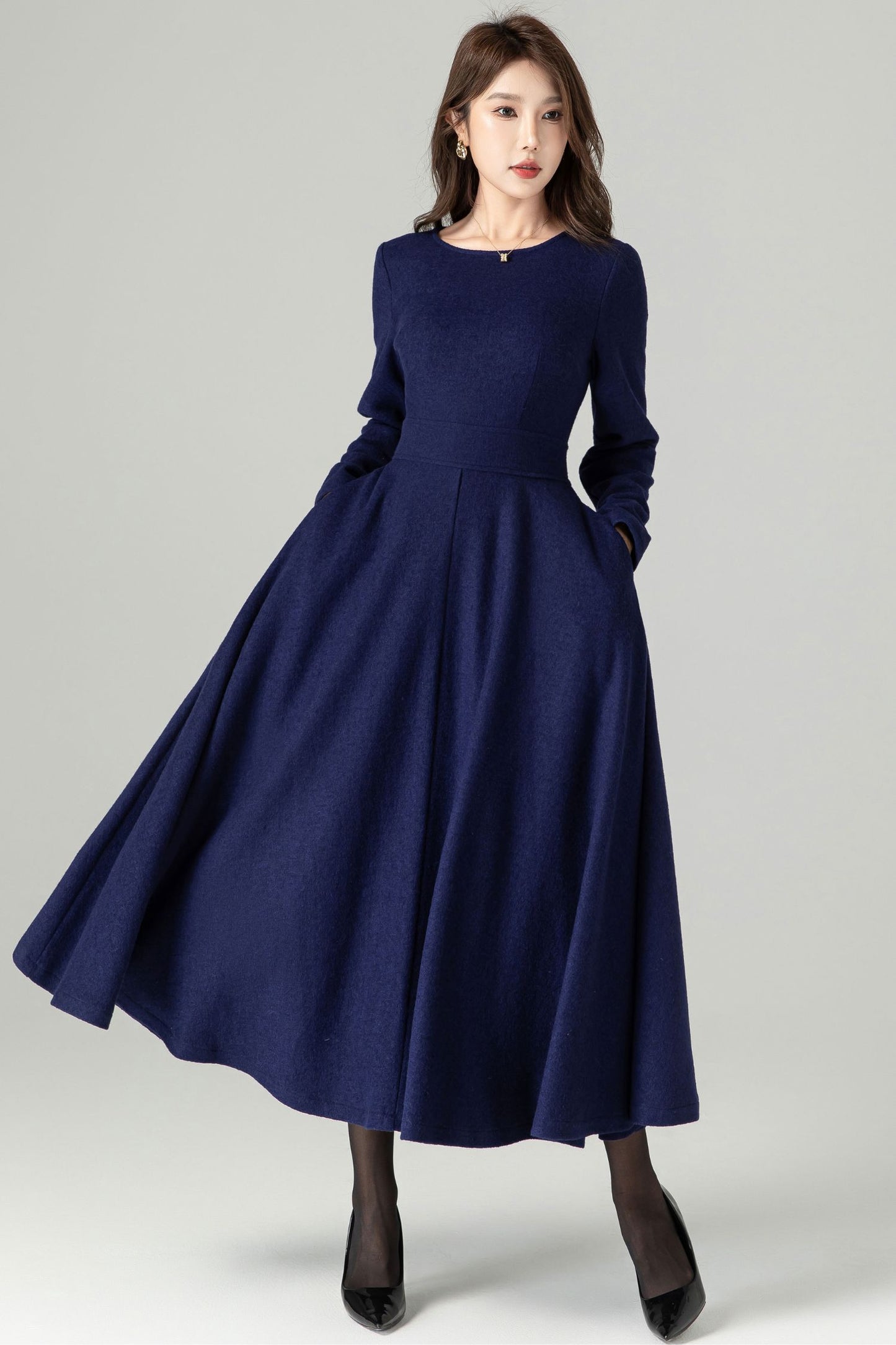 Step into timeless elegance with this handmade navy blue wool blend dress. Designed with a flattering fit-and-flare silhouette, long sleeves, and a graceful midi length, it offers both warmth and sophistication for the cooler months. The satiny lining ensures comfort, while the rich navy hue adds a refined touch—perfect for winter gatherings, city strolls, or elegant evenings.