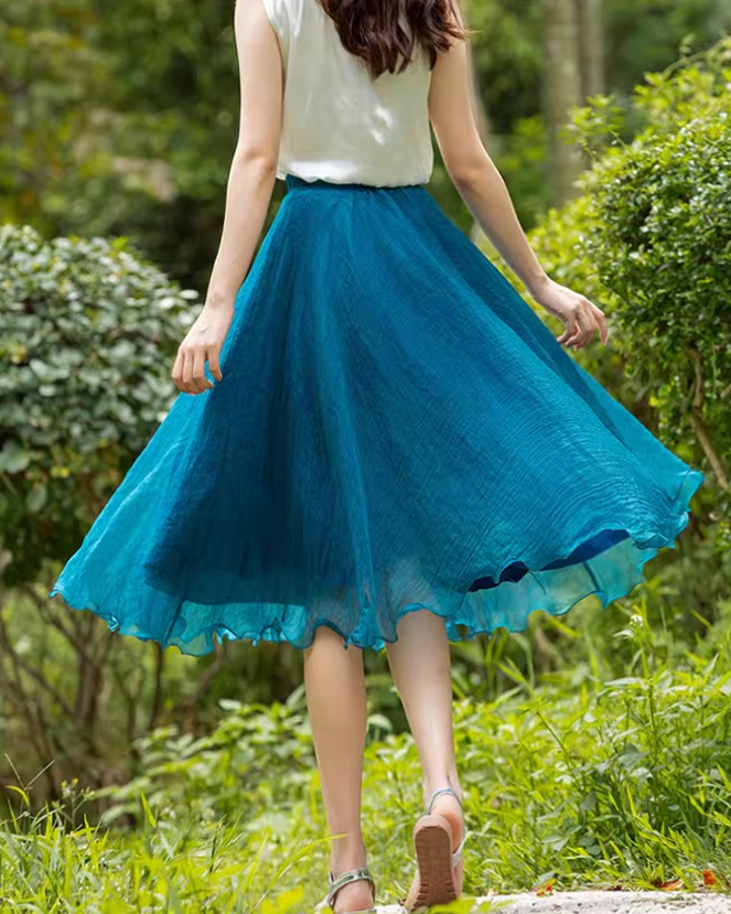This midi skirt features a lightweight chiffon fabric and an elastic waistband, offering both comfort and a flattering fit. Its breathable material makes it ideal for warm summer days, while the elegant blue hue adds a versatile touch suitable for various occasions. Perfect for effortless style with a professional finish.