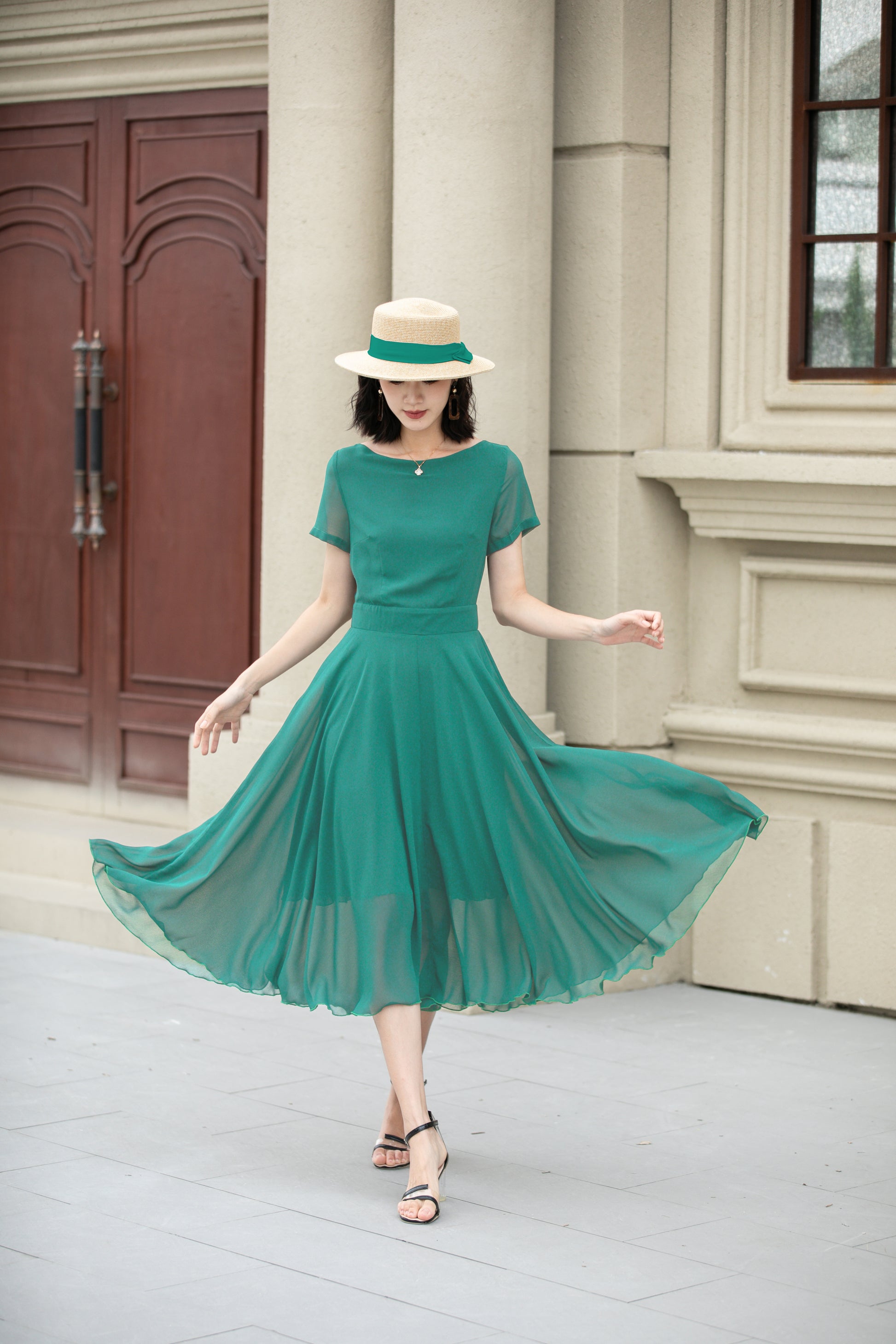 It boasts a verdant green hue that captures the eye with its richness and depth. The fabric’s sheer, lightweight nature lends the dress a delicate and airy feel, perfect for a breezy day or a refined evening event.
